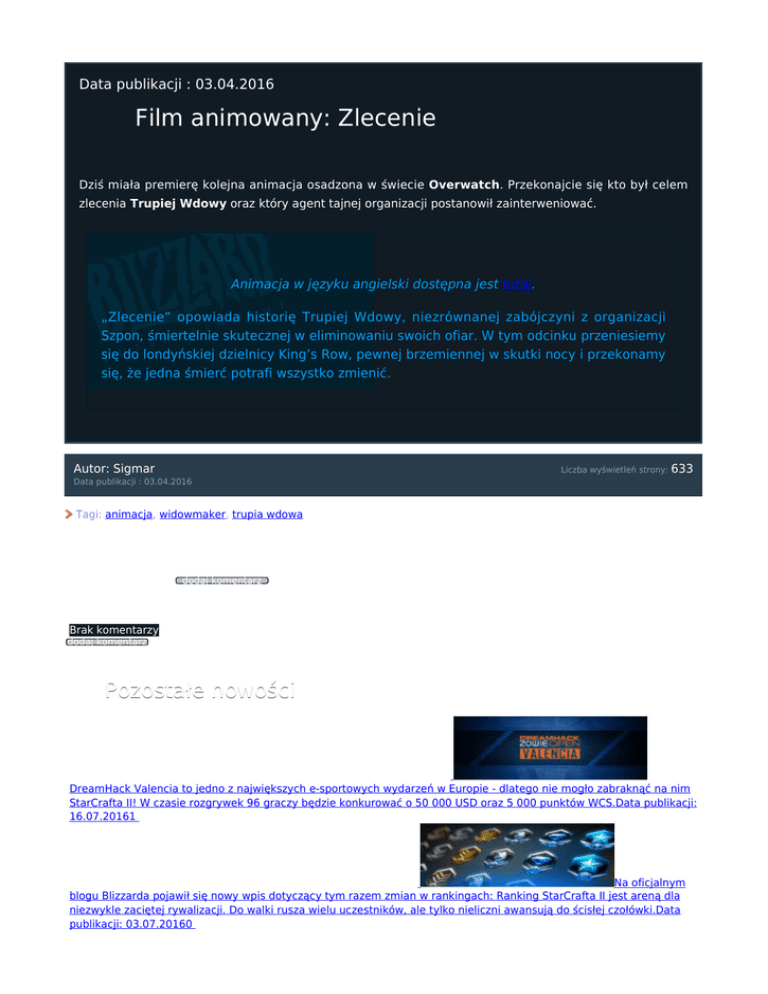 Data publikacji : 03.04.2016 Film animowany: Zlecenie Dziś miała premierę kolejna animacja osadzona w świecie Overwatch. Przekonajcie się kto był celem zlecenia Trupiej Wdowy oraz który agent tajnej organizacji postanowił zainterweniować. Animacja w języku angielski dostępna jest tutaj. „Zlecenie” opowiada historię Trupiej Wdowy, niezrównanej zabójczyni z organizacji Szpon, śmiertelnie skutecznej w eliminowaniu swoich ofiar. W tym odcinku przeniesiemy się do londyńskiej dzielnicy King’s Row, pewnej brzemiennej w skutki nocy i przekonamy się, że jedna śmierć potrafi wszystko zmienić. Autor: Sigmar Liczba wyświetleń strony: 633 Data publikacji : 03.04.2016 Tagi: animacja, widowmaker, trupia wdowa Komentarz (0) dodaj komentarz Brak komentarzy dodaj komentarz Pozostałe nowości DreamHack Open: Valencia 2016 - Nerchio w półfinale - live! DreamHack Valencia to jedno z największych e-sportowych wydarzeń w Europie - dlatego nie mogło zabraknąć na nim StarCrafta II! W czasie rozgrywek 96 graczy będzie konkurować o 50 000 USD oraz 5 000 punktów WCS.Data publikacji: 16.07.20161 Aktualizacja 3.4 – Duże zmiany w rankingu StarCrafta II Na oficjalnym blogu Blizzarda pojawił się nowy wpis dotyczący tym razem zmian w rankingach: Ranking StarCrafta II jest areną dla niezwykle zaciętej rywalizacji. Do walki rusza wielu uczestników, ale tylko nieliczni awansują do ścisłej czołówki.Data publikacji: 03.07.20160 Rozpoczęcie trzeciego sezonu rankingowego 2016 Trzeci sezon tegorocznych rozgrywek ligowych w StarCrafta II uważamy za otwarty! Zresetowano pulę punktów premiowych oraz rankingi i przyznano nagrody za sezon drugi roku 2016.Data publikacji: 26.06.20160 Filmowy „Warcraft” już wkrótce w księgarniach! Powieść „Warcraft”, której wydanie zbiega się z polską premierą filmu „Warcraft. Początek” w reżyserii Duncana Jonesa, do księgarń trafi już 15 czerwca. Na kartach książki czytelnicy wkroczą w nowy wymiar emocji towarzyszących bohaterom fikcyjnych światów Azeroth i Draenor. Za sprawą Christie Golden, pisarki od lat cenionej przez fanów świata Warcraft, konflikt ludzi i orków nabierze jeszcze większej intensywności.Data publikacji: 13.06.20160 Blokada obecnego sezonu i darmowa zmiana nazwy postaci Jak czytamy na oficjalnym blogu Blizzarda: Obecny sezon rankingowy zbliża się ku końcowi i wkrótce zamknięte zostaną wszystkie ligi i dywizje. Kilka dni przed rozpoczęciem nowego sezonu, darmowa zmiana nazwy postaci w StarCraft II zostanie ponownie dodana do wszystkich kont, dla których funkcja ta nie jest obecnie dostępna.Data publikacji: 12.06.20160 Wszystkie nowości