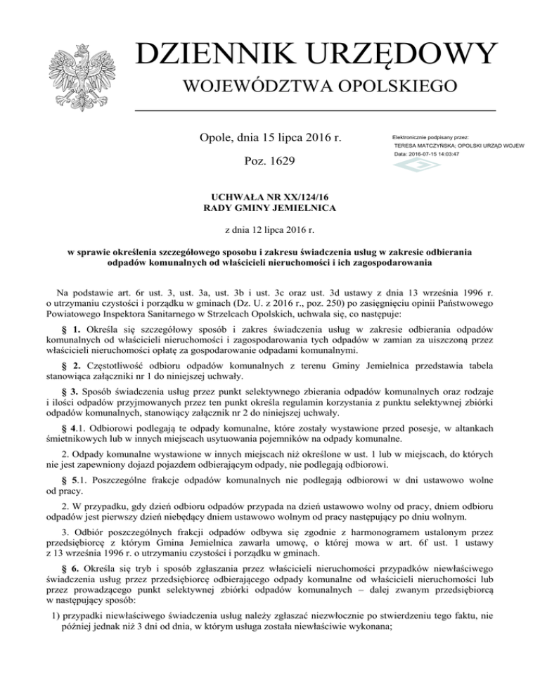 DZIENNIK URZĘDOWY WOJEWÓDZTWA OPOLSKIEGO Opole, dnia 15 lipca 2016 r. Elektronicznie podpisany przez: TERESA MATCZYŃSKA; OPOLSKI URZĄD WOJEWÓDZKI Poz. 1629 Data: 2016-07-15 14:03:47 UCHWAŁA NR XX/124/16 RADY GMINY JEMIELNICA z dnia 12 lipca 2016 r. w sprawie określenia szczegółowego sposobu i zakresu świadczenia usług w zakresie odbierania odpadów komunalnych od właścicieli nieruchomości i ich zagospodarowania Na podstawie art. 6r ust. 3, ust. 3a, ust. 3b i ust. 3c oraz ust. 3d ustawy z dnia 13 września 1996 r. o utrzymaniu czystości i porządku w gminach (Dz. U. z 2016 r., poz. 250) po zasięgnięciu opinii Państwowego Powiatowego Inspektora Sanitarnego w Strzelcach Opolskich, uchwala się, co następuje: § 1. Określa się szczegółowy sposób i zakres świadczenia usług w zakresie odbierania odpadów komunalnych od właścicieli nieruchomości i zagospodarowania tych odpadów w zamian za uiszczoną przez właścicieli nieruchomości opłatę za gospodarowanie odpadami komunalnymi. § 2. Częstotliwość odbioru odpadów komunalnych z terenu Gminy Jemielnica przedstawia tabela stanowiąca załączniki nr 1 do niniejszej uchwały. § 3. Sposób świadczenia usług przez punkt selektywnego zbierania odpadów komunalnych oraz rodzaje i ilości odpadów przyjmowanych przez ten punkt określa regulamin korzystania z punktu selektywnej zbiórki odpadów komunalnych, stanowiący załącznik nr 2 do niniejszej uchwały. § 4.1. Odbiorowi podlegają te odpady komunalne, które zostały wystawione przed posesje, w altankach śmietnikowych lub w innych miejscach usytuowania pojemników na odpady komunalne. 2. Odpady komunalne wystawione w innych miejscach niż określone w ust. 1 lub w miejscach, do których nie jest zapewniony dojazd pojazdem odbierającym odpady, nie podlegają odbiorowi. § 5.1. Poszczególne frakcje odpadów komunalnych nie podlegają odbiorowi w dni ustawowo wolne od pracy. 2. W przypadku, gdy dzień odbioru odpadów przypada na dzień ustawowo wolny od pracy, dniem odbioru odpadów jest pierwszy dzień niebędący dniem ustawowo wolnym od pracy następujący po dniu wolnym. 3. Odbiór poszczególnych frakcji odpadów odbywa się zgodnie z harmonogramem ustalonym przez przedsiębiorcę z którym Gmina Jemielnica zawarła umowę, o której mowa w art. 6f ust. 1 ustawy z 13 września 1996 r. o utrzymaniu czystości i porządku w gminach. § 6. Określa się tryb i sposób zgłaszania przez właścicieli nieruchomości przypadków niewłaściwego świadczenia usług przez przedsiębiorcę odbierającego odpady komunalne od właścicieli nieruchomości lub przez prowadzącego punkt selektywnej zbiórki odpadów komunalnych – dalej zwanym przedsiębiorcą w następujący sposób: 1) przypadki niewłaściwego świadczenia usług należy zgłaszać niezwłocznie po stwierdzeniu tego faktu, nie później jednak niż 3 dni od dnia, w którym usługa została niewłaściwie wykonana; Dziennik Urzędowy Województwa Opolskiego –2– Poz. 1629 2) zgłoszenia należy kierować do Urzędu Gminy Jemielnica, Referat Inwestycji, Rozwoju i Ochrony Środowiska, ul. Strzelecka 67, pokój nr 8, zwanym dalej referatem, osobiści, telefonicznie na nr 77 46-23-513, 77-46-23-518, pisemnie za pośrednictwem poczty tradycyjnej lub elektronicznej na adres: [email protected]; 3) referat niezwłocznie, nie później jednak niż w ciągu 2 dni od dnia otrzymanego zgłoszenia, zgłasza przedsiębiorcy reklamację, wskazując nienależyte wykonanie usługi na danej nieruchomości; 4) przedsiębiorca dokonuje odbioru reklamacyjnego lub niezwłocznie kontaktuje się ze zgłaszającym ustalając z nim dogodny dla każdej ze stron termin odbioru. § 7. Traci moc uchwała nr XXVIII/190/13 Rady Gminy Jemielnica z dnia 29 maja 2013 r. w sprawie określenia szczegółowego sposobu i zakresu świadczenia usług w zakresie odbierania odpadów komunalnych od właścicieli nieruchomości i ich zagospodarowania (Dz. Urz. Woj. Opolskiego z 2013 r. poz. 1393). § 8. Wykonanie uchwały powierza się Wójtowi Jemielnicy. § 9. Uchwała wchodzi w życie po upływie 14 dni od dnia jej ogłoszenia w Dzienniku Urzędowym Województwa Opolskiego. Przewodniczący Rady Gminy Antoni Drzyzga Dziennik Urzędowy Województwa Opolskiego –3– Poz. 1629 Załącznik nr 1 do uchwały nr XX/124/16 Rady Gminy Jemielnica z dnia 12 lipca 2016 r. Częstotliwość odbioru odpadów komunalnych z terenu Gminy Jemielnica Rodzaj odpadów komunalnych zbieranych selektywnie Komunalne odpady zmieszane Szkło Papier, tworzywa sztuczne, metale, opakowania wielomateriałowe Popiół Odpady biodegradowalne Zużyty sprzęt elektryczny i elektroniczny Odpady wielkogabarytowe Częstotliwość odbierania Sposób odbioru W sezonie letnim W sezonie zimowym Pojemniki, w tym worki bezpośrednio od mieszkańców nieruchomości Pojemniki, w tym worki bezpośrednio od mieszkańców Nie rzadziej niż raz na dwa tygodnie Nie rzadziej niż raz na dwa tygodnie Nie rzadziej niż raz na dwa miesiące Nie rzadziej niż raz na dwa miesiące Pojemniki, w tym worki bezpośrednio od mieszkańców Nie rzadziej niż raz na dwa miesiące Nie rzadziej niż raz na dwa miesiące Pojemniki bezpośrednio od mieszkańców nieruchomości Pojemniki, w tym worki bezpośrednio od mieszkańców „wystawka” bezpośrednio od mieszkańców „wystawka” bezpośrednio od mieszkańców Nie rzadziej niż raz na dwa miesiące Nie rzadziej niż raz na dwa tygodnie Nie rzadziej niż raz na dwa tygodnie Nie rzadziej niż raz w miesiącu Dwa razy w roku Dwa razy w roku Dziennik Urzędowy Województwa Opolskiego –4– Poz. 1629 Załącznik nr 2 do uchwały nr XX/124/16 Rady Gminy Jemielnica z dnia 12 lipca 2016 r. REGULAMIN KORZYSTANIA Z PUNKTU SELEKTYWNEGO ZBIERANIA ODPADÓW KOMUNALNYCH (PSZOK) zlokalizowanego na terenie Gminy Strzelce Opolskie § 1.1. Regulamin określa szczegółowe zasady funkcjonowania Punktu Selektywnego Zbierania Opadów Komunalnych położonego 