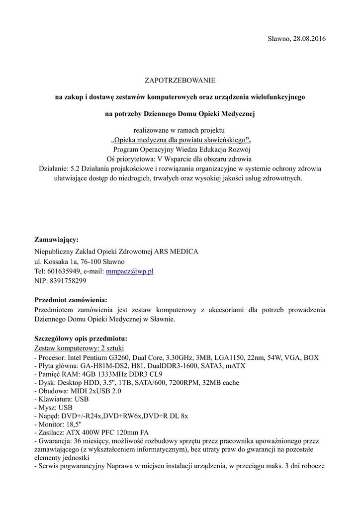 Sławno, 28.08.2016 ZAPOTRZEBOWANIE na zakup i dostawę zestawów komputerowych oraz urządzenia wielofunkcyjnego na potrzeby Dziennego Domu Opieki Medycznej realizowane w ramach projektu „Opieka medyczna dla powiatu sławieńskiego”. Program Operacyjny Wiedza Edukacja Rozwój Oś priorytetowa: V Wsparcie dla obszaru zdrowia Działanie: 5.2 Działania projakościowe i rozwiązania organizacyjne w systemie ochrony zdrowia ułatwiające dostęp do niedrogich, trwałych oraz wysokiej jakości usług zdrowotnych. Zamawiający: Niepubliczny Zakład Opieki Zdrowotnej ARS MEDICA ul. Kossaka 1a, 76-100 Sławno Tel: 601635949, e-mail: [email protected] NIP: 8391758299 Przedmiot zamówienia: Przedmiotem zamówienia jest zestaw komputerowy z akcesoriami dla potrzeb prowadzenia Dziennego Domu Opieki Medycznej w Sławnie. Szczegółowy opis przedmiotu: Zestaw komputerowy: 2 sztuki - Procesor: Intel Pentium G3260, Dual Core, 3.30GHz, 3MB, LGA1150, 22nm, 54W, VGA, BOX - Płyta główna: GA-H81M-DS2, H81, DualDDR3-1600, SATA3, mATX - Pamięć RAM: 4GB 1333MHz DDR3 CL9 - Dysk: Desktop HDD, 3.5'', 1TB, SATA/600, 7200RPM, 32MB cache - Obudowa: MIDI 2xUSB 2.0 - Klawiatura: USB - Mysz: USB - Napęd: DVD+/-R24x,DVD+RW6x,DVD+R DL 8x - Monitor: 18,5'' - Zasilacz: ATX 400W PFC 120mm FA - Gwarancja: 36 miesięcy, możliwość rozbudowy sprzętu przez pracownika upoważnionego przez zamawiającego (z wykształceniem informatycznym), bez utraty praw do gwarancji na pozostałe elementy jednostki - Serwis pogwarancyjny Naprawa w miejscu instalacji urządzenia, w przeciągu maks. 3 dni robocze od zgłoszenia usterki, w sytuacji poważnego uszkodzenia naprawa w terminie uzgodnionym przez obie strony. Urządzenie wielofunkcyjne: – drukarka – kserokopiarka – skaner – duplex – okres gwarancji: 36 m-cy Termin realizacji: 07-09.09.2016 Termin składania: Oferty cenowe za 1 zestaw komputerowy wraz z opisem parametrów oraz urządzenie wielofunkcyjne proszę składać w Przychodni lekarskiej NZOZ Ars Medica przy ul. Koszalińskiej 4, 76-100 Sławno osobiście, pocztą, kurierem lub drogą elektroniczną na adres: [email protected] do dnia 06.09.2016r. Właściciel NZOZ Ars Medica Mariusz Paczkowski