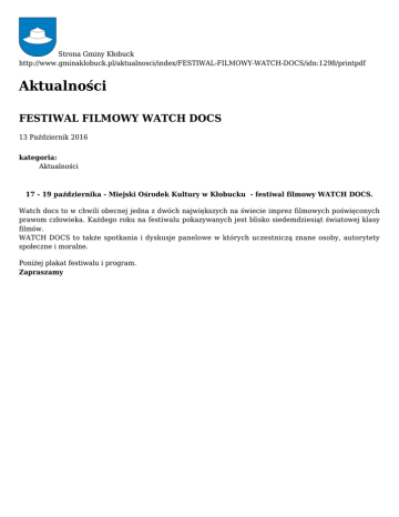 Strona Gminy Kłobuck http://www.gminaklobuck.pl/aktualnosci/index/FESTIWAL-FILMOWY-WATCH-DOCS/idn:1298/printpdf Aktualności FESTIWAL FILMOWY WATCH DOCS 13 Październik 2016 kategoria: Aktualności 17 - 19 października - Miejski Ośrodek Kultury w Kłobucku - festiwal filmowy WATCH DOCS. Watch docs to w chwili obecnej jedna z dwóch największych na świecie imprez filmowych poświęconych prawom człowieka. Każdego roku na festiwalu pokazywanych jest blisko siedemdziesiąt światowej klasy filmów. WATCH DOCS to także spotkania i dyskusje panelowe w których uczestniczą znane osoby, autorytety społeczne i moralne. Poniżej plakat festiwalu i program. Zapraszamy kategoria: Powiązane pliki [2] Nazwa pliku Data publikacji Rozmiar Pobierz jpg Plakat pobierz 16-10-13 09:40 116.82KB plik: Plakat jpg Program pobierz 16-10-13 09:40 150.62KB plik: Program powrót do listy aktualności poprzednia następna