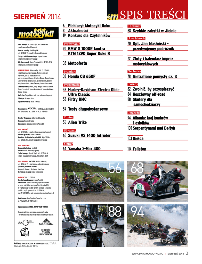 SIERPIEŃ 2014 6 Plebiscyt Motocykl Roku 8 Aktualności 19 Konkurs dla Czytelników Adres redakcji: ul. Czerska 8/10, 00-732 Warszawa, e-mail: [email protected] Redaktor naczelny: Lech Potyński, tel.: 22 555 67 95, e-mail: [email protected] Zastępca redaktora naczelnego: Szymon Dziawer, e-mail: [email protected] Sekretarz redakcji: Jacek Pieśniewski, tel.: 22 555 67 94, e-mail: [email protected] 20 BMW S 1000R kontra KTM 1290 Super Duke R zzvvsssssssss 32 Motooferta 38 Honda CB 650F Stale współpracują: Piotr „Barry” Baryła, Marek Harasimiuk, Tomasz Szczerbicki, Tomasz Woźniakowski, Tomasz Markiewicz, Bartosz Biesaga 46 Harley-Davidson Electra Glide Fotoedytor: Grzegorz Suska Asystentka redakcji: Beata Sowińska Wydawnictwo: AGORA SA, ul. Czerska 8/10, 00-732 Warszawa, tel.: 22 555 40 00, 22 555 40 01 Dyrektor Wydawniczy: Katarzyna Kolanowska Wydawca: Mikołaj Kirschke Kierownictwo graficzne: Andrzej Przygodzki DZIAŁ SPRZEDAŻY tel.: 22 55 56 184, e-mail: [email protected] Dyrektor Sprzedaży: Elżbieta Nowacka Konsultant d/s Klientów Bezpośrednich: Kaja Paździerz, tel.: 22 55 56 267 , e-mail: [email protected] DZIAŁ MARKETINGU Kierownik Marketingu: Iza Bziuk Kontakt: e-mail: [email protected] Product manager: Urszula Strych, tel.: 22 555 63 60, e-mail: [email protected], faks: 22 555 66 64 DZIAŁ PRODUKCJI Szef działu: Monika Makowska, tel.: 22 555 66 39, e-mail: [email protected] Specjaliści przestrzeni barwnej: Małgorzata Charewicz-Mostowska, Paweł Bajer Koordynacja produkcji: Iwona Bocianowska KOLPORTAŻ tel.: 22 555 53 33 Dyrektor kolportażu prasy: Adam Popielski Prenumerata: Pytania i reklamacje prosimy kierować na adres: Dział Kolportażu Agora SA, ul. Czerska 8/10, 00-732 Warszawa, tel.: 801 130 000 (opłata za połączenie zgodnie z taryfą operatora), lub 22 555 44 00, faks: 22 555 55 59, e-mail: [email protected] Oldtimer 68 Szybkie zabytki w Jicinie A to historia 70 Kpt. Jan Masłoński - Porównanie REDAGUJE ZESPÓŁ: Katarzyna Bąk, tel.: 22 555 66 13, e-mail: [email protected], Andrzej „Simpson” Drzymulski, tel.: 22 555 66 80, e-mail: [email protected], Dariusz Dobosz, Dorota Dziawer, Erwin Gorczyca, Konrad Górski, Jacek Gradomski, Bolesław Hyła, Tomasz Sałek, Łukasz Świderek, Tomasz Tomaszewski Grafik: Ewa Żmigrodzka, e-mail: [email protected], SPIS TREŚCI przedwojenny podróżnik zzvvsssssssss 72 Zloty i kalendarz imprez motocyklowych Technika Premiera 78 Nietrafione pomysły cz. 3 Porady Prezentacja Ultra Classic 52 Filtry BMC zzvvsssssssss 54 Testy długodystansowe 82 Zwolnić, by przyspieszyć 84 Kosztowny off-road 88 Skutery dla samochodziarzy Podróże 94 Albania: kraj bunkrów Tuning 56 Alien Trike Używany 60 Suzuki VS 1400 Intruder Skuter 64 Yamaha X-Max 400 i osiołków 100 Serpentynami nad Bałtyk zzvvzvcz 103 Giełda zzvvsssvcz 114 Felieton 56 68 Druk i oprawa: Quad/Graphics Europe Sp. z o.o. ul. Pułtuska 120, 07-200 Wyszków Zdjęcie na okładce: DAREK „PAPUQ” FELIS-OBRYCKI Redakcja zastrzega sobie prawo nadawania tytułów i śródtytułów, skracania i redagowania nadesłanych tekstów. 88 94 NR 1 WŚRÓD CZASOPISM MOTOCYKLOWYCH Reklamy nieoznaczone w numerze na str.: 2, 5, 9, 11, 13, 23, 29, 41, 53, 63, 87, 113, 115 WWW.SWIATMOTOCYKLI.PL I SIERPIEŃ 2014 3