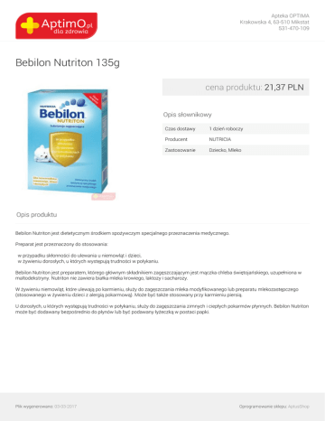 Apteka OPTIMA Krakowska 4, 63-510 Mikstat 531-470-109 Bebilon Nutriton 135g cena produktu: 21,37 PLN Opis słownikowy Czas dostawy 1 dzień roboczy Producent NUTRICIA Zastosowanie Dziecko, Mleko Opis produktu Bebilon Nutriton jest dietetycznym środkiem spożywczym specjalnego przeznaczenia medycznego. Preparat jest przeznaczony do stosowania: w przypadku skłonności do ulewania u niemowląt i dzieci, w żywieniu dorosłych, u których występują trudności w połykaniu. Bebilon Nutriton jest preparatem, którego głównym składnikiem zagęszczającym jest mączka chleba świętojańskiego, uzupełniona w maltodekstryny. Nutriton nie zawiera białka mleka krowiego, laktozy i sacharozy. W żywieniu niemowląt, które ulewają po karmieniu, służy do zagęszczania mleka modyfikowanego lub preparatu mlekozastępczego (stosowanego w żywieniu dzieci z alergią pokarmową). Może być także stosowany przy karmieniu piersią. U dorosłych, u których występują trudności w połykaniu, służy do zagęszczania zimnych i ciepłych pokarmów płynnych. Bebilon Nutriton może być dodawany bezpośrednio do płynów lub być podawany łyżeczką w postaci papki. Plik wygenerowano: 03-03-2017 Powered by TCPDF (www.tcpdf.org) Oprogramowanie sklepu: AptusShop