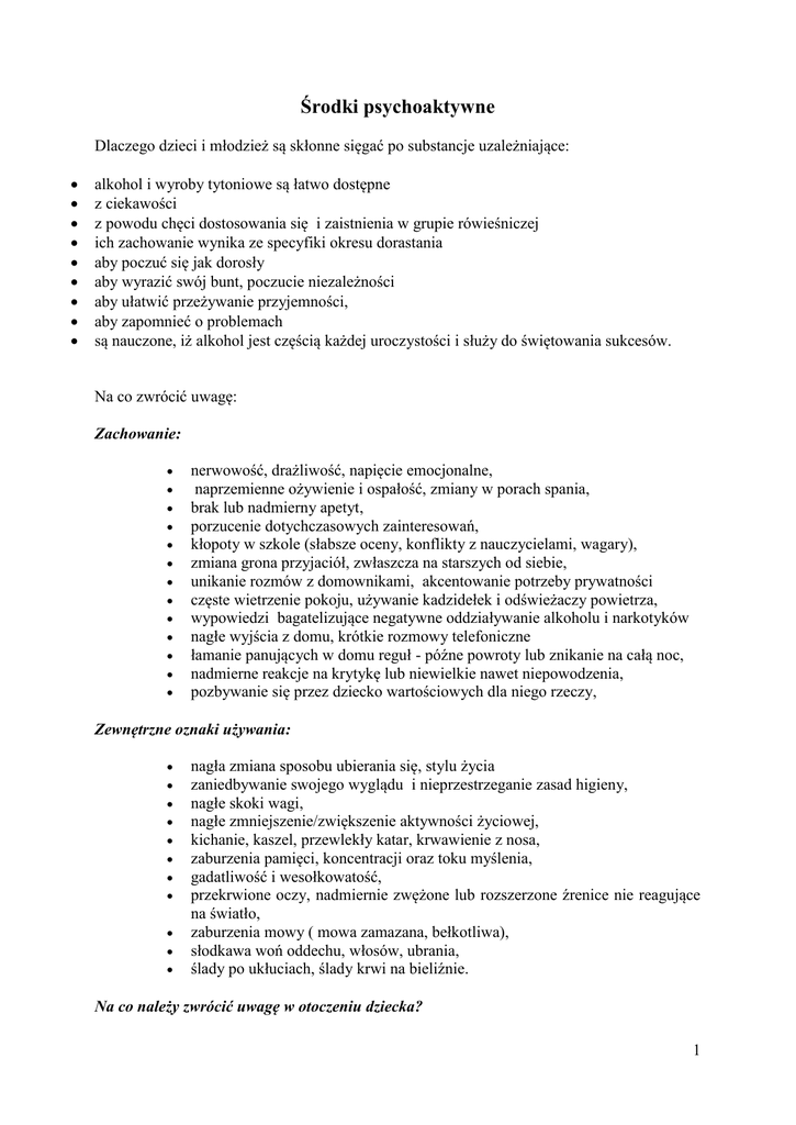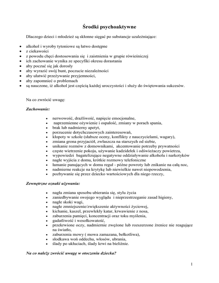 Środki psychoaktywne Dlaczego dzieci i młodzież są skłonne sięgać po substancje uzależniające: alkohol i wyroby tytoniowe są łatwo dostępne z ciekawości z powodu chęci dostosowania się i zaistnienia w grupie rówieśniczej ich zachowanie wynika ze specyfiki okresu dorastania aby poczuć się jak dorosły aby wyrazić swój bunt, poczucie niezależności aby ułatwić przeżywanie przyjemności, aby zapomnieć o problemach są nauczone, iż alkohol jest częścią każdej uroczystości i służy do świętowania sukcesów. Na co zwrócić uwagę: Zachowanie: nerwowość, drażliwość, napięcie emocjonalne, naprzemienne ożywienie i ospałość, zmiany w porach spania, brak lub nadmierny apetyt, porzucenie dotychczasowych zainteresowań, kłopoty w szkole (słabsze oceny, konflikty z nauczycielami, wagary), zmiana grona przyjaciół, zwłaszcza na starszych od siebie, unikanie rozmów z domownikami, akcentowanie potrzeby prywatności częste wietrzenie pokoju, używanie kadzidełek i odświeżaczy powietrza, wypowiedzi bagatelizujące negatywne oddziaływanie alkoholu i narkotyków nagłe wyjścia z domu, krótkie rozmowy telefoniczne łamanie panujących w domu reguł - późne powroty lub znikanie na całą noc, nadmierne reakcje na krytykę lub niewielkie nawet niepowodzenia, pozbywanie się przez dziecko wartościowych dla niego rzeczy, Zewnętrzne oznaki używania: nagła zmiana sposobu ubierania się, stylu życia zaniedbywanie swojego wyglądu i nieprzestrzeganie zasad higieny, nagłe skoki wagi, nagłe zmniejszenie/zwiększenie aktywności życiowej, kichanie, kaszel, przewlekły katar, krwawienie z nosa, zaburzenia pamięci, koncentracji oraz toku myślenia, gadatliwość i wesołkowatość, przekrwione oczy, nadmiernie zwężone lub rozszerzone źrenice nie reagujące na światło, zaburzenia mowy ( mowa zamazana, bełkotliwa), słodkawa woń oddechu, włosów, ubrania, ślady po ukłuciach, ślady krwi na bieliźnie. Na co należy zwrócić uwagę w otoczeniu dziecka? 1 opakowania po lekach tuby z klejem, chusteczki z charakterystycznym zapachem np. lakieru rurki do wdychania oparów fajki, fifki, lufki, bibułki papierosowe małe foliowe torebeczki z proszkiem, tabletkami, kryształkami lub suszem kawałki opalonej folii aluminiowej, kapsle, łyżki znaczki, białe lub kolorowe pastylki z wytłoczonymi wizerunkami i znakami leki, szczególnie te bez recepty naczynia, słoiki, pojemniki z klejem, smary Substancje psychoaktywne uzależniają na różne sposoby: zależność fizyczna – przystosowanie się organizmu do nowego stanu. Pojawia się zmieniona tolerancja organizmu na substancję. W przypadku braku przyjmowania substancji pojawia się reakcja abstynencyjna. zależność psychiczna – silne pragnienia osiągnięcia stanu odurzenia. Zmiany tolerancji i reakcja abstynencyjna nie występują lub trudniej ją stwierdzić. zależność społeczna - dotyczy młodych ludzi silnie związanych z grupą rówieśniczą. Używanie staje się aspektem przynależności do grupy. Potrzeba używania może być odczuwana podczas wchodzenia w kontakt z grupą. Aktualnie użwane środki psychoaktywne: Kodeina (nazwa handlowa: Thiocodin). Dostępny w aptekach bez recepty. Pochodna morfiny z rodziny opiatów. Pseudoefedryna (nazwa handlowa: Sudafed). To substancja, której nadużycie sprawia objawy jak po zażyciu amfetaminy, której pseudoefedryna jest pochodną. Dekstrometorfan (nazwa handlowa: Acodin) – występuje w sprzedawanych bez recepty lekach przeciwkaszlowych i przeciwprzeziębieniowych. Leki uspokajające i nasenne - przyjmowane bez zaleceń lekarza. Benzydamina i inne substancje stymulujące – podstawowy składnik popularnych leków przeciwzapalnych dostępnych w aptekach bez recepty. Dopalacze – różne substancje psychoaktywne. Substancji wchodzących w skład jest bardzo dużo. Wyróżniamy jednak dwie podstawowe grupy: katynony oraz sztuczne syntetyczne kanabinoidy. Katynony to grupa narkotyków działających stymulującą i powodujących wzrost uczucia empatii, przyjmowanych na ogół donosowo. Katynony wywołują: - poburzenie i euforię, gonitwę myśli, - rozszerzenie źrenic, rumieńce na twarzy, - drżenie i skurcze mięśni, silną potliwość i zmiany temperatury ciała, - podwyższenie ciśnienia tętniczego krwi i zaburzenia rytmu pracy serca, - silne pragnienie przyjęcia kolejnej dawki, - zaburzenia neurologiczne ( szczękościsk, tiki) – utrzymujące się często długo po ustaniu działania substancji, - objawy psychotyczne (omamy, myśli paranoidalne). Działają krótko. Zwykle 4-6 h. Kilka dni po zażyciu w pocie i w moczu utrzymuje się specyficzny zapach. Większość substancji z tej grupy, poza mefedronem, jest do dzisiaj legalna i dla większości nie ma testów. 2 Syntetyczne kanabinoidy – są sprzedawana w mieszankach ziołowych. Reklamowane jak zamienniki marihuany, ale o silniejszym działaniu. Niebezpieczeństwo sięgania po nie polega na tym, że użytkownicy nie wiedzą, w jakich dawkach je stosować. W przypadku przedawkowania lekarze, nie znając składu substancji, nie wiedzą jak leczyć chorego. Efektem używania dopalaczy mogą być zaburzenia psychiczne – silny niepokój, lęki, omamy. Pamiętaj, iż nie wszystkie z wymienionych objawów muszą się pojawić. Nie wszystkie sygnały świadczą o używaniu przez Twoje dziecko groźnych środków. Wiele z zachowań może pojawić się w obliczu innych problemów. Bądź ostrożny z formułowaniem konkretnych zarzutów! Ważne jest abyś zwrócili uwagę na powtarzalność zachowań dziecka oraz okoliczności ich pojawiania się. Im więcej opisanych zachowań występuje jednocześnie, tym większe prawdopodobieństwo występowania problemów z używaniem i zagrożenia uzależnieniem Reaguj gdy dziecko: oddala się od ciebie, staje się obce, mimo, że wcześniej byliście blisko, kłamie ma kłopoty z nauką, choć wcześniej dobrze sobie radziło, wagaruje jest