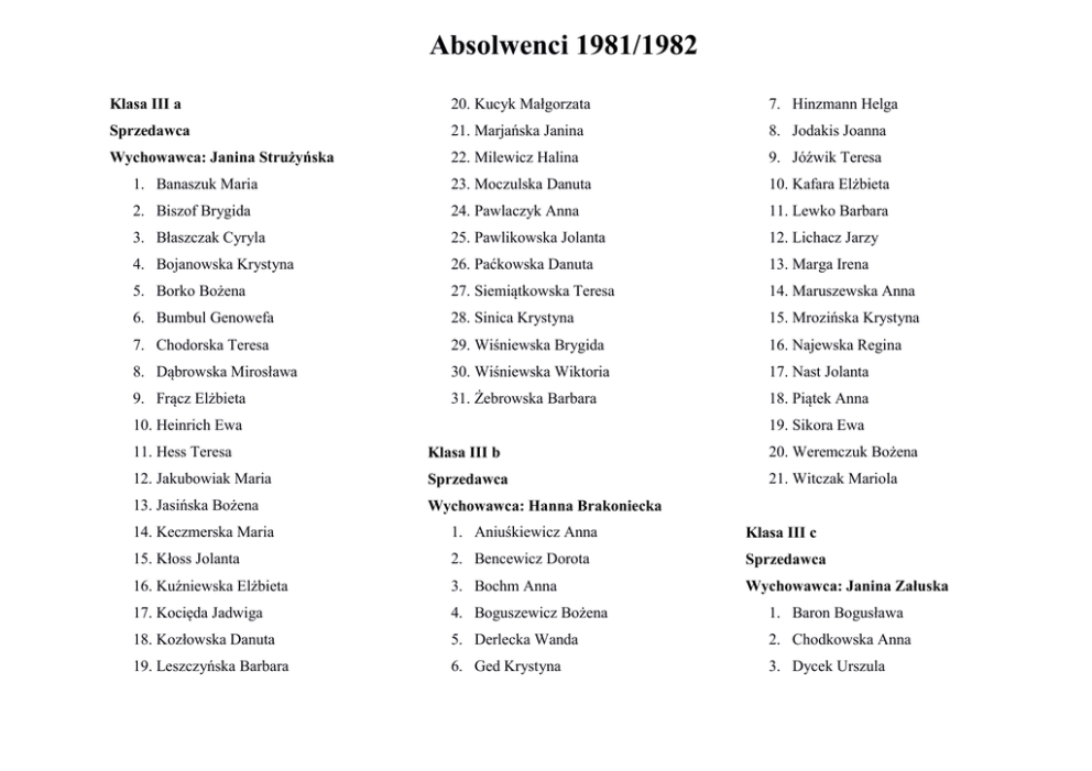 Absolwenci 1981/1982 Klasa III a 20. Kucyk Małgorzata 7. Hinzmann Helga Wychowawca: Janina Strużyńska 22. Milewicz Halina 9. Jóźwik Teresa Sprzedawca 1. Banaszuk Maria 2. Biszof Brygida 3. Błaszczak Cyryla 4. Bojanowska Krystyna 5. Borko Bożena 6. Bumbul Genowefa 7. Chodorska Teresa 8. Dąbrowska Mirosława 9. Frącz Elżbieta 10. Heinrich Ewa 21. Marjańska Janina 23. Moczulska Danuta 24. Pawlaczyk Anna 25. Pawlikowska Jolanta 26. Paćkowska Danuta 27. Siemiątkowska Teresa 28. Sinica Krystyna 29. Wiśniewska Brygida 30. Wiśniewska Wiktoria 31. Żebrowska Barbara 11. Hess Teresa Klasa III b 13. Jasińska Bożena Wychowawca: Hanna Brakoniecka 12. Jakubowiak Maria 14. Keczmerska Maria 15. Kłoss Jolanta 16. Kuźniewska Elżbieta 17. Kocięda Jadwiga 18. Kozłowska Danuta 19. Leszczyńska Barbara Sprzedawca 8. Jodakis Joanna 10. Kafara Elżbieta 11. Lewko Barbara 12. Lichacz Jarzy 13. Marga Irena 14. Maruszewska Anna 15. Mrozińska Krystyna 16. Najewska Regina 17. Nast Jolanta 18. Piątek Anna 19. Sikora Ewa 20. Weremczuk Bożena 21. Witczak Mariola 1. Aniuśkiewicz Anna Klasa III c 3. Bochm Anna Wychowawca: Janina Załuska 2. Bencewicz Dorota 4. Boguszewicz Bożena 5. Derlecka Wanda 6. Ged Krystyna Sprzedawca 1. Baron Bogusława 2. Chodkowska Anna 3. Dycek Urszula Absolwenci 1981/1982 4. Gosiewska Ewa 5. Igielska Violetta 26. Ziółkowska Beata 6. Ignacka Joanna Klasa III d 8. Jakubas Jadwiga Wychowawca: Aleksander Zapolski 7. Jachimowska Grażyna 9. Kalinowska Barbara 10. Kasprzyk Celina 11. Lapeusz Ewa 12. Lautenbach Anna 13. Łachacz Sabina 14. Łegowska Małgorzata 15. Ordziejewska Teresa 16. Prusak Agnieszka 17. Prusak Marzena 18. Rawa Anna 19. Rożek Anita 20. Rożnowska Zofia 21. Siling Regina 22. Siperek Elżbieta 23. Śledziewska Bożena 24. Szpara Małgorzata 25. Zinkiewicz Iwona Sprzedawca 1. Andruczyk Małgorzata 2. Bartoszewicz Marzena 3. Bojarowicz Teresa 18. Skrzyńska Jolanta 19. Szota Janina 20. Trudnos Krystyna 21. Włodarczyk Wiesława 22. Żmuda Danuta 23. Kądziela Nelly 4. Brzozowska Iwona Klasa III e 6. Dziemiodowicz Maria Wychowawca: Piotr Bodnar 5. Domian Teresa 7. Fotschki Irena 8. Gieranowska Mirosława 9. Gorąca Krystyna 10. Koller Małgorzata 11. Komorowska Bożena 12. Likszo Bożena 13. Majewska Anna 14. Mieszkowska Bożena 15. Nowak Iwona 16. Parzych Agata 17. Pawłowska Bożena Sprzedawca 1. Dawidczyk Regina 2. Godzińska Teresa 3. Górecka Violetta 4. Idzińska Lidia 5. Jankowska Wiesława 6. Kania Janina 7. Karwowska Mirosława 8. Komuńska Elżbieta 9. Krawczyk Ewa 10. Lisowska Elżbieta 11. Łączyńska Lilia Absolwenci 1981/1982 12. Łukaszewicz Dorota 6. Kiełb Beata 3. Czasnojć Elżbieta 14. Porębska Małgorzata 8. Kwas Małgorzata 5. Gawrońska Iwona 13. Piechocińska Dorota 15. Przewłocka Teresa 16. Radomska Renata 17. Rochmińska Grażyna 18. Romanowska Wanda 19. Rychlica Danuta 20. Wiśniewska Jolanta 21. Wołosewicz Magdalena 22. Wojtkiewicz Anna 23. Zembrzuska Teresa 24. Zębek Małgorzata Klasa III f Sprzedawca Wychowawca: Halina Czarkowska 7. Kiełczewska Małgorzata 9. Łozowska Hanna 10. Misiuk Anna 11. Paszkowska Maria 12. Pawlicka Wiesława 13. Puchalska Danuta 14. Ruch Elfryda 15. Sawera Gabriela 16. Sawieka Jadwiga 17. Skrzyńska Aniela 18. Sabatowicz Anita 19. Wanagiel Krystyna 20. Wojtukiewicz Urszula 21. Siargiej Mirosława 1. Asman Weronika Klasa III i 3. Daniszewska Bogusława koleiWychowawca: Irena Grzyb 2. Daniszewska Anna 4. Dąbreńko Małgorzata 5. Kachel Bożena Operator ruchowo-przewozowy 1. Antosik Małgorzata 2. Asman Jerzy 4. Domeracka Lilla 6. Grabowska Alina 7. Jelińska Anna 8. Konopka Teresa 9. Kotuniak Jerzy 10. Kulig Małgorzata 11. Lewicka Barbara 12. Liszniańska Krystyna 13. Łabęcka Ewa 14. Nowak Lucyna 15. Obolewicz Maria 16. Prażmo Ewa 17. Rychter Elżbieta 18. Tomaszewska Ewa 19. Wasilewski Leszek 20. Worobiec Danuta 21. Zawadzka Ewa Absolwenci 1981/1982 Klasa III k 19. Mazurek Małgorzata 10. Koźlik Lidia Wychowawca: Stanisław Pawłowski 21. Milewski Mirosław 12. Maczuga Teresa Krawiec, stolarz 1. Arcichowski Waldemar 2. Biedniakowska Ewa 3. Czarnecka Zofia 4. Dawidko Zofia 5. Dejmarowicz Janusz 6. Dobrosielska Iwona 20. Miecznik Elżbieta 22. Moczulska Elżbieta 23. Orłowska Maria 24. Radomska Grażyna 25. Ruszczyk Bogusław 26. Sędrowska Barbara 27. Szafran Irena 7. Flak Grażyna Klasa III l 9. Głowiński Ryszard Wychowawca: Lilianna Dziedzicka 8. Furman Anna 10. Grzeszczyk Barbara 11. Iskra Bogusława 12. Jackowski Andrzej 13. Jarka Maria 14. Jędra Mirosław 15. Jusiński Mieczysław 16. Kobus Krzysztof 17. Kukowska Jolanta 18. Malinowska Ewa Krawiec 1. Bartkowska Teresa 2. Bartosiak Danuta 3. Bogus Danuta 4. Grzegorczyk Elżbieta 5. Janowska Joanna 6. Jurczyńska Joanna 7. Kielich Zofia 8. Kluczkowska Anna 9. Kondrat Joanna 11. Kraska Małgorzata 13. Majkowska Małgorzata 14. Malinowska Dorota 15. Nitkiewicz Elżbieta 16. Pelka Dorota 17. Pianka Barbara 18. Romanik Anna 19. Sobolewska Elżbieta 20. Solińska Hanna Klasa III m Grafik Wychowawca: Krzysztof Iwulski 1. Adamowicz Jolanta 2. Bochm Ewa 3. Borys Mariola 4. Cekała Urszula 5. Chmielewska Jolanta 6. Czanik Irena 7. Frączkiewicz Sławomir Absolwenci 1981/1982 8. Januszewska Wiesława 14. Moszczyński Tomasz 20. Senkowska Urszula 10. Król Grażyna 16. Podlasiak Marzena 22. Wiśniewska Ewa 9. Kowalczyk Dorota 11. Kuczewska Beata 12. Lejk Ewa 13. Michalska Ewa 15. Najmowicz Anna 17. Reddig Brygida 18. Sadowska Elżbieta 19. Sender Beata 21. Skryniuk Danuta 23. Woltmanowska Iwona