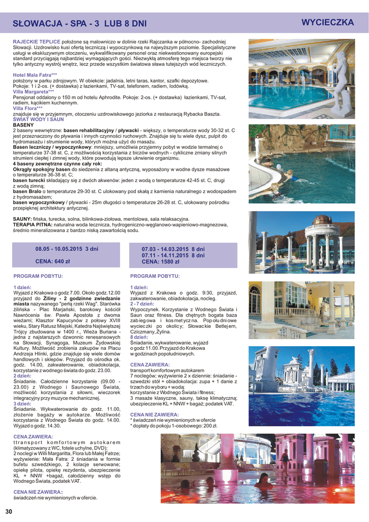 S£OWACJA - SPA - 3 LUB 8 DNI WYCIECZKA RAJECKIE TEPLICE po³o¿one s¹ malowniczo w dolinie rzeki Rajczanka w pó³nocno- zachodniej S³owacji. Uzdrowisko kusi ofert¹ lecznicz¹ i wypoczynkow¹ na najwy¿szym poziomie. Specjalistyczne us³ugi w ekskluzywnym otoczeniu, wykwalifikowany personel oraz niekwestionowany europejski standard przyci¹gaj¹ najbardziej wymagaj¹cych goœci. Niezwyk³¹ atmosferê tego miejsca tworzy nie tylko antyczny wystrój wnêtrz, lecz przede wszystkim œwiatowa s³awa tutejszych wód leczniczych. Hotel Mala Fatra*** po³o¿ony w parku zdrojowym. W obiekcie: jadalnia, letni taras, kantor, szafki depozytowe. Pokoje: 1 i 2-os. (+ dostawka) z ³azienkami, TV-sat, telefonem, radiem, lodówk¹. Villa Margareta*** Pensjonat oddalony o 150 m od hotelu Aphrodite. Pokoje: 2-os. (+ dostawka) ³azienkami, TV-sat, radiem, k¹cikiem kuchennym. Villa Flora*** znajduje siê w przyjemnym, otoczeniu uzdrowiskowego jeziorka z restauracj¹ Rybacka Baszta. ŒWIAT WODY I SAUN BASENY 2 baseny wewnêtrzne: basen rehabilitacyjny / p³ywacki - wiêkszy, o temperaturze wody 30-32 st. C jest przeznaczony do p³ywania i innych czynnoœci ruchowych. Znajduje siê tu wiele dysz, pulpit do hydromasa¿u i strumienie wody, których mo¿na u¿yæ do masa¿u. Basen leczniczy / wypoczynkowy: mniejszy, umo¿liwia przyjemny pobyt w wodzie termalnej o temperaturze 37-38 st. C, z mo¿liwoœci¹ korzystania z biczów wodnych - cykliczne zmiany silnych strumieni ciep³ej i zimnej wody, które powoduj¹ lepsze ukrwienie organizmu. 4 baseny zewnêtrzne czynne ca³y rok: Okr¹g³y spokojny basen do siedzenia z altan¹ antyczn¹, wyposa¿ony w wodne dysze masa¿owe o temperaturze 36-38 st. C; basen turecki sk³adaj¹cy siê z dwóch akwenów: jeden z wod¹ o temperaturze 42-45 st. C, drugi z wod¹ zimn¹; basen Bralo o temperaturze 29-30 st. C ulokowany pod ska³¹ z kamienia naturalnego z wodospadem z hydromasa¿em; basen wypoczynkowy / p³ywacki - 25m d³ugoœci o temperaturze 26-28 st. C, ulokowany poœrodku przepiêknej architektury antycznej. SAUNY: fiñska, turecka, solna, bilinkowa-zio³owa, mentolowa, sala relaksacyjna. TERAPIA PITNA: naturalna woda lecznicza, hydrogeniczno-wêglanowo-wapieniowo-magnezowa, œrednio mineralizowana z bardzo nisk¹ zawartoœci¹ sodu. 08.05 - 10.05.2015 3 dni CENA: 640 z³ 07.03 - 14.03.2015 8 dni 07.11 - 14.11.2015 8 dni CENA: 1580 z³ S£OWACJA - RAJECKIE TEPLICE PROGRAM POBYTU: PROGRAM POBYTU: 1 dzieñ: Wyjazd z Krakowa o godz 7.00. Oko³o godz.12.00 przyjazd do ¯iliny - 2 godzinne zwiedzanie miasta nazywanego "per³¹ rzeki Wag". Starówka ¿iliñska - Plac Marjañski, barokowy koœció³ Nawrócenia œw. Paw³a Aposto³a z dwoma wie¿ami; Klasztor Kapucynów z po³owy XVIII wieku, Stary Ratusz Miejski, Katedra Najœwiêtszej Trójcy zbudowana w 1400 r., Wie¿a Buriana jedna z najstarszych dzwonnic renesansowych na S³owacji, Synagoga, Muzeum ¯ydowskiej Kultury. Mo¿liwoœæ zrobienia zakupów na Placu Andrzeja Hlinki, gdzie znajduje siê wiele domów handlowych i sklepów. Przyjazd do oœrodka ok. godz. 14.00, zakwaterowanie, obiadokolacja, korzystanie z wodnego œwiata do godz. 23.00. 2 dzieñ: Œniadanie. Ca³odzienne korzystanie (09.00 23.00) z Wodnego i Saunowego Œwiata, mo¿liwoœæ korzystania z si³owni, wieczorek integracyjny przy muzyce mechanicznej. 3 dzieñ: Œniadanie. Wykwaterowanie do godz. 11.00, z³o¿enie baga¿y w autokarze. Mo¿liwoœæ korzystania z Wodnego Œwiata do godz. 14.00. Wyjazd o godz. 14.30. 1 dzieñ: Wyjazd z Krakowa o godz. 9:30, przyjazd, zakwaterowanie, obiadokolacja, nocleg. 2 - 7 dzieñ: Wypoczynek. Korzystanie z Wodnego Œwiata i Saun oraz fitness. Dla chêtnych bogata baza zab ieg owa i kos met ycz na. Pop o³u dni owe wyciec zki po okolic y; S³owac kie Betlej em, Cziczmany, ¯ylina. 8 dzieñ: Œniadanie, wykwaterowanie, wyjazd o godz 11.00. Przyjazd do Krakowa w godzinach popo³udniowych. CENA ZAWIERA: ttransport komfortowym autokarem (klimatyzowany z WC, fotele uchylne, DVD); 2 noclegi w Willi Margaritta, Flora lub Ma³ej Fatrze; wy¿ywienie: Ma³a Fatra: 2 œniadania w formie bufetu szwedzkiego, 2 kolacje serwowane; opiekê pilota, opiekê rezydenta, ubezpieczenie KL + NNW +baga¿, ca³odzienny wstêp do Wodnego Œwiata, podatek VAT. CENA NIE ZAWIERA:: œwiadczeñ nie wymienionych w ofercie. 30 CENA ZAWIERA: transport komfortowym autokarem 7 noclegów; wy¿ywienie 2 x dziennie: œniadanie szwedzki stó³ + obiadokolacja: zupa + 1 danie z trzech do wyboru + woda; korzystanie z Wodnego Œwiata i fitness; 3 masa¿e klasyczne, sauny, taksê klimatyczn¹; ubezpieczenie KL + NNW + baga¿; podatek VAT. CENA NIE ZAWIERA: * œwiadczeñ nie wymienionych w ofercie * dop³aty do pokoju 1-osobowego: 200 z³. WYCIECZKA