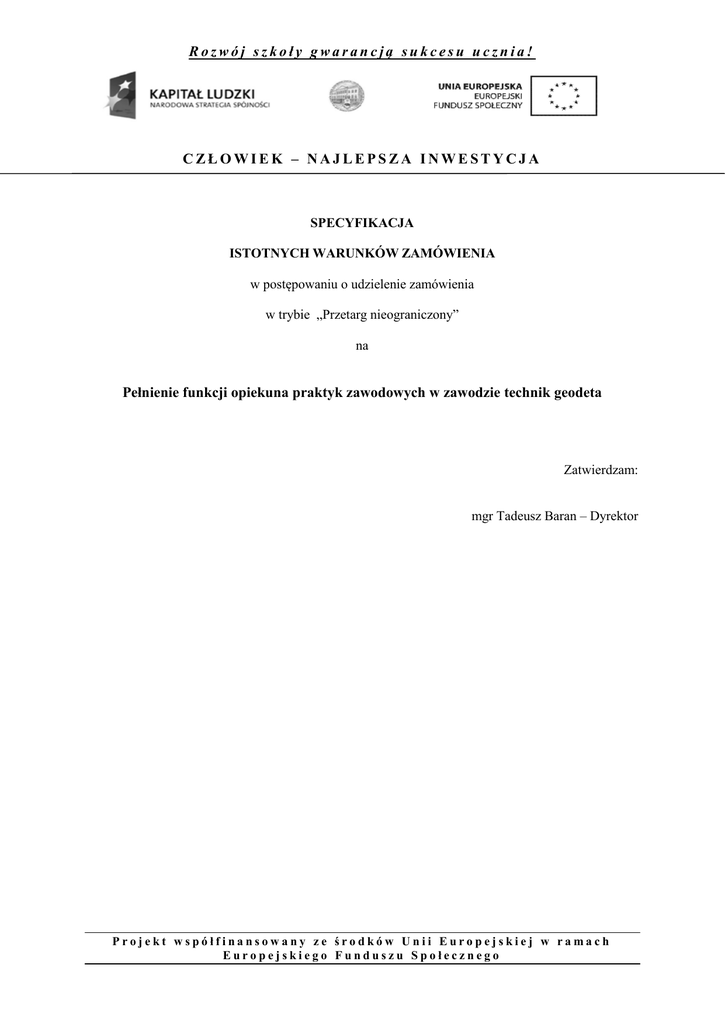 Rozwój szkoły gwarancją sukcesu ucznia! CZŁOWIEK – NAJLEPSZA INWESTYCJA SPECYFIKACJA ISTOTNYCH WARUNKÓW ZAMÓWIENIA w postępowaniu o udzielenie zamówienia w trybie „Przetarg nieograniczony” na Pełnienie funkcji opiekuna praktyk zawodowych w zawodzie technik geodeta Zatwierdzam: mgr Tadeusz Baran – Dyrektor Projekt współfinansowany ze środków Unii Europejskiej w ramach Europejskiego Funduszu Społecznego Rozwój szkoły gwarancją sukcesu ucznia! CZŁOWIEK – NAJLEPSZA INWESTYCJA 1. Informacja o Zamawiającym Zamawiającym jest Zespół Szkół Elektronicznych i Ogólnokształcących NIP: 795-13-93-971, REGON:650975451 Adres: 37-700 Przemyśl, ul. Kilińskiego 10 Tel.: 16 678-30-01 zwany w dalszej części Zamawiającym 2. Tryb udzielenia zamówienia 1. Zamówienie prowadzone jest w trybie „Przetarg nieograniczony”, którego wartość nie przekracza kwotę 14 000 euro. 2. Zamówienia realizowane jest w ramach projektu: „Rozwój szkoły gwarancją sukcesu ucznia!”, który jest finansowany przez Unię Europejską ze środków Europejskiego Funduszu Społecznego w ramach Programu Operacyjnego Kapitał Ludzki, Priorytet IX – Rozwój wykształcenia i kompetencji w regionach, Działanie 9.2 Podniesienie atrakcyjności i jakości szkolnictwa zawodowego. 3. Opis przedmiotu zamówienia: a. nr CPV: 80.21.10.00-6, 80.21.20.00-3. a. przedmiotem niniejszego postępowania jest pełnienie funkcji opiekuna praktyk zawodowych w zawodzie technik geodeta. Praktyki zawodowe rozpoczną się w miesiącu maju i będą trwać cztery tygodnie, w cyklu poniedziałek – piątek. b. Zamawiający planuje zatrudnienie dwóch osób jako opiekunów praktyk c. Praktyki będą wyjazdowe, uczniowie wraz z opiekunami zostaną przewiezieni na teren pomiarowy d. Uczniowie podzieleni zostaną na trzy zespoły pomiarowe – ćwiczeniowe (po 10-11 os). Każda z grup będzie miała swojego opiekuna e. Do obowiązków opiekuna praktyk będzie należało: ustalenie w porozumieniu z koordynatorem projektu harmonogramu praktyk, w przypadku wystąpienia nieprzewidzianych okoliczności uniemożliwiających odbycie praktyk w zaplanowanym miejscu nawiązanie kontaktu z innym obiektem i organizowanie tam - w porozumieniu z koordynatorem projektu - praktyk zawodowych, opracowanie programu praktyki zawodowej zgodnie z Rozporządzeniem Ministra Edukacji Narodowej z dnia 15 grudnia 2010 r. w sprawie praktycznej nauki zawodu Projekt współfinansowany ze środków Unii Europejskiej w ramach Europejskiego Funduszu Społecznego Rozwój szkoły gwarancją sukcesu ucznia! CZŁOWIEK – NAJLEPSZA INWESTYCJA (Dz. U. z dnia 23 grudnia 2010 r. Nr 244, poz. 1626) oraz z uwzględnieniem wymagań na egzamin zawodowy w zawodzie technik geodeta, nadzór nad realizacją programu praktyki zawodowej, opieka nad uczniami przebywającymi na praktyce zawodowej, f) opieka nad grupą pomiarową - ćwiczeniową (10-11 os) powiadamianie szkoły o naruszeniu przez ucznia dyscypliny pracy sprawdzanie obecności uczniów na praktyce zawodowej (lista obecności), realizacja programu praktyk dbanie o zachowanie przepisów BHP, sporządzanie dokumentacji przebiegu praktyki (zestawień, ankiet, sprawozdań na drukach lub formularzach otrzymanych od Koordynatora Projektu), dostarczenie koordynatorowi projektu zaświadczeń o odbyciu praktyki przez uczestników projektu, inne obowiązki określone w przepisach dotyczących organizacji i przeprowadzania praktyk zawodowych uczniów. Nie dopuszcza się składanie ofert częściowych, szczegółowy opis części znajduje się w ogłoszeniu zamówienia Nie dopuszcza się składania ofert wariantowych Oferty mogą składać podmioty dysponujące przynajmniej jedną osobą spełniającą wymagania Zamawiającego, lub osoby fizyczne spełniające wymagania Zamawiającego. 4. Termin wykonania zamówienia: od dnia umowy do 03.05.2012 roku. 5. Warunki udziału w postępowaniu W postępowaniu może brać udział Wykonawca, który: a) spełnia warunki określone w art. 22 ust 1 ustawy b) nie podlega wykluczeniu z postępowania o udzielenie zamówienia w okolicznościach o których mowa w art. 24 ust 1 ustawy. Wymagania Zamawiającego co do osoby pełniącej funkcję opiekuna praktyk: pierwszy opiekun: wykształcenie wyższe min. inżynierskie w zakresie geodezji lub podobne Projekt współfinansowany ze środków Unii Europejskiej w ramach Europejskiego Funduszu Społecznego Rozwój szkoły gwarancją sukcesu ucznia! CZŁOWIEK – NAJLEPSZA INWESTYCJA drugi opiekun: wykształcenie wyższe z przygotowaniem pedagogicznym Ocena spełniania warunków udziału w postępowaniu będzie odbywać się na podstawie złożonej oferty, załączonych dokumentów i oświadczeń wg formuły: spełnia/nie spełnia. 6. Oferta oraz dokumenty z nią składane: 1. 2. 3. 4. 5. 6. Druk ofertowy – zał. Nr 1, Oświadczenie o spełnianiu warunków udziału w postępowaniu – zał. nr 2, Oświadczenie o braku podstaw do wykluczenia zał. nr 3, Wykaz osób, którymi dysponuje lub będzie dysponował wykonawca i które będą uczestniczyć w wykonywaniu zamówienia – zał. Nr 4, Oświadczenie dotyczące posiadanych kwalifikacji – zał. nr 4a, Wzór umowy – zał. Nr 5. 7. Inne dokumenty W przypadku, gdy ofertę w imieniu Wykonawcy podpisuje osoba inna niż ujawniona w dokumentach o których mowa w ust 6 pkt d, do oferty należy załączyć dokument lub dokumenty z którego/(ych) będzie wynikać zakres umocowania. 8. Jeśli wykonawca ma siedzibę poza terytorium Rzeczpospolitej Polskiej zamiast dokumentów, o których mowa w ust. 6 składa następujące dokumenty: a) dokument wystawiony w kraju, w którym ma siedzibę lub miejsce zamieszkania potwierdzający, że: nie otwarto jego likwidacji ani nie ogłoszono upadłości - wystawiony nie wcześniej niż 6 miesięcy przed upływem terminu składania wniosków o dopuszczenie do udziału w postępowaniu o udzielenie zamówienia albo składania ofert 9. Informacje o sposobie po