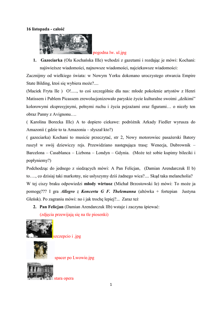 16 listopada - całość pogodna lw. ul.jpg 1. Gazeciarka (Ola Kochańska IIIe) wchodzi z gazetami i rozdając je mówi: Kochani: najświeższe wiadomości, najnowsze wiadomości, najciekawsze wiadomości: Zacznijmy od wielkiego świata: w Nowym Yorku dokonano uroczystego otwarcia Empire State Bilding, ktoś się wybiera może?.... (Maciek Fryta IIe ) O!....., to coś szczególnie dla nas: młode pokolenie artystów z Henri Matissem i Pablem Picassem zrewolucjonizowało paryskie życie kulturalne swoimi „dzikimi” kolorowymi ekspresyjnymi, pełnymi ruchu i życia pejzażami oraz figurami… o niezły ten obraz Panny z Avignonu…. ( Karolina Borecka IIIc) A to dopiero ciekawe: podróżnik Arkady Fiedler wyrusza do Amazonii ( gdzie to ta Amazonia – słyszał kto?) ( gazeciarka) Kochani to musicie przeczytać, str 2, Nowy motorowiec pasażerski Batory ruszył w swój dziewiczy rejs. Przewidziano następująca trasę: Wenecja, Dubrownik – Barcelona – Casablanca – Lizbona – Londyn – Gdynia. (Może też sobie kupimy bileciki i popłyniemy?) Podchodząc do jednego z siedzących mówi: A Pan Felicjan, (Damian Arendarczuk II b) to…., co dzisiaj taki markotny, nie usłyszymy dziś żadnego wica?.... Skąd taka melancholia? W tej ciszy braku odpowiedzi młody wirtuoz (Michał Brzostowski Ie) mówi: To może ja pomogę??? I gra Allegro z Koncertu G F. Thelemanna (altówka + fortepian Gleńsk). Po zagraniu mówi: no i jak trochę lepiej?... Zaraz też 2. Pan Felicjan (Damian Arendarczuk IIb) wstaje i zaczyna śpiewać: (zdjęcia przewijają się na tle piosenki) szczepcio i .jpg spacer po Lwowie.jpg stara opera 1 Justyna stary panska kościół elżbiety „Niech inni se jadą gdzie mogą gdzie chcą”, ….wszyscy siedząc włączają się w refren. Pod koniec piosenki gazeciarka zauważa dwie dziewczyny, które nie śpiewały i podchodząc do Idy (Ida Błąkała IIId) i Klaudii (Klaudia Korobij IIIe) i mówi: A wy moje drogie też jakieś nieswoje, zamyślone, czy jak??? Dziewczyny zaczynają śpiewać przy akompaniamencie gitary – Aleksandra Marciniak, piosenkę „Tyle jest miast”. (zdjęcia przewijają się na tle piosenki) dworzec kolejowy plac mariacki wały hetmańskie 2 akademicka stary uniwersytet plac halicki teatr wielki stare 3. Po piosence całość akcji przenosi się na stronę prawą sceny, gdzie widzimy: (po piosence pokój z fortepianem, to zdjęcie nie zmienia się przez cały punkt 4) pokój 4. Klasyczny stolik, kanapę i fotele. Na jednym z foteli przy stoliku siedzi profesor L. de Berier, (Jarek Czwojda Ie) czasami coś notując… (projektor – zdjęcie lwowskiego domu - wnętrza) *a) Wstaje prof. L. de Berier i przechadzając się po scenie mówi jakby do siebie: dziś otrzymałem niezwykłą depeszę od prezydenta Rzeczypospolitej, że Kodeks zobowiązań, nad którym tak intensywnie pracowałem z moim przyjacielem 3 profesorem Tillem, został wprowadzony rozporządzeniem. Tak…. Jestem przekonany, że zasada równości stron i wolności umów jest niezwykle istotna w naszym obecnym państwie, podobnie jak zasada dobrych obyczajów, która umożliwia sędziemu uwzględnienie warunków konkretnej sytuacji faktycznej i takie rozstrzygnięcie sprawy, które nie prowadzi do pokrzywdzenia jednej ze stron, szczególnie tej słabszej ekonomicznie… (z widowni podnosi się postać lokaja (Damian Tadeusiak Ie) i zapowiada: Szanowny Panie profesorze Longchamps de Berier, mam zaszczyt powiadomić, iż zaszczyca Pana swoją obecnością prof. Hugo Steinhaus) Na scenę z widowni wchodzi prof. H. Steinhaus (Mateusz Lewandowski Ie) *b) L de Berier: (podając rękę) mówi: Witaj przyjacielu, jakie nowiny przynosisz ze świata matematyki (w międzyczasie wskazuje miejsce, by usiadł), może chcesz powiedzieć, że udoskonaliłeś metodę analizy funkcjonalnej, która tak cię ostatnio zajmowała? H. Steinhaus: siadając mówi: Tak, w jakimś sensie masz rację z tą analizą funkcjonalną, bo dziś pojawi się u ciebie człowiek, z którym nad tym pracuję. Ciekawa historia z tym człowiekiem, bo nie spotkałem go na uniwersytecie, ale idąc letnim wieczorem wzdłuż plant krakowskich, usłyszałem rozmowę a raczej tylko kilka słów; wyrazy: „całka Lebesgue`a” były tak nieoczekiwane, że zbliżyłem się do ławki i zapoznałem się z dyskutantami; to Stefan Banach i Otton Nikodym rozmawiali o matematyce. (lokaj: szanowny panie profesorze Longchamp de Berier, przybył profesor Stefan Banach) *c) Steinhaus (przedstawiając): oto i on, profesor Stefan Banach (Kamil Piotrowski Ie), który siadając zaraz zaczyna mówić: Witaj przyjacielu, może to nie moment właściwy na takie rozmowy, ale chciałbym powiedzieć, że jestem pełen podziwu rozważając metodę działania twojego longimetru, czy na pewno wystarczy przezroczysty arkusz z trzema obróconymi względem siebie o 30° kratami prostopadłych linii rozmieszczonych w równych odległościach… włącza się L. de Berier, ponownie spacerując: matematycy wiedzą dobrze, że ich rzemiosło polega na tej samej tajemnicy, co rzemiosło poetów. (lokaj: Panie profesorze zapowiadany gość Jan Kasprowicz) L. de Berier: podchodząc wita i mówi: no właśnie, oto i on, oto nasz lew salonowy *d) Jan Kasprowicz (Piotr Kowalski Ie): (cały zaaferowany) Słuchajcie, czas odrzucić naturalizm. Od dziś celem mojej twórczości jest ukazanie gry światła, wyobraźni i ulotności 4 chwili. Przewędrowałem w życiu wiele świata, góry widziałem, nietającymi nigdy lodami. Widywałem rzeki tak szerokie, że trzeba całej niemal godziny, aby łodzią przepłynąć z jednego brzegu na drugi. Siadywałem po dolinach tak cudnych, że ziemia wydawała mi się rajem. Patrzyłem na tęcze, które tworzą się w rozbitej na drobne pyły fali ogromnych wodospadów. A przecież tęsknota moja nigdzie nie znajdowała takiego ukojenia, jak w naszych Tatrach. (Wiersz Kasprowicza recytuje: Ola Kucharek Ie): W ciemnosmreczyńsk