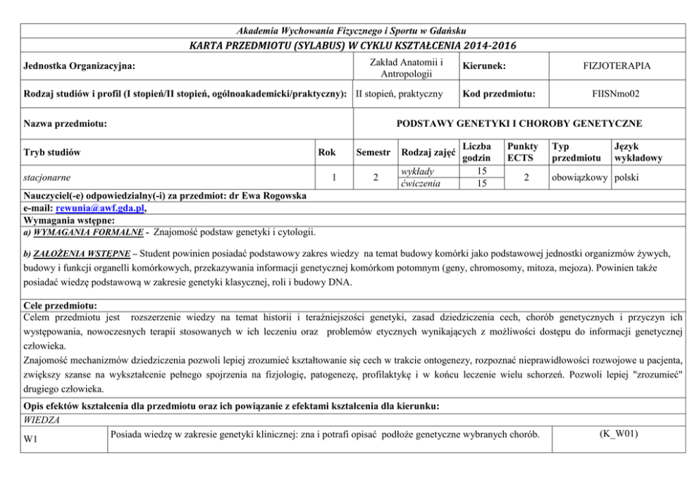 Akademia Wychowania Fizycznego i Sportu w Gdańsku KARTA PRZEDMIOTU (SYLABUS) W CYKLU KSZTAŁCENIA 2014-2016 Zakład Anatomii i Antropologii Jednostka Organizacyjna: Rodzaj studiów i profil (I stopień/II stopień, ogólnoakademicki/praktyczny): II stopień, praktyczny Nazwa przedmiotu: Tryb studiów stacjonarne FIZJOTERAPIA Kierunek: Kod przedmiotu: FIISNmo02 PODSTAWY GENETYKI I CHOROBY GENETYCZNE Rok 1 Semestr 2 Rodzaj zajęć wykłady ćwiczenia Liczba godzin 15 15 Punkty ECTS 2 Typ przedmiotu Język wykładowy obowiązkowy polski Nauczyciel(-e) odpowiedzialny(-i) za przedmiot: dr Ewa Rogowska e-mail: [email protected], Wymagania wstępne: a) WYMAGANIA FORMALNE - Znajomość podstaw genetyki i cytologii. b) ZAŁOŻENIA WSTĘPNE – Student powinien posiadać podstawowy zakres wiedzy na temat budowy komórki jako podstawowej jednostki organizmów żywych, budowy i funkcji organelli komórkowych, przekazywania informacji genetycznej komórkom potomnym (geny, chromosomy, mitoza, mejoza). Powinien także posiadać wiedzę podstawową w zakresie genetyki klasycznej, roli i budowy DNA. Cele przedmiotu: Celem przedmiotu jest rozszerzenie wiedzy na temat historii i teraźniejszości genetyki, zasad dziedziczenia cech, chorób genetycznych i przyczyn ich występowania, nowoczesnych terapii stosowanych w ich leczeniu oraz problemów etycznych wynikających z możliwości dostępu do informacji genetycznej człowieka. Znajomość mechanizmów dziedziczenia pozwoli lepiej zrozumieć kształtowanie się cech w trakcie ontogenezy, rozpoznać nieprawidłowości rozwojowe u pacjenta, zwiększy szanse na wykształcenie pełnego spojrzenia na fizjologię, patogenezę, profilaktykę i w końcu leczenie wielu schorzeń. Pozwoli lepiej "zrozumieć" drugiego człowieka. Opis efektów kształcenia dla przedmiotu oraz ich powiązanie z efektami kształcenia dla kierunku: WIEDZA Posiada wiedzę w zakresie genetyki klinicznej: zna i potrafi opisać podłoże genetyczne wybranych chorób. W1 (K_W01) W2 Potrafi zdefiniować oraz opisać zespoły wad rozwojowych towarzyszących chorobom uwarunkowanym genetycznie. (K_W01) Posiada wiedzę w zakresie rehabilitacji kompleksowej i podtrzymywania sprawności osób z różnymi dysfunkcjami wywołanymi chorobą o podłożu genetycznym, ograniczenia wynikające z jej specyfiki oraz możliwości łagodzenia efektów jej występowania. Zna zasady etyczne obowiązujące w pracy z pacjentem chorującym na chorobę dziedziczną, która wymaga najczęściej szczególnego podejścia zarówno do pacjenta (często bardzo młodego) jak i do jego rodziny. (K_W06) (K_W07) (K_U05) U1 Potrafi przedstawić wybrane problemy funkcjonalne pacjenta chorującego na chorobę o podłożu genetycznym oraz możliwości stosowania zabiegów fizjoterapeutycznych w celu minimalizowania efektów chorobowych. U2 Potrafi programować aktywność ruchową adaptacyjną w rehabilitacji kompleksowej i podtrzymywaniu sprawności osób z różnymi dysfunkcjami wynikającymi z rozwijającej się choroby genetycznej. U3 Potrafi przewidzieć skutki przebiegu różnego rodzaju dysfunkcji oraz stanów chorobowych, a także określonego postępowania usprawniającego. U4 Potrafi gromadzić, przetwarzać i krytycznie oceniać informacje z wykorzystaniem wyspecjalizowanych technik i narzędzi informatycznych i elektronicznych źródeł informacji. W3 W4 (K_W17) UMIEJĘTNOŚCI (K_U09) (K_U16) (K_U14) KOMPETENCJE K1 K2 Jest świadomy potrzeby uzupełniania i doskonalenia kwalifikacji – potrafi samodzielnie zdobywać wiedzę i umiejętności w zakresie wybranej specjalności zawodowej z wykorzystaniem wiarygodnych i efektywnych źródeł i metod. Jest świadomy znaczenia angażowania się w pracę grup i zespołów działających na rzecz osób niepełnosprawnych i wykluczonych. Potrafi formułować opinie dotyczące różnorodnych aspektów działalności fizjoterapeutycznej. (K_K02) (K_K01) (K_K08) Kryteria i metody oceny osiągniętych efektów kształcenia: Zaliczenie ćwiczeń obejmuje: kolokwium teoretyczne ze znajomości genetycznego podłoża omawianych chorób (50% oceny całkowitej) oraz ocenę przedstawienia prezentacji multimedialnej przygotowanej na temat wybranej choroby genetycznej (50% oceny całkowitej). Kolokwium pisemne – zaliczenie wymaga udzielenia minimum 60% poprawnych odpowiedzi. Prezentacja multimedialna powinna zawierać informacje na temat genetycznych uwarunkowań choroby, schematu jej dziedziczenia, najważniejszych objawów chorobowych, możliwości minimalizowania efektów choroby przy zastosowaniu fizjoterapii . Egzamin pisemny z tematyki wykładowej (ocena pozytywna wymaga udzielenia min. 60% poprawnych odpowiedzi). Aby uzyskać zaliczenie przedmiotu na ocenę dostateczną student musi osiągnąć wszystkie wymienione przedmiotowe efekty kształcenia. Metody i formy realizacji przedmiotu: Przedmiot jest realizowany w formie ćwiczeń i wykładów. Ćwiczenia mają charakter praktyczny: studenci przygotowują prezentację multimedialną dotyczącą wybranej choroby genetycznej z uwzględnieniem roli fizjoterapeuty w łagodzeniu objawów choroby. Każda grupa chorób poprzedzona jest wykładem wprowadzającym prowadzonym przez wykładowcę. Wykład - prezentacja multimedialna (40% wykładów – 6 godzin – realizowanych jest w formie kształcenia on-line). Treści kształcenia: Wykłady: • Historia genetyki. • Mendlowska teoria dziedziczenia. • Chromosomowa teoria dziedziczenia. • Budowa komórki. • Mitoza i mejoza. • Budowa DNA, replikacja, transkrypcja i translacja.. • Dziedziczenie monogenowe. • Dziedziczenie poligenowe. • Źródła zmienności genetycznej. • Choroby genetyczne – uwarunkowania. • Komórki macierzyste. • Genetyka a etyka. Ćwiczenia: Omówienie chorób genetycznych. 1. Choroby wywołane aberracjami chromosomowymi( min. Zespół Downa, Zespół Turnera, Zespół Klinefeltera). 2. Choroby monogenowe (mendlowskie): • Choroby autosomalne 