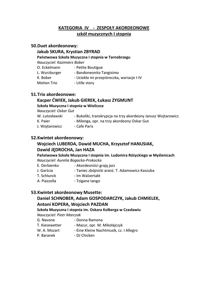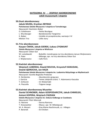 KATEGORIA IV - ZESPOŁY AKORDEONOWE szkół muzycznych I stopnia 50.Duet akordeonowy: Jakub SKURA, Krystian ZBYRAD Państwowa Szkoła Muzyczna I stopnia w Tarnobrzegu Nauczyciel: Kazimierz Bober O. Eckelmann - Petite Boutigue L. Wurzburger - Bandoneonito Tangisimo K. Bober - Uciekła mi przepióreczka, wariacje I-IV Motion Trio - Litlle story 51.Trio akordeonowe: Kacper ĆWIEK, Jakub GIEREK, Łukasz ZYGMUNT Szkoła Muzyczna I stopnia w Wieliczce Nauczyciel: Oskar Gut W. Lutosławski - Bukoliki, transkrypcja na trzy akordeony Janusz Wojtarowicz K. Paier - Milonga, opr. na trzy akordeony Oskar Gut J. Wojtarowicz - Cafe Paris 52.Kwintet akordeonowy: Wojciech LUBERDA, Dawid MUCHA, Krzysztof HANUSIAK, Dawid JĘDROCHA, Jan HAZA Państwowa Szkoła Muzyczna I stopnia im. Ludomira Różyckiego w Myślenicach Nauczyciel: Aurelia Bogacka-Prokocka E. Derbienko - Akordeoniści grają jazz J. Garścia - Taniec zbójnicki aranż. T. Adamowicz-Kaszuba T. Schlunck - Im Walzertakt A. Piazzolla - Tzigane tango 53.Kwintet akordeonowy Musette: Daniel SCHNOBER, Adam GOSPODARCZYK, Jakub CHMIELEK, Antoni KOPERA, Wojciech PAZDAN Szkoła Muzyczna I stopnia im. Oskara Kolberga w Czasławiu Nauczyciel: Piotr Marczak G. Navone - Donna Ramona T. Kiesewetter - Mazur, opr. M. Mikołajczyk W. A. Mozart - Eine Kleine Nachtmusik, cz. I Allegro P. Baranek - DJ Chicken
