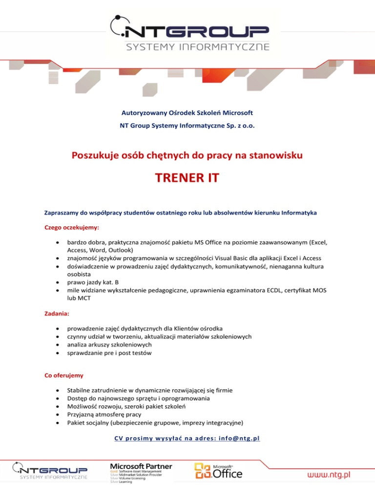 Autoryzowany Ośrodek Szkoleń Microsoft NT Group Systemy Informatyczne Sp. z o.o. Poszukuje osób chętnych do pracy na stanowisku TRENER IT Zapraszamy do współpracy studentów ostatniego roku lub absolwentów kierunku Informatyka Czego oczekujemy:      bardzo dobra, praktyczna znajomość pakietu MS Office na poziomie zaawansowanym (Excel, Access, Word, Outlook) znajomość języków programowania w szczególności Visual Basic dla aplikacji Excel i Access doświadczenie w prowadzeniu zajęć dydaktycznych, komunikatywność, nienaganna kultura osobista prawo jazdy kat. B mile widziane wykształcenie pedagogiczne, uprawnienia egzaminatora ECDL, certyfikat MOS lub MCT Zadania:     prowadzenie zajęć dydaktycznych dla Klientów ośrodka czynny udział w tworzeniu, aktualizacji materiałów szkoleniowych analiza arkuszy szkoleniowych sprawdzanie pre i post testów Co oferujemy      Stabilne zatrudnienie w dynamicznie rozwijającej się firmie Dostęp do najnowszego sprzętu i oprogramowania Możliwość rozwoju, szeroki pakiet szkoleń Przyjazną atmosferę pracy Pakiet socjalny (ubezpieczenie grupowe, imprezy integracyjne) CV pr osimy wysyłać na adres: info@ntg. pl