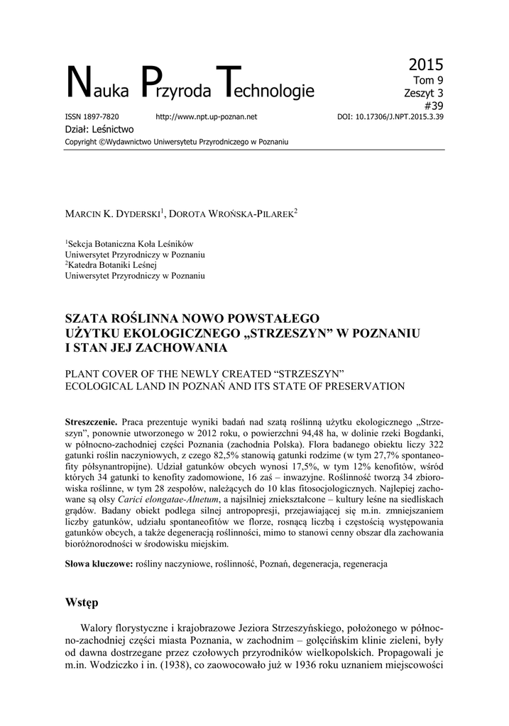 N auka ISSN 1897-7820 P rzyroda T 2015 echnologie http://www.npt.up-poznan.net Tom 9 Zeszyt 3 #39 DOI: 10.17306/J.NPT.2015.3.39 Dział: Leśnictwo Copyright ©Wydawnictwo Uniwersytetu Przyrodniczego w Poznaniu MARCIN K. DYDERSKI1, DOROTA WROŃSKA-PILAREK2 1 Sekcja Botaniczna Koła Leśników Uniwersytet Przyrodniczy w Poznaniu 2 Katedra Botaniki Leśnej Uniwersytet Przyrodniczy w Poznaniu SZATA ROŚLINNA NOWO POWSTAŁEGO UŻYTKU EKOLOGICZNEGO „STRZESZYN” W POZNANIU I STAN JEJ ZACHOWANIA PLANT COVER OF THE NEWLY CREATED “STRZESZYN” ECOLOGICAL LAND IN POZNAŃ AND ITS STATE OF PRESERVATION Streszczenie. Praca prezentuje wyniki badań nad szatą roślinną użytku ekologicznego „Strzeszyn”, ponownie utworzonego w 2012 roku, o powierzchni 94,48 ha, w dolinie rzeki Bogdanki, w północno-zachodniej części Poznania (zachodnia Polska). Flora badanego obiektu liczy 322 gatunki roślin naczyniowych, z czego 82,5% stanowią gatunki rodzime (w tym 27,7% spontaneofity półsynantropijne). Udział gatunków obcych wynosi 17,5%, w tym 12% kenofitów, wśród których 34 gatunki to kenofity zadomowione, 16 zaś – inwazyjne. Roślinność tworzą 34 zbiorowiska roślinne, w tym 28 zespołów, należących do 10 klas fitosocjologicznych. Najlepiej zachowane są olsy Carici elongatae-Alnetum, a najsilniej zniekształcone – kultury leśne na siedliskach grądów. Badany obiekt podlega silnej antropopresji, przejawiającej się m.in. zmniejszaniem liczby gatunków, udziału spontaneofitów we florze, rosnącą liczbą i częstością występowania gatunków obcych, a także degeneracją roślinności, mimo to stanowi cenny obszar dla zachowania bioróżnorodności w środowisku miejskim. Słowa kluczowe: rośliny naczyniowe, roślinność, Poznań, degeneracja, regeneracja Wstęp Walory florystyczne i krajobrazowe Jeziora Strzeszyńskiego, położonego w północno-zachodniej części miasta Poznania, w zachodnim – golęcińskim klinie zieleni, były od dawna dostrzegane przez czołowych przyrodników wielkopolskich. Propagowali je m.in. Wodziczko i in. (1938), co zaowocowało już w 1936 roku uznaniem miejscowości 2 Dyderski, M. K., Wrońska-Pilarek, D. (2015). Szata roślinna nowo powstałego użytku ekologicznego „Strzeszyn” w Poznaniu i stan jej zachowania. Nauka Przyr. Technol., 9, 3, #39. DOI: 10.17306/J.NPT.2015.3.39 położonych nad Jeziorem Strzeszyńskim za podlegające ochronie pod względem krajobrazowym. Pierwsze notatki florystyczne znad Jeziora Strzeszyńskiego sporządził Vorverk (1914). W okresie międzywojennym o wybranych, najcenniejszych gatunkach rosnących w okolicach Jeziora Strzeszyńskiego pisali Krawiec i Urbański (1930), Wodziczko (1932) oraz Wodziczko i in. (1938). W latach późniejszych obserwacje i badania florystyczne prowadzili tu Szweminówna (1949), Krawiecowa (1951), Szulczewski (1951) i Szafran (1959), a obecnie Jackowiak (1990, 1993) i Wrońska-Pilarek (2008). Pełna inwentaryzacja geobotaniczna tego obiektu została wykonana przez Wrońską-Pilarek i in. (2000). W uznaniu wyjątkowych walorów przyrodniczych opisywanego terenu w 1994 roku powołano użytek ekologiczny „Strzeszyn” o powierzchni 114 ha (Uchwała..., 1994), jednak w wyniku nowelizacji ustawy o ochronie przyrody (Ustawa..., 2001) i braku w przepisach przejściowych zapisu utrzymującego w mocy uchwałę z 1994 roku użytek przestał istnieć. Został on ponownie powołany w 2012 roku na nieco mniejszym obszarze (94,48 ha), w nieznacznie zmienionych granicach (Uchwała..., 2013). Nie obejmują one północnej części poprzedniego użytku, gdzie występują cenne zbiorowiska roślinne – wilgotne i zmiennowilgotne łąki trzęślicowe (rys. 1). Utworzono go, aby chronić biotopy wodne, torfowisk niskich, podmokłych łąk, muraw kserotermicznych i okrajków lasów. Celem badań była inwentaryzacja szaty roślinnej terenów użytku ekologicznego „Strzeszyn”, określenie jej przemian zaszłych w ciągu ostatnich 15 lat oraz wpływu zmiany granic na realizację celów ochronnych. Teren badań Użytek ekologiczny „Strzeszyn” ma obecnie powierzchnię 94,48 ha, z czego areał Jeziora Strzeszyńskiego wynosi 34,9 ha (Gołdyn i in., 1996). Teren badań jest położony w Poznaniu w dzielnicy Jeżyce, pomiędzy ul. Koszalińską na wschodzie a liniami kolejowymi relacji Poznań–Szczecin na zachodzie (rys. 1). Południowa granica użytku to północna granica użytku ekologicznego „Bogdanka I”, a północna – przebiega po szlaku turystycznym. Jezioro Strzeszyńskie jest zbiornikiem przepływowym na cieku Bogdanka, a jednocześnie czwartym pod względem wielkości jeziorem Poznania (Gołdyn i in., 1996). Jego długość maksymalna wynosi 1210 m, szerokość maksymalna – 540 m, średnia głębokość – 8,2 m, głębokość maksymalna – 17,8 m, długość linii brzegowej – 4550 m (Świerk i Szpakowska, 2009). Atrakcyjność turystyczna miejsca i baza rekreacyjna dla 10 tys. osób powodują znaczne nasilenie ruchu turystycznego na tym terenie (Gołdyn i in., 1996; Świerk i Szpakowska, 2009). Poznań znajduje się w strefie klimatu umiarkowanego, który ma cechy klimatu przejściowego – od klimatu morskiego do kontynentalnego. Średnia roczna temperatura w Poznaniu w latach 1951–2000 wynosiła 8,4°C, średnia roczna suma opadów wynosiła 521 mm (Rocznik..., 2013). Długość sezonu wegetacyjnego, tj. liczba dni z temperaturą powyżej 5°C, wynosiła 225 dni (Żmudzka, 2012). W okresie wegetacyjnym średnia temperatura wynosi 14°C, a suma opadów – od 360 do 380 mm (Farat, 1996). 3 Dyderski, M. K., Wrońska-Pilarek, D. (2015). Szata roślinna nowo powstałego użytku ekologicznego „Strzeszyn” w Poznaniu i stan jej zachowania. Nauka Przyr. Technol., 9, 3, #39. DOI: 10.17306/J.NPT.2015.3.39 Rys. 1. Granice terenu badań Fig. 1. Boundaries of the study area Gałązka (2000) wyróżnił w otoczeniu Jeziora Strzeszyńskiego gleby autogeniczne (płowe bielicow