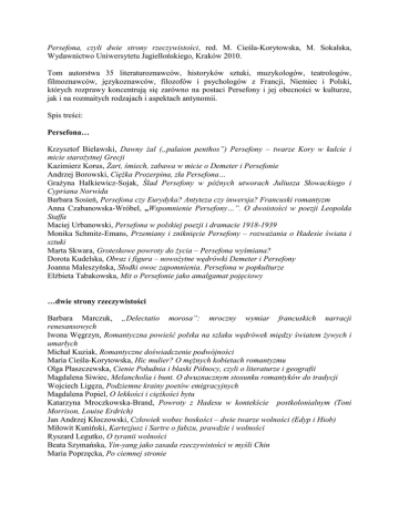 Persefona, czyli dwie strony rzeczywistości, red. M. Cieśla-Korytowska, M. Sokalska, Wydawnictwo Uniwersytetu Jagiellońskiego, Kraków 2010. Tom autorstwa 35 literaturoznawców, historyków sztuki, muzykologów, teatrologów, filmoznawców, językoznawców, filozofów i psychologów z Francji, Niemiec i Polski, których rozprawy koncentrują się zarówno na postaci Persefony i jej obecności w kulturze, jak i na rozmaitych rodzajach i aspektach antynomii. Spis treści: Persefona… Krzysztof Bielawski, Dawny żal („palaion penthos”) Persefony – twarze Kory w kulcie i micie starożytnej Grecji Kazimierz Korus, Żart, śmiech, zabawa w micie o Demeter i Persefonie Andrzej Borowski, Ciężka Prozerpina, zła Persefona… Grażyna Halkiewicz-Sojak, Ślad Persefony w późnych utworach Juliusza Słowackiego i Cypriana Norwida Barbara Sosień, Persefona czy Eurydyka? Antyteza czy inwersja? Francuski romantyzm Anna Czabanowska-Wróbel, „Wspomnienie Persefony…”. O dwoistości w poezji Leopolda Staffa Maciej Urbanowski, Persefona w polskiej poezji i dramacie 1918-1939 Monika Schmitz-Emans, Przemiany i zniknięcie Persefony – rozważania o Hadesie świata i sztuki Marta Skwara, Groteskowe powroty do życia – Persefona wyśmiana? Dorota Kudelska, Obraz i figura – nowożytne wędrówki Demeter i Persefony Joanna Maleszyńska, Słodki owoc zapomnienia. Persefona w popkulturze Elżbieta Tabakowska, Mit o Persefonie jako amalgamat pojęciowy …dwie strony rzeczywistości Barbara Marczuk, „Delectatio morosa”: mroczny wymiar francuskich narracji renesansowych Iwona Węgrzyn, Romantyczna powieść polska na szlaku wędrówek między światem żywych i umarłych Michał Kuziak, Romantyczne doświadczenie podwójności Maria Cieśla-Korytowska, Hic mulier? O mężnych kobietach romantyzmu Olga Płaszczewska, Cienie Południa i blaski Północy, czyli o literaturze i geografii Magdalena Siwiec, Melancholia i bunt. O dwuznacznym stosunku romantyków do tradycji Wojciech Ligęza, Podziemne krainy poetów emigracyjnych Magdalena Popiel, O lekkości i ciężkości bytu Katarzyna Mroczkowska-Brand, Powroty z Hadesu w kontekście postkolonialnym (Toni Morrison, Louise Erdrich) Jan Andrzej Kłoczowski, Człowiek wobec boskości – dwie twarze wolności (Edyp i Hiob) Miłowit Kuniński, Kartezjusz i Sartre o fałszu, prawdzie i wolności Ryszard Legutko, O tyranii wolności Beata Szymańska, Yin-yang jako zasada rzeczywistości w myśli Chin Maria Poprzęcka, Po ciemnej stronie Leszek Polony, Antynomie doświadczenia muzycznego w „Czarodziejskiej górze” Thomasa Manna Elżbieta Nowicka, Królowa cieni – cień w dramacie i teatrze Iwona Puchalska, Przeciwieństwa i podwojenia w „Czarodziejskim flecie” Małgorzata Sokalska, Miłość grzeszna i miłość święta, czyli Tannhäuser na rozstajach Grażyna Stachówna, Persefona w podziemiach Palais Garnier Aleksandra Tokarz, Blask i ciemność. O emocjonalnych antynomiach procesu twórczego Anita Całek, Kto pisze wielkie dzieła? O świadomości i nieświadomości w procesie twórczym Jean-Jacques Wunenburger, Dwoisty język: antynomia i ambiwalencja Renata Przybylska, Kategoria przeciwieństwa (antynomii) w ogólnym języku polskim – rekonesans badawczy