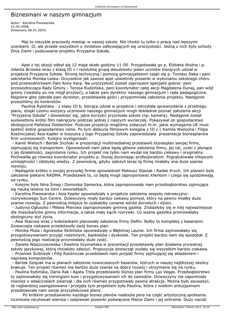 Publiczne Gimnazjum w Popielawach Biznesmani w naszym gimnazjum Autor: Karolina Piwowarska 21.05.2008. Zmieniony 06.01.2010. Maj to niezykle pracowity miesiąc w naszej szkole. Nie chodzi tu tylko o pracę nad lepszymi ocenkami :D, ale przede wszystkim o mnóstwo odbywających się uroczystości. Jedną z nich były ochody Dnia Ziemi i podsuwanie projektu Przyjazna Szkoła. Apel z tej okazji odbył się 12 maja około godziny 11:00. Przygotowała go p. Elżbieta Woźna i p. Jolanta Brzeska wraz z klasą III c i rezolutną grupą dwudziestu jeden uczniów biorących udział w projekcie Przyjazna Szkoła. Stroną techniczną i pomocą gimnazjalistom zajęli się p. Tomasz Deka i pani sekretarka Monika Łaska. Oczywiście jak zawsze apel uświetniły piosenki w wykonaniu szkolnego chóru pod przewodnictwem Pani Anny Karp. Na uroczystość zostali zaproszeni specjalni goście: pani przewodnicząca Rady Gminy - Teresa Rudzińska, pani koordynator całej akcji Magdalena Dunaj, pan wójt gminy (niestety on nie mógł przybyć), a także pani dyrektor naszego gimnazjum i rada pedagogiczna. Najpierw głos zabrała pani dyrektor, przedstawiła gości i przypomniała założenia projektu. Następnie przeszliśmy do konkretów. Paulina Rybińska - z klasy III b, biorąca udział w projekcie i odczytała sprawozdanie z przebiegu planu, dzięki czemu wszyscy uczniowie naszego gimnazjum mogli dokładnie poznać założenia akcji "Przyjazna Szkoła" i dowiedzieć się, jakie korzyści przyniosła szkole (np. kamerę). Następnie został wyświetlony krótki film nakręcony podczas jednej z naszych wycieczek. Pokazywał on gospodarstwo ekologiczne Państwa Dobiechów. Podczas projekcji mogliśmy zobaczyć m.in. jakie wymagania UE musi spełnić dobre gospodarstwo rolne. Po tym debiucie filmowym kolegów z III c ( Kamila Wielocha i Filipa Rzeźniczaka) Asia Kapler w koszulce z logo Przyjaznej Szkoły zapowiedziała prezentacje biznesplanów firm uczniowskich. Kolejno występowali: - Kamil Wieloch i Bartek Siciński w prezentacji multimedialnej przestawili biznesplan swojej firmy, zajmującej się transportem. Opowiedzieli nam jakie będą główne założenia firmy, jej cel, zyski z płynące z jej działalności, zagrożenia rynku. Ich projekt nie tylko nam wydał się bardzo ciekawy i oryginalny. Pochwaliła go również koordynator projektu p. Dunaj doceniając profesjonalizm. Pogratulowała chłopcom umiejętności i zdobytej wiedzy. Z pewnością, gdyby założyli teraz tę firmę miałaby ona duże szanse rozwoju. - Następnie krótko o swojej przyszłej firmie opowiedzieli Mateusz Stasiak i Radek Krych. Ich planem było założenie piekarni RADMA. Przedstawili to, co będą mogli zaproponować klientom i czego się spodziewają od rynku. - Kolejne były Nina Śnieg i Dominika Samecka, które zaproponowały nam przedsiębiorstwo zajmujące się nauką latania na lotni i awionetkach. - Karolina Piwowarska i Asia Kepler opowiedziały o projekcie założenia zespołu rekreacyjnorozrywkowego Sun Centre. Dziewczyny miały bardzo ciekawy pomysł, który na pewno miałby duże szanse rozwoju. Z pewnością miejsce to zyskałoby uznanie wśród dorosłych i dzieci. - Justyna Ogłuszko i Milena Mierzwa zaproponowały gminną gazetę. Znalazłyby się w niej najważniejsze dla mieszkańców gminy informacje, a także mały kącik rozrywki. Co ważne gazetka promowałaby ekologiczny styl życia. - Asia Staciwa wraz z koleżankami planowały założenie firmy Delfin. Byłby to kompleks z basenami. Dziewczęta ciekawie przedstawiły swój biznes plan. - Monika Pluta i Agnieszka Skibińska opowiedziały o Błękitnej Launie. Ich firma zajmowałaby się przygotowywaniem przyjęć rodzinnych, bankietów i dyskotek. Ten projekt bardzo nam się spodobał. Z pewnością jego realizacja przyniosłaby duże zyski. - Żaneta Waszczykowska i Ewelina Szymańska w prezentacji przedstawiły plan działania prywatnej szkoły językowej, którą chciałyby założyć. Propozycje dziewcząt wydały się wszystkim bardzo ciekawe. - Przemek Ścibiorek i Filip Rzeźniczak przedstawili nam projekt firmy zajmującej się składaniem i naprawą komputerów. - Bartek Szlęzak ma w planach założenie nowoczesnych basenów, których w naszej najbliższej okolicy brakuje. Ten projekt również ma bardzo duże szanse na dobry rozwój i utrzymanie się na rynku. - Paulina Rybińska, Daria Rak i Agata Trela przedstawiły biznes plan firmy Las Vegas. Przedsiębiorstwo to zajmowałoby się treningiem koni i przygotowywaniem ich do zawodów. Dziewczyny nie zapomniały również o właścicielach zwierząt i dla nich również przygotowały pewne atrakcje. Można było zauważyć, że najbardziej zaangażowana i przejęta tym projektem była Paulina, która z wielkim entuzjazmem przedstawiała nam swoje przyszłościowe plany. Po krótkim przestawieniu każdego biznes planów nadeszła pora na część artystyczną spotkania. Uczniowie recytowali wiersze i zaśpiewali piosenki poświęcone Matce Ziemi i jej ochronie. Duży nacisk http://gim-popielawy.pl Kreator PDF Utworzono 3 March, 2017, 16:35 Publiczne Gimnazjum w Popielawach został położony na ekologię i uświadomienie zebranym, że życie na wsi jest wspaniałe. Prezenterzy każdej firmy przedstawili aspekty ekologiczne swej działalności i przekonali nas, że nie zaszkodzi najbliższemu środowisku przyrodniczemu. Na zakończenie głos zabrała pani Woźna i wraz z naszą dyrekcją wręczyły wszystkim uczestnikom projektu Przyjazna Szkoła dyplomy i podziękowała gościom za przybycie a uczniom za wytrwałość. Także panie: Teresa Rudzińska i Magdalena Dunaj podziękowały za zaproszenie i pogratulowały wytrwałości, życząc dalszych sukcesów. Mamy nadzieję, że to spotkanie zapadnie wszystkim w pamięć. Wierzymy także, że jedno ze zdań wypowiedzianych przez naszą koleżankę: "Jakie to szczęście, że mieszkam na wsi." uzmysłowi niektórym, iż na wsi można także