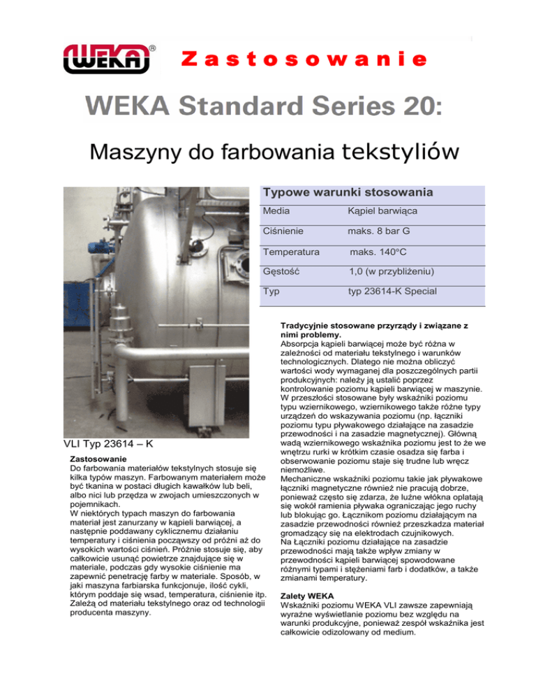 Zastosowanie Maszyny do farbowania tekstyliów Typowe warunki stosowania Media Kąpiel barwiąca Ciśnienie maks. 8 bar G Temperatura maks. 140°C Gęstość 1,0 (w przybliżeniu) Typ typ 23614-K Special VLI Typ 23614 – K Zastosowanie Do farbowania materiałów tekstylnych stosuje się kilka typów maszyn. Farbowanym materiałem może być tkanina w postaci długich kawałków lub beli, albo nici lub przędza w zwojach umieszczonych w pojemnikach. W niektórych typach maszyn do farbowania materiał jest zanurzany w kąpieli barwiącej, a następnie poddawany cyklicznemu działaniu temperatury i ciśnienia począwszy od próżni aż do wysokich wartości ciśnień. Próżnie stosuje się, aby całkowicie usunąć powietrze znajdujące się w materiale, podczas gdy wysokie ciśnienie ma zapewnić penetrację farby w materiale. Sposób, w jaki maszyna farbiarska funkcjonuje, ilość cykli, którym poddaje się wsad, temperatura, ciśnienie itp. Zależą od materiału tekstylnego oraz od technologii producenta maszyny. Tradycyjnie stosowane przyrządy i związane z nimi problemy. Absorpcja kąpieli barwiącej może być różna w zależności od materiału tekstylnego i warunków technologicznych. Dlatego nie można obliczyć wartości wody wymaganej dla poszczególnych partii produkcyjnych: należy ją ustalić poprzez kontrolowanie poziomu kąpieli barwiącej w maszynie. W przeszłości stosowane były wskaźniki poziomu typu wziernikowego, wziernikowego także różne typy urządzeń do wskazywania poziomu (np. łączniki poziomu typu pływakowego działające na zasadzie przewodności i na zasadzie magnetycznej). Główną wadą wziernikowego wskaźnika poziomu jest to że we wnętrzu rurki w krótkim czasie osadza się farba i obserwowanie poziomu staje się trudne lub wręcz niemożliwe. Mechaniczne wskaźniki poziomu takie jak pływakowe łączniki magnetyczne również nie pracują dobrze, ponieważ często się zdarza, że luźne włókna oplatają się wokół ramienia pływaka ograniczając jego ruchy lub blokując go. Łącznikom poziomu działającym na zasadzie przewodności również przeszkadza materiał gromadzący się na elektrodach czujnikowych. Na Łączniki poziomu działające na zasadzie przewodności mają także wpływ zmiany w przewodności kąpieli barwiącej spowodowane różnymi typami i stężeniami farb i dodatków, a także zmianami temperatury. Zalety WEKA Wskaźniki poziomu WEKA VLI zawsze zapewniają wyraźne wyświetlanie poziomu bez względu na warunki produkcyjne, ponieważ zespół wskaźnika jest całkowicie odizolowany od medium. Magnetyczny wskaźnik poziomu Systemy pomiarowe zawartości zbiornika Składniki kriogeniczne (niskich temperatur) Zawory INOX Do takiego zastosowania pływak magnetyczny jest elektrycznie polerowany, aby zwiększyć jego odporność na tworzenie się na jego powierzchni osadów oraz jego odporność na korozję wywoływaną przez kąpiel barwiąca. Na górze i na dole komory pływakowej znajdują się gwintowane kołki dla ułatwienia obsługi i czyszczenia, gdy zajdzie taka potrzeba. Łączniki magnetyczne do wskazywania poziomu są także całkowicie odizolowane od medium i mają długą żywotność
