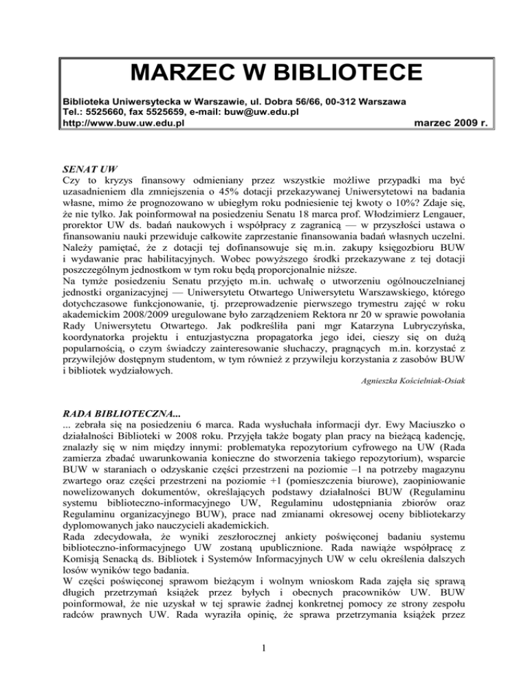 MARZEC W BIBLIOTECE Biblioteka Uniwersytecka w Warszawie, ul. Dobra 56/66, 00-312 Warszawa Tel.: 5525660, fax 5525659, e-mail: [email protected] http://www.buw.uw.edu.pl marzec 2009 r. SENAT UW Czy to kryzys finansowy odmieniany przez wszystkie moŜliwe przypadki ma być uzasadnieniem dla zmniejszenia o 45% dotacji przekazywanej Uniwersytetowi na badania własne, mimo Ŝe prognozowano w ubiegłym roku podniesienie tej kwoty o 10%? Zdaje się, Ŝe nie tylko. Jak poinformował na posiedzeniu Senatu 18 marca prof. Włodzimierz Lengauer, prorektor UW ds. badań naukowych i współpracy z zagranicą — w przyszłości ustawa o finansowaniu nauki przewiduje całkowite zaprzestanie finansowania badań własnych uczelni. NaleŜy pamiętać, Ŝe z dotacji tej dofinansowuje się m.in. zakupy księgozbioru BUW i wydawanie prac habilitacyjnych. Wobec powyŜszego środki przekazywane z tej dotacji poszczególnym jednostkom w tym roku będą proporcjonalnie niŜsze. Na tymŜe posiedzeniu Senatu przyjęto m.in. uchwałę o utworzeniu ogólnouczelnianej jednostki organizacyjnej — Uniwersytetu Otwartego Uniwersytetu Warszawskiego, którego dotychczasowe funkcjonowanie, tj. przeprowadzenie pierwszego trymestru zajęć w roku akademickim 2008/2009 uregulowane było zarządzeniem Rektora nr 20 w sprawie powołania Rady Uniwersytetu Otwartego. Jak podkreśliła pani mgr Katarzyna Lubryczyńska, koordynatorka projektu i entuzjastyczna propagatorka jego idei, cieszy się on duŜą popularnością, o czym świadczy zainteresowanie słuchaczy, pragnących m.in. korzystać z przywilejów dostępnym studentom, w tym równieŜ z przywileju korzystania z zasobów BUW i bibliotek wydziałowych. Agnieszka Kościelniak-Osiak RADA BIBLIOTECZNA... ... zebrała się na posiedzeniu 6 marca. Rada wysłuchała informacji dyr. Ewy Maciuszko o działalności Biblioteki w 2008 roku. Przyjęła takŜe bogaty plan pracy na bieŜącą kadencję, znalazły się w nim między innymi: problematyka repozytorium cyfrowego na UW (Rada zamierza zbadać uwarunkowania konieczne do stworzenia takiego repozytorium), wsparcie BUW w staraniach o odzyskanie części przestrzeni na poziomie –1 na potrzeby magazynu zwartego oraz części przestrzeni na poziomie +1 (pomieszczenia biurowe), zaopiniowanie nowelizowanych dokumentów, określających podstawy działalności BUW (Regulaminu systemu biblioteczno-informacyjnego UW, Regulaminu udostępniania zbiorów oraz Regulaminu organizacyjnego BUW), prace nad zmianami okresowej oceny bibliotekarzy dyplomowanych jako nauczycieli akademickich. Rada zdecydowała, Ŝe wyniki zeszłorocznej ankiety poświęconej badaniu systemu biblioteczno-informacyjnego UW zostaną upublicznione. Rada nawiąŜe współpracę z Komisją Senacką ds. Bibliotek i Systemów Informacyjnych UW w celu określenia dalszych losów wyników tego badania. W części poświęconej sprawom bieŜącym i wolnym wnioskom Rada zajęła się sprawą długich przetrzymań ksiąŜek przez byłych i obecnych pracowników UW. BUW poinformował, Ŝe nie uzyskał w tej sprawie Ŝadnej konkretnej pomocy ze strony zespołu radców prawnych UW. Rada wyraziła opinię, Ŝe sprawa przetrzymania ksiąŜek przez 1 pracowników UW powinna być przekazana komisji dyscyplinarnej ds. nauczycieli akademickich, a czytelników spoza UW – zewnętrznej firmie windykacyjnej. Anna Wołodko SENACKA KOMISJA DS. BIBLIOTEK I SYSTEMÓW INFORMACYJNYCH UW... ... zebrała się na posiedzeniu 11 marca. Komisja zajmowała się sprawą elektronicznej legitymacji pracowniczej. Dr Janina MincerDaszkiewicz (WMIM) poinformowała, Ŝe wdroŜenie ELP nie jest problemem technicznym. W tej chwili w obiegu są stare, papierowe legitymacje pracownicze oraz plastikowe karty biblioteczne BUW. MoŜna rozwaŜyć przekształcenie karty bibliotecznej w legitymację pracowniczą, ale przedtem naleŜy określić, jakie dokładnie funkcje ma pełnić — to mogłoby być zadanie dla KBSI. Dyr. Maciuszko dodała, Ŝe legitymacja pracownicza mogłaby takŜe słuŜyć do identyfikacji pracowników w systemie automatycznego wydruku, który BUW planuje wdroŜyć. Przewodniczący Komisji poinformował, Ŝe 23 lutego odbyło się spotkanie z władzami UW poświęcone sprawom portalu UW. Zostały wytypowane cztery wydziały, na których zostaną przeanalizowane i dokładnie opisane relacje pracowników z administracją. Ten opis jest konieczny w celu zaplanowania dalszych prac nad portalem. Komisja wysłuchała prezentacji dyr. Ewy Maciuszko na temat działalności systemu biblioteczno-informacyjnego UW w 2008 r. Przemysław Baszkiewicz (ICM) poinformował o zmianie na stanowisku Specjalisty ds. Oprogramowania i Licencji, od 15 marca zajmuje je Tadeusz Serwatka. Anna Wołodko E-CZASOPISMA W DOBIE KRYZYSU 20 marca zebrali się w BUW dyrektorzy bibliotek akademickich i PAN (ok. 60 osób) w celu ratowania strategii finansowania prenumeraty e-czasopism i baz danych dla środowiska nauki w Polsce. Niekorzystna zmiana kursów walutowych spowodowała, Ŝe, jak Polska długa i szeroka, mamy deficyt ok. 30%, jeŜeli chcielibyśmy utrzymać dostęp do e-zasobów na poziomie roku ubiegłego. Sytuacja ta juŜ kreuje deficyt budŜetowy na naszych uczelniach wobec — w najlepszym razie — niezmienionych nakładów na rozwój e-zasobów. Środkiem zaradczym powinno być, w opinii zgromadzonych, zwiększenie dotacji MNiSW dla największej i najkosztowniejszej bazy ScienceDirect z 50 do 70%. Konferencja Dyrektorów Bibliotek Akademickich Szkół Polskich (KDBASP) zwróciła się do wszystkich organów przedstawicielskich i opiniodawczych środowisk akademickich i naukowych: Konferencji Rektorów Akademickich Szkół Polskich (KRASP), Prezydium PAN, Rady Nauki i Szkolnictwa WyŜszego o optowanie za takim rozwiązaniem w rozmowach z MNiSW oraz podjęcie prac koncepcyjnych nad długofalowymi rozwiązaniami, które zapewnią polskim naukowcom dostęp do światowych zasobów informacji naukowej. Jednym ze sposo