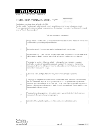 INSTRUKCJA MONTAŻU STOŁU "FLY" Dziękujemy za zakup stołu w firmie MILONI. Poniżej znajdą Państwo opis w jaki sposób należy prawidłowo zmontować zakupiony mebel. Przed przystąpieniem do montażu proszę zapoznać się z zapisami zawartymi w niniejszej instrukcji oraz w "Karcie Gwarancyjnej". Opis wykonywanych czynności 1 Wyjąć mebel z opakowania. Z uwagi na możliwość uszkodzenia mebla do otwierania kartonu nie używać ostrych przedmiotów. 2 Blat stołu, umieścić na czystym podłożu, złączami pod nogi do góry. 3 Na metalowe złącza nóg nałożyć element mocujący, następnie przyłożyć nogę stołu tak by poprzeczka górna weszła w półokrągłe gniazdo elementu mocującego. 4 5 6 7 8 Po nałożeniu nogi przykładamy od góry kolejny element mocujący i poprzez podkładkę prostokątną całość skręcamy 2 śrubami M6 na każdy z elementów mocujących. Śrub nie dokręcamy mocno, jedynie tak by nie było luzów pomiędzy elementami mocującymi i nogą. Czynności z pkt. 3 i 4 powtarzamy przy mocowaniu drugiej nogi stołu. Chwytając za nogi stołu w okolicach ich łączenia z blatem, postawić stół na równej posadzce. Ustawić nogi tak by ich górna poprzeczka znajdowała się w położeniu symetrycznym do elementów mocujących. Dolne ramiona nóg muszą stać równo na posadzce. Ewentualne nierówności podłoża można zniwelować filcem podklejonym do stopek plastikowych nogi. Po ustawieniu stołu zgodnie z pkt 6, dokręcamy wszystkie śruby M6 elementów mocujących do wyczucia wyraźnego oporu. Całość mebla wytrzeć wilgotną ścierką a następnie wytrzeć do sucha. Pozdrawiamy Zespół MILONI www.miloni.pl ver.1.0 Listopad 2012