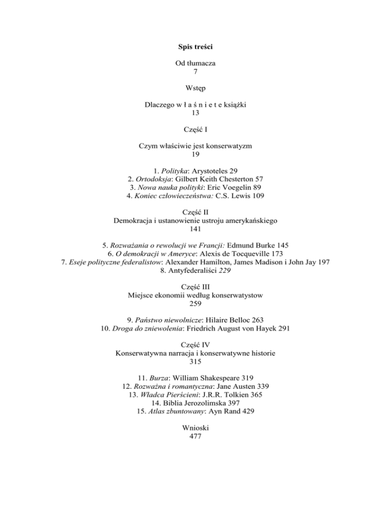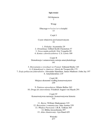 Spis treści Od tłumacza 7 Wstęp Dlaczego w ł a ś n i e t e książki 13 Część I Czym właściwie jest konserwatyzm 19 1. Polityka: Arystoteles 29 2. Ortodoksja: Gilbert Keith Chesterton 57 3. Nowa nauka polityki: Eric Voegelin 89 4. Koniec człowieczeństwa: C.S. Lewis 109 Część II Demokracja i ustanowienie ustroju amerykańskiego 141 5. Rozważania o rewolucji we Francji: Edmund Burke 145 6. O demokracji w Ameryce: Alexis de Tocqueville 173 7. Eseje polityczne federalistow: Alexander Hamilton, James Madison i John Jay 197 8. Antyfederaliści 229 Część III Miejsce ekonomii według konserwatystow 259 9. Państwo niewolnicze: Hilaire Belloc 263 10. Droga do zniewolenia: Friedrich August von Hayek 291 Część IV Konserwatywna narracja i konserwatywne historie 315 11. Burza: William Shakespeare 319 12. Rozważna i romantyczna: Jane Austen 339 13. Władca Pierścieni: J.R.R. Tolkien 365 14. Biblia Jerozolimska 397 15. Atlas zbuntowany: Ayn Rand 429 Wnioski 477