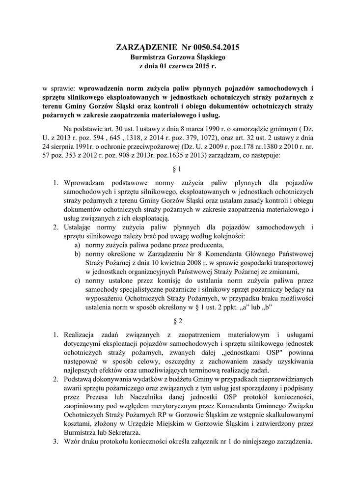 ZARZĄDZENIE Nr 0050.54.2015 Burmistrza Gorzowa Śląskiego z dnia 01 czerwca 2015 r. w sprawie: wprowadzenia norm zużycia paliw płynnych pojazdów samochodowych i sprzętu silnikowego eksploatowanych w jednostkach ochotniczych straży pożarnych z terenu Gminy Gorzów Śląski oraz kontroli i obiegu dokumentów ochotniczych straży pożarnych w zakresie zaopatrzenia materiałowego i usług. Na podstawie art. 30 ust. l ustawy z dnia 8 marca 1990 r. o samorządzie gminnym ( Dz. U. z 2013 r. poz. 594 , 645 , 1318, z 2014 r. poz. 379, 1072), oraz art. 32 ust. 2 ustawy z dnia 24 sierpnia 1991r. o ochronie przeciwpożarowej (Dz. U. z 2009 r. poz.178 nr.1380 z 2010 r. nr. 57 poz. 353 z 2012 r. poz. 908 z 2013r. poz.1635 z 2013) zarządzam, co następuje: §1 1. Wprowadzam podstawowe normy zużycia paliw płynnych dla pojazdów samochodowych i sprzętu silnikowego, eksploatowanych w jednostkach ochotniczych straży pożarnych z terenu Gminy Gorzów Śląski oraz ustalam zasady kontroli i obiegu dokumentów ochotniczych straży pożarnych w zakresie zaopatrzenia materiałowego i usług związanych z ich eksploatacją. 2. Ustalając normy zużycia paliw płynnych dla pojazdów samochodowych i sprzętu silnikowego należy brać pod uwagę według kolejności: a) normy zużycia paliwa podane przez producenta, b) normy określone w Zarządzeniu Nr 8 Komendanta Głównego Państwowej Straży Pożarnej z dnia 10 kwietnia 2008 r. w sprawie gospodarki transportowej w jednostkach organizacyjnych Państwowej Straży Pożarnej ze zmianami, c) normy ustalone przez komisję do ustalania norm zużycia paliwa przez samochody specjalistyczne pożarnicze i silnikowy sprzęt pożarniczy będący na wyposażeniu Ochotniczych Straży Pożarnych, w przypadku braku możliwości ustalenia norm w sposób określony w § 1 ust. 2 ppkt. „a” lub „b” §2 1. Realizacja zadań związanych z zaopatrzeniem materiałowym i usługami dotyczącymi eksploatacji pojazdów samochodowych i sprzętu silnikowego jednostek ochotniczych straży pożarnych, zwanych dalej „jednostkami OSP" powinna następować w sposób celowy, oszczędny z zachowaniem zasady uzyskiwania najlepszych efektów oraz umożliwiających terminową realizację zadań. 2. Podstawą dokonywania wydatków z budżetu Gminy w przypadkach nieprzewidzianych awarii sprzętu pożarniczego oraz związanych z tym usług jest sporządzony i podpisany przez Prezesa lub Naczelnika danej jednostki OSP protokół konieczności, zaopiniowany pod względem merytorycznym przez Komendanta Gminnego Związku Ochotniczych Straży Pożarnych RP w Gorzowie Śląskim ze wstępnie skalkulowanymi kosztami, złożony w Urzędzie Miejskim w Gorzowie Śląskim i zatwierdzony przez Burmistrza lub Sekretarza. 3. Wzór druku protokołu konieczności określa załącznik nr 1 do niniejszego zarządzenia. §3 Faktury i rachunki za zakup materiałów i usług o których mowa w § 2 po uzgodnieniu z pracownikiem Referatu Bezpieczeństwa Działalności Gospodarczej i Promocji Urzędu Miejskiego w Gorzowie Śląskim winny być regulowane bezgotówkowo w formie przelewu i przekazywane niezwłocznie do Urzędu Miejskiego w Gorzowie Śląskim. §4 1. W celu zapewnienia racjonalnej i oszczędnej gospodarki zużycia paliw płynnych w eksploatowanych pojazdach samochodowych oraz w pracy sprzętu silnikowego ustalam: a) podstawowe normy zużycia paliw płynnych stanowiące załącznik nr 2 do niniejszego zarządzenia, b) wykaz jednostek OSP z terenu Gminy oraz posiadanych przez nie pojazdów samochodowych oraz sprzętu silnikowego, na który przysługuje paliwo płynne stanowiący załącznik nr 3 do niniejszego zarządzenia, c) obowiązujące ilości oraz czas trwania rozruchów kontrolnych w ciągu miesiąca dla pożarniczych pojazdów samochodowych i sprzętu silnikowego stanowiące załącznik nr 4 do niniejszego zarządzenia. §5 Ustalone normy zużycia paliw płynnych stanowią podstawę do rozliczania dla pojazdów samochodowych i sprzętu silnikowego w normalnych warunkach eksploatacji i nie mogą być przekraczane. §6 W przypadku niesprawności technicznej pojazdu samochodowego lub sprzętu silnikowego powodującej przepał, należy go wycofać z eksploatacji, naprawić, zapewniając zużycie paliwa w granicach ustalonej normy. §7 1. Podstawą do rozliczania zużycia paliw pojazdów samochodowych i sprzętu silnikowego obowiązującą w jednostkach OSP są: a) dla sprzętu silnikowego „kwartalne karty pracy”, których wzór określa załącznik nr 5 do niniejszego zarządzenia, b) dla pożarniczego pojazdu samochodowego „miesięczne karty drogowe” których wzór określa załącznik nr 6 do niniejszego zarządzenia. 2. Za prawidłowe prowadzenie kart drogowych pożarniczego pojazdu samochodowego i kart pracy sprzętu silnikowego odpowiada konserwator sprzętu pożarniczego danej jednostki OSP. 3. Karty drogowe pożarniczego pojazdu samochodowego i karty pracy sprzętu silnikowego należy sporządzać czytelnie. Ewentualne pomyłki należy przekreślać pojedynczą linią, a prawidłowy zapis wpisywać obok, umieszczając parafkę osoby wypełniającej kartę. 4. W karcie drogowej pożarniczego pojazdu samochodowego i karcie pracy sprzętu silnikowego należy wpisywać wszystkie wyjazdy, użycia i rozruchy kontrolne. 5. W rozliczeniu zużytych paliw płynnych pożarniczego pojazdu samochodowego należy ich ilość zaokrąglać do jednego litra, przyjmując zużycie poniżej 0,5 jako 0 litra, a 0,5 i powyżej 0,5 jako 1 litr. Natomiast ilość zużytych paliw płynnych w przypadku dokonywania rozruchów sprzętu silnikowego nie należy zaokrąglać. 6. Rozliczanie zużycia paliw płynnych dla jednostek OSP następuje co miesiąc. Dokumenty będące podstawą rozliczenia tj. miesięczne karty drogowe pożarniczego pojazdu samochodowego oraz kwartalne karty pracy sprzętu silnikowego dostarczyć do Urzędu Miejskiego w Gorzowie Śląskim najpóźniej do 5-go dnia miesiąca. 7. Karty