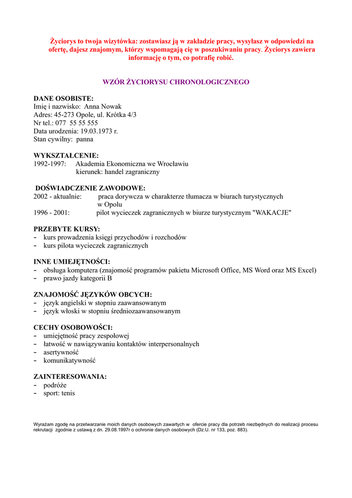 Życiorys to twoja wizytówka: zostawiasz ją w zakładzie pracy, wysyłasz w odpowiedzi na ofertę, dajesz znajomym, którzy wspomagają cię w poszukiwaniu pracy. Życiorys zawiera informację o tym, co potrafię robić. WZÓR ŻYCIORYSU CHRONOLOGICZNEGO DANE OSOBISTE: Imię i nazwisko: Anna Nowak Adres: 45-273 Opole, ul. Krótka 4/3 Nr tel.: 077 55 55 555 Data urodzenia: 19.03.1973 r. Stan cywilny: panna WYKSZTAŁCENIE: 1992-1997: Akademia Ekonomiczna we Wrocławiu kierunek: handel zagraniczny DOŚWIADCZENIE ZAWODOWE: 2002 - aktualnie: praca dorywcza w charakterze tłumacza w biurach turystycznych w Opolu 1996 - 2001: pilot wycieczek zagranicznych w biurze turystycznym "WAKACJE" PRZEBYTE KURSY: - kurs prowadzenia księgi przychodów i rozchodów - kurs pilota wycieczek zagranicznych INNE UMIEJĘTNOŚCI: - obsługa komputera (znajomość programów pakietu Microsoft Office, MS Word oraz MS Excel) - prawo jazdy kategorii B ZNAJOMOŚĆ JĘZYKÓW OBCYCH: - język angielski w stopniu zaawansowanym - język włoski w stopniu średniozaawansowanym CECHY OSOBOWOŚCI: - umiejętność pracy zespołowej - łatwość w nawiązywaniu kontaktów interpersonalnych - asertywność - komunikatywność ZAINTERESOWANIA: - podróże - sport: tenis Wyrażam zgodę na przetwarzanie moich danych osobowych zawartych w ofercie pracy dla potrzeb niezbędnych do realizacji procesu rekrutacji zgodnie z ustawą z dn. 29.08.1997r o ochronie danych osobowych (Dz.U. nr 133, poz. 883). LIST MOTYWACYJNY MÓWI: DLACZEGO INTERESUJE MNIE TA PRACA I DLACZEGO UWAŻAM, ŻE JESTEM NAJLEPSZYM KANDYDATEM. PRZYKŁADOWY LIST MOTYWACYJNY Wrocław, 12.03. 2003 r. Agata Malinowska ul. Ogólna 34/45 44-444 Jelenia Góra tel. 0111111111 I.R.B. Sp. z o.o. ul. Owsiana 14 Wałbrzych W odpowiedzi na ogłoszenie prasowe w Gazecie Wyborczej chciałabym przedstawić swoją kandydaturę na stanowisko Pracownika w Dziale Handlowym. Posiadam doświadczenia zawodowe w zakresie sprzedaży produktów i usług. Pracując w Firmie handlowej na stanowisku specjalisty ds. sprzedaży zajmowałam się min. obsługą Klienta w biurze, pozyskiwaniem Klientów, utrzymywaniem kontaktów ze stałymi Klientami, prowadzeniem dokumentacji sprzedażowej. Zajmowałam się również organizacją dowozu towaru dla Klienta, zamówieniami towarów od producentów lub dystrybutorów i ich transportem, zaopatrywaniem oddziałów w towar. W firmie usługowo-produkcyjnej do moich obowiązków należało min. pozyskiwanie Klientów, przygotowywanie ofert, prowadzenie rozmów handlowych i negocjacji, koordynowanie pracy konsultantów oraz wystawianie faktur. Dodam, że swobodnie obsługuję komputer (Word, Excel). Pracując w dziale handlowym obsługiwałam sprawnie program handlowy Sysman. Jestem osobą dynamiczną, o dużych zdolnościach interpersonalnych i organizacyjnych. W przypadku zainteresowania się Państwa moją ofertą chętnie zgłoszę się na rozmowę i będę mogła pełniej przedstawić swoją sylwetkę zawodową. Z poważaniem, A. Malinowska Wyrażam zgodę na przetwarzanie moich danych osobowych zawartych w ofercie pracy dla potrzeb niezbędnych do realizacji procesu rekrutacji zgodnie z ustawą z dn. 29.08.1997r o ochronie danych osobowych (Dz.U. nr 133, poz. 883).