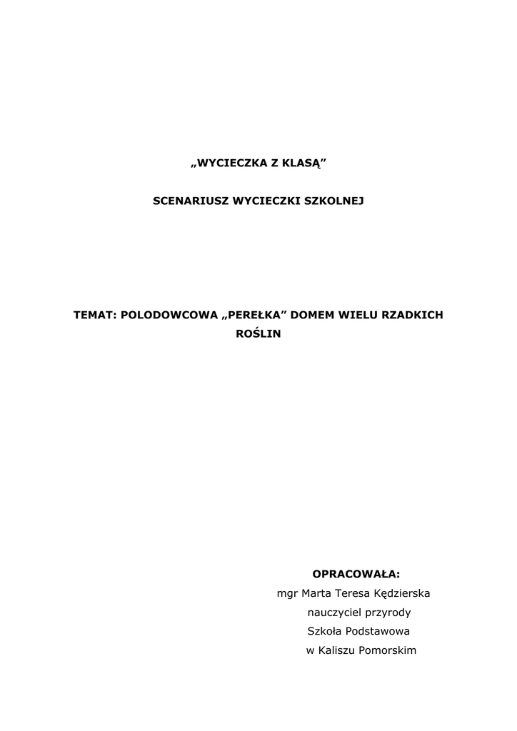 „WYCIECZKA Z KLASĄ” SCENARIUSZ WYCIECZKI SZKOLNEJ TEMAT: POLODOWCOWA „PEREŁKA” DOMEM WIELU RZADKICH ROŚLIN OPRACOWAŁA: mgr Marta Teresa Kędzierska nauczyciel przyrody Szkoła Podstawowa w Kaliszu Pomorskim CZAS: maj-czerwiec – 6 godzin KLASA: VI MIEJSCE: Ścieżka edukacyjna - jeziorko śródleśne „Perełka” (koło Kalisza Pomorskiego) RODZAJ WYCIECZKI: wycieczka piesza CELE GŁÓWNE WYCIECZKI: - wykorzystywanie naturalnego piękna jeziorek śródleśnych do rozbudzania oraz rozwijania wrażliwości estetycznej i moralnej, - rozbudzanie i rozwijanie indywidualnej aktywności twórczej, - kształtowanie pozytywnych postaw wobec tego, co stworzyła natura, - kształtowanie właściwych zachowań młodzieży dotyczących poszanowania każdej formy życia, - zapoznanie z genezą powstania jeziorka „Perełka”, - wzbogacanie swojej wiedzy o najbliższej okolicy i jej bogactwach„patriotyzm lokalny”. CELE OPERACYJNE (UCZEŃ): - stosuje poznane zasady zachowania się w lesie, - czyta mapę topograficzną, - orientuje mapę i określa kierunek świata, w jakim należy się udać, by dojść do jeziorka, - maszeruje „na azymut”, - wyszukuje i dobiera fakty, dane potrzebne do opisu wybranej rośliny, - skutecznie rozwiązuje zagadki, - skutecznie wykorzystuje dane zawarte w broszurce, - wskazuje gatunki roślin, - opowiada o wybranym gatunku rośliny, będącym przedmiotem zagadki, 2 - wyjaśnia potrzebę ochrony lasu, oczek śródleśnych jako domu roślin i zwierząt, - określa, co jest zagrożeniem dla oczek śródleśnych, - kulturalnie prowadzi dyskusję, - szkicuje roślinę, która była przedmiotem jego poszukiwań, - planuje, w jaki sposób wykorzystać wypracowane na wycieczce materiały, - prowadzi obserwacje bezpośrednie z wykorzystaniem lornetki, - występuje przed grupą, wypowiada się stosując wszelkie prawidła polskiej mowy. POMOCE: - kontrakt z „Prawem lasu” (fragmenty), - lornetki, - kompasy, - mapa terenu (z Nadleśnictwa Kalisz Pomorski), - lupy (przynajmniej 2 sztuki) - kartki z bloku rysunkowego (format A4), - ołówki, - teczka na wypracowane materiały, - opracowania wykonane na podstawie literatury fachowej spięte w broszurę (10 sztuk), - zadania - zagadki dla zespołów (10 sztuk), - „Zielony liść” - przypinka w formie broszki dla najaktywniejszych uczestników wycieczki. PRZEBIEG WYCIECZKI: I. Prace porządkowe: - zbiórka przy szkole, - sprawdzenie obecności, - podane celu i zadań wycieczki, 3 - przedstawienie leśnika- osoby wspierającej opiekuńczo i merytorycznie wycieczkę, - sprawdzenie przygotowania się do wycieczki pieszej (ubiór, drugie śniadanie, środki do szkicowania i obserwacji), - przydzielenie kompasów, - krótkie przypomnienie o zachowaniu zasad bezpieczeństwa podczas marszu ulicą i w terenie, - wymarsz zorganizowaną grupą (parami). II. Wycieczka na obrzeżach lasu: 1. Odczytanie przez leśnika kontraktu z „Prawami lasu”: - krótka dyskusja nad zakazami i nakazami w prawie leśnym, tłumaczenie ich potrzeby, - złożenie pieczęci palcem maczanym w glebie ścieżki na znak przyjęcia kontraktu. 2. Czytanie mapy - odnalezienie miejsca, gdzie leży „Perełka”. 3. Orientowanie mapy przez chętnego uczestnika wycieczki - przypomnienie, jak należy zorientować mapę. 4. Ustalenie, w jakim kierunku w terenie należy maszerować (SW): - odblokowanie kompasów - kontrolowanie na kompasie trasy wycieczki. 5. Przejście nad oczko śródleśne „Perełka”. 6. Odczytanie przez ucznia z tablicy informacyjnej opracowanej przez Nadleśnictwo Kalisz Pomorski informacji o genezie jeziorka (oczko polodowcowe) - dyskusja, zapytania uczniów, wymiana informacji. III. Poszukujemy skarbów flory jeziorka „Perełka”: 1. Podział klasy na 10 trzyosobowych zespołów. 2. Przydział broszur i losowo wybranych zagadek - zadań dla grup. 3. Praca w grupach Nazwa jakiej rośliny jest rozwiązaniem zagadki? Znajdź ją i przygotuj się do zdania krótkiej relacji o niej przed całą grupą. 4 IV. Prezentacja najcenniejszych gatunków roślin otoczenia i toni jeziorka „Perełka” Prowadzący czuwają nad prawidłowością i formą przekazu-odbioru. V. Podsumowanie wyników obserwacji i poszukiwań: - wymienianie gatunków poznanych roślin (o pięknych kwiatach, o ciekawie wykształconych liściach, trujących…), - podawanie miejsc, gdzie w okolicy Kalisza Pomorskiego można oglądać poznane gatunki roślin, - wymiana poglądów na temat realnych zagrożeń mogących doprowadzić do unicestwienia tego miejsca. VI. Relaks i planowanie: 1. Posiłek w terenie 2. Obserwacje z użyciem lupy (zapytania do prowadzących) 3. Obserwacje przez lornetkę niedostępnej w okresie lata wysepki opowiadanie leśnika o gatunkach roślin tam występujących i ich przystosowaniach. 4. Wykonanie szkicu opisywanej wcześniej rośliny z zachowaniem zasad szkicowania. 5. Zebranie szkiców jako pamiątki - dokumentu z wycieczki. 6. Podawanie pomysłów na wykorzystanie szkiców, broszury i zagadek: - sporządzenie albumu flory „Perełki” - zatrzymanie go w gabinecie przyrodniczym, oddanie do biblioteki szkolnej i miejskiej, - skanowanie szkiców na lekcjach informatyki - stworzenie bazy danych o jeziorku „Perełka” na potrzeby szkoły, miasta - w formie reklamy, - stworzenie prezentacji multimedialnej tego miejsca i szersze rozreklamowanie „Perełki”, np. przesyłając ją do innych szkół, gmin, drużyn harcerskich, przyrodników. VI. Podsumowanie pracy zespołowej i indywidualnej na zajęciach w terenie - wyróżnienie najaktywniejszych „Zielonym liściem”. 5 VII. Uporządkowanie terenu ścieżki edukacyjnej wokół jeziorka „Perełka”. Zbiórka i powrót. ANEKS I. ZAGADKI DLA GRUP: 1. Liście moje okrągławe pływają po wodzie, a wśród nich niby gwiazdy uśmiechają się kwiaty… (Grążel żółty) 2. Liście moje, jak dłonie wystają z brzegów „Perełki”, lecz ja mam siedem palców, a ty pię