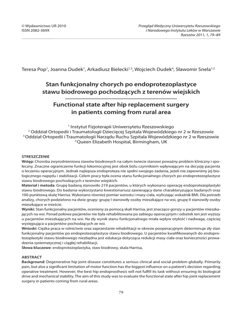 Przegląd Medyczny Uniwersytetu Rzeszowskiego i Narodowego Instytutu Leków w Warszawie Rzeszów 2011, 1, 79–89 © Wydawnictwo UR 2010 ISSN 2082-369X Teresa Pop1, Joanna Dudek1, Arkadiusz Bielecki1,3, Wojciech Dudek4, Sławomir Snela1,2 Stan funkcjonalny chorych po endoprotezoplastyce stawu biodrowego pochodzących z terenów wiejskich Functional state after hip replacement surgery in patients coming from rural area Instytut Fizjoterapii Uniwersytetu Rzeszowskiego Oddział Ortopedii i Traumatologii Dziecięcej Szpitala Wojewódzkiego nr 2 w Rzeszowie 3 Oddział Ortopedii i Traumatologii Narządu Ruchu Szpitala Wojewódzkiego nr 2 w Rzeszowie 4 Queen Elizabeth Hospital, Birmingham, UK 1 2 Streszczenie Wstęp: Choroba zwyrodnieniowa stawów biodrowych na całym świecie stanowi poważny problem kliniczny i społeczny. Znaczne ograniczenie funkcji lokomocyjnej jest obok bólu czynnikiem wpływającym na decyzję pacjenta o leczeniu operacyjnym. Jednak najlepsza endoproteza nie spełni swojego zadania, jeżeli nie zapewnimy jej biologicznego napędu i stabilizacji. Celem pracy była ocena stanu funkcjonalnego chorych po endoprotezoplastyce stawu biodrowego pochodzących z terenów wiejskich. Materiał i metoda: Grupę badaną stanowiło 219 pacjentów, u których wykonano operację endoprotezoplastyki stawu biodrowego. Do badania wykorzystano kwestionariusz zawierający dane charakteryzujące badanych oraz 100-punktową skalę Harrisa. Wykonano również pomiar wzrostu i masy ciała, wyliczając wskaźnik BMI. Dla potrzeb analizy, chorych podzielono na dwie grupy: grupę I stanowiły osoby mieszkające na wsi, grupę II stanowiły osoby mieszkające w mieście. Wyniki: Stan funkcjonalny pacjentów, oceniony za pomocą skali Harrisa, jest znacząco gorszy u pacjentów mieszkających na wsi. Ponad połowa pacjentów nie była rehabilitowana po zabiegu operacyjnym i odsetek ten jest wyższy u pacjentów mieszkających na wsi. Na zły wynik stanu funkcjonalnego miała wpływ otyłość i nadwaga, częściej występująca u pacjentów pochodzących ze wsi. Wnioski: Ciężka praca w rolnictwie oraz zaprzestanie rehabilitacji w okresie pooperacyjnym determinuje zły stan funkcjonalny pacjentów po endoprotezoplastyce stawu biodrowego. U pacjentów kwalifikowanych do endoprotezoplastyki stawu biodrowego niezbędna jest edukacja dotycząca redukcji masy ciała oraz konieczności prowadzenia systematycznej i ciągłej rehabilitacji. Słowa kluczowe: endoprotezoplastyka, staw biodrowy, skala Harrisa, Abstract Background: Degenerative hip joint disease constitutes a serious clinical and social problem globally. Primarily pain, but also a significant limitation of motor function has the biggest influence on a patient’s decision regarding operative treatment. However, the best hip endoprosthesis will not fulfill its task without ensuring its biological drive and mechanical stability. The aim of this study was to evaluate the functional state after hip joint replacement surgery in patients coming from rural areas. 79 Methods: A group of 219 patients who underwent hip replacement surgery were analyzed. A 100-point Harris’s scale as well as a self-designed questionaire was used for the analysis purposes. BMI index was calculated for all of the participants in this study. The patients were divided into the two groups: The first group contained patients from a rural area; the second group from patients living in the city. Results: Functional state of patients, evaluated using the Harris’s scale, was significantly worse in the group from rural areas. Over half of the patients were not rehabilitated after surgery and this percentage was higher in the group of patients living in rural areas. Obesity and being overweight were more common in patients coming from rural areas, which influenced the poorer outcome of functional state in this group. Conclusions: Hard work in agriculture and discontinuation of the rehabilitation process in the post-operative period determines a poor functional state of the patients after hip replacement surgery. Education regarding a body mass index reduction and the necessity of systematic and continuous rehabilitation in those patients qualified for hip replacement surgery is crucial. Key words: arthroplasty, hip joint, Harris Hip Score Wstęp Introduction Na choroby narządu ruchu cierpi kilkaset milionów ludzi na całym świecie, a według danych szacunkowych do 2020 roku liczba ta wzrośnie w wyniku spodziewanego podwojenia się liczby osób powyżej 50. roku życia. Choroby zwyrodnieniowe stawów biodrowych są główną przyczyną niesprawności u osób starszych i u 4% ludzi młodych w wieku 18–24 lat. W Polsce wg danych GUS w 1996 r. 1,5 mln Polaków z powodu zmian zwyrodnieniowych stawów kończyn dolnych miało kłopoty z lokomocją, 350 tys. z nich poruszało się wyłącznie po mieszkaniu. Główny Urząd Statystyczny szacuje, że w 2010 r. będzie 7,1 mln ludzi starszych, z czego 80% będzie cierpieć z powodu choroby zwyrodnieniowej stawów. Badania Instytutu Medycyny Wsi – jedynej w Polsce placówce naukowo-leczniczej o zasięgu ogólnokrajowym, działającej na rzecz szeroko pojętej ochrony zdrowia ludności wiejskiej dowodzą, że natężenie chorób układu mięśniowo-kostnego i tkanki łącznej wśród mieszkańców wsi, a szczególnie u kobiet i mężczyzn pracujących wyłącznie w rolnictwie, jest zdecydowanie wyższe od natężenia tych chorób wśród mieszkańców miast. Na problemy osób z chorobą zwyrodnieniową stawów zwróciła uwagę Światowa Organizacja Zdrowia, ogłaszając 13 stycznia 2000 r. w siedzibie WHO w Genewie „Dekadę Kości i Stawów” na lata 2000 –2010, uznając chorobę zwyrodnieniową za chorobę cywilizacyjną. Stawem szczególnie narażonym na zmiany zwyrodnieniowe jest staw biodrowy, a satysfakcjonującym pacjenta sposobem leczenia jest endoprotezoplasyka [1]. Do choroby zwyrodnieniowej stawów biodrowych predyspon
