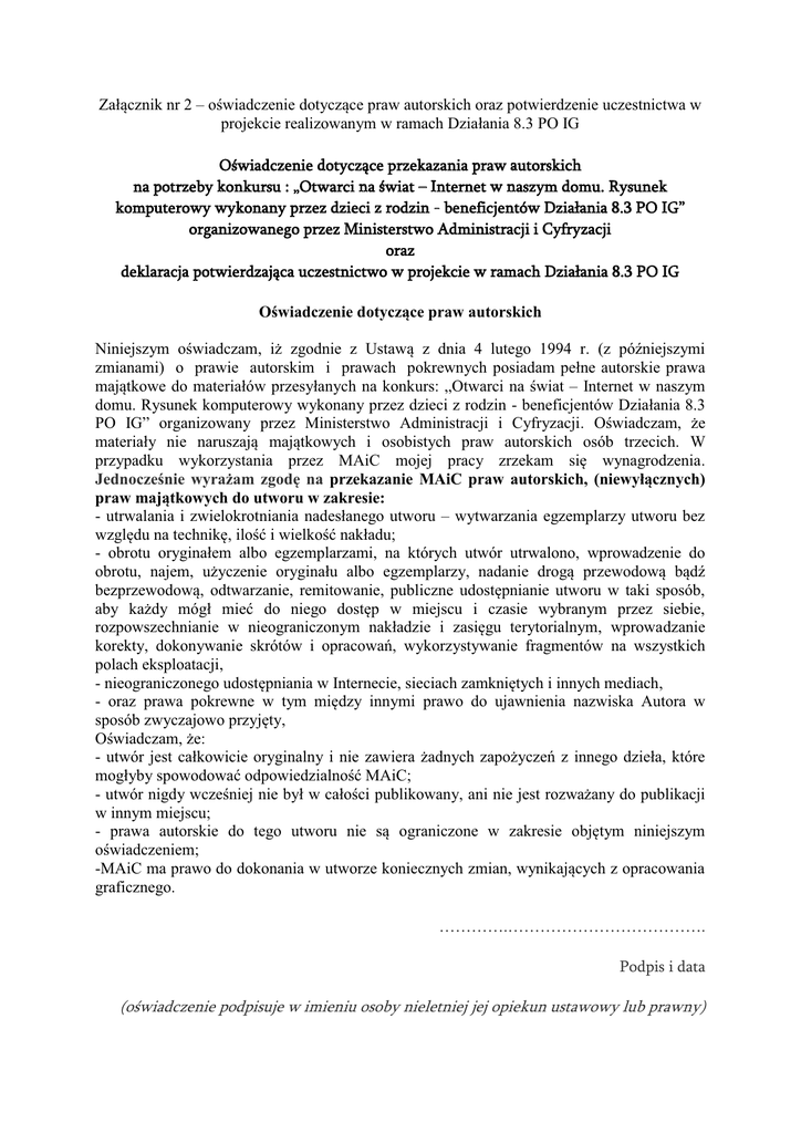 Załącznik nr 2 – oświadczenie dotyczące praw autorskich oraz potwierdzenie uczestnictwa w projekcie realizowanym w ramach Działania 8.3 PO IG Oświadczenie dotyczące przekazania praw autorskich na potrzeby konkursu : „Otwarci na świat – Internet w naszym domu. Rysunek komputerowy wykonany przez dzieci z rodzin - beneficjentów Działania 8.3 PO IG” organizowanego przez Ministerstwo Administracji i Cyfryzacji oraz deklaracja potwierdzająca uczestnictwo w projekcie w ramach Działania 8.3 PO IG Oświadczenie dotyczące praw autorskich Niniejszym oświadczam, iż zgodnie z Ustawą z dnia 4 lutego 1994 r. (z późniejszymi zmianami) o prawie autorskim i prawach pokrewnych posiadam pełne autorskie prawa majątkowe do materiałów przesyłanych na konkurs: „Otwarci na świat – Internet w naszym domu. Rysunek komputerowy wykonany przez dzieci z rodzin - beneficjentów Działania 8.3 PO IG” organizowany przez Ministerstwo Administracji i Cyfryzacji. Oświadczam, że materiały nie naruszają majątkowych i osobistych praw autorskich osób trzecich. W przypadku wykorzystania przez MAiC mojej pracy zrzekam się wynagrodzenia. Jednocześnie wyrażam zgodę na przekazanie MAiC praw autorskich, (niewyłącznych) praw majątkowych do utworu w zakresie: - utrwalania i zwielokrotniania nadesłanego utworu – wytwarzania egzemplarzy utworu bez względu na technikę, ilość i wielkość nakładu; - obrotu oryginałem albo egzemplarzami, na których utwór utrwalono, wprowadzenie do obrotu, najem, użyczenie oryginału albo egzemplarzy, nadanie drogą przewodową bądź bezprzewodową, odtwarzanie, remitowanie, publiczne udostępnianie utworu w taki sposób, aby każdy mógł mieć do niego dostęp w miejscu i czasie wybranym przez siebie, rozpowszechnianie w nieograniczonym nakładzie i zasięgu terytorialnym, wprowadzanie korekty, dokonywanie skrótów i opracowań, wykorzystywanie fragmentów na wszystkich polach eksploatacji, - nieograniczonego udostępniania w Internecie, sieciach zamkniętych i innych mediach, - oraz prawa pokrewne w tym między innymi prawo do ujawnienia nazwiska Autora w sposób zwyczajowo przyjęty, Oświadczam, że: - utwór jest całkowicie oryginalny i nie zawiera żadnych zapożyczeń z innego dzieła, które mogłyby spowodować odpowiedzialność MAiC; - utwór nigdy wcześniej nie był w całości publikowany, ani nie jest rozważany do publikacji w innym miejscu; - prawa autorskie do tego utworu nie są ograniczone w zakresie objętym niniejszym oświadczeniem; -MAiC ma prawo do dokonania w utworze koniecznych zmian, wynikających z opracowania graficznego. ………….………………………………. Podpis i data (oświadczenie podpisuje w imieniu osoby nieletniej jej opiekun ustawowy lub prawny) Deklaracja uczestnictwa w projekcie realizowanym w ramach Działania 8.3 PO IG Imię i nazwisko……………………………………………………………………………. Adres ………………………………………………………………………………………. Ja, niżej podpisany/a, niniejszym oświadczam, iż: · uczestniczę w projekcie Działanie 8.3 PO IG pod nazwą: …………………………………………………………… . podać nazwę projektu realizowanym przez: ………………………………………………………………… podać nazwę Gminy realizującej projekt · należę do grupy osób uprawnionych do skorzystania ze wsparcia zgodnie z Regulaminem uczestnictwa w projekcie. ………………………………… Miejscowość, data …………………………………………… Podpis uczestnika projektu
