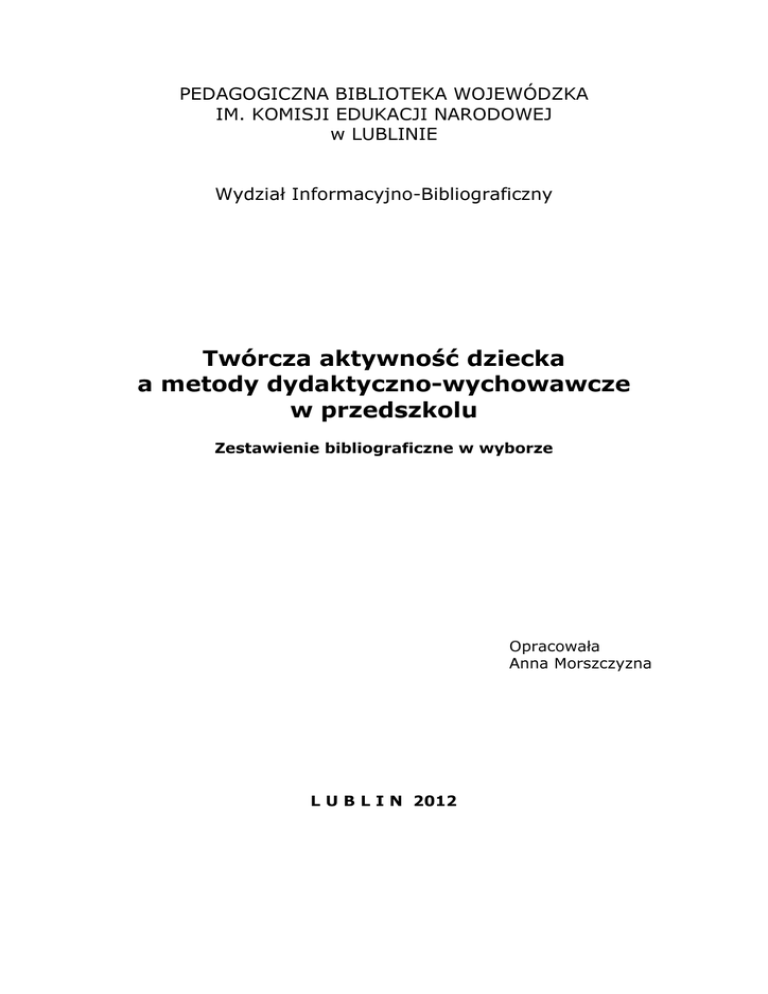 PEDAGOGICZNA BIBLIOTEKA WOJEWÓDZKA IM. KOMISJI EDUKACJI NARODOWEJ w LUBLINIE Wydział Informacyjno-Bibliograficzny Twórcza aktywność dziecka a metody dydaktyczno-wychowawcze w przedszkolu Zestawienie bibliograficzne w wyborze Opracowała Anna Morszczyzna L U B L I N 2012 Wydawnictwa zwarte 1. Aktywność dzieci i młodzieży / red. Sabina Guz, Teresa Sokołowska-Dzioba, Andrzej Pielecki ; Wyższa Szkoła Pedagogiczna Towarzystwa Wiedzy Powszechnej w Warszawie. - Warszawa : Wydaw. WSP TWP, 2008. - 248 s. 2. Ciekawość świata : o pamięci i twórczości małego dziecka / Kamila Jankowska-Siuda, Marta Komorowska. - Gdańsk : "Harmonia", 2010. - 113 s. 3. Dydaktyka twórczości : koncepcje, problemy, rozwiązania / Krzysztof J. Szmidt (red.). - Kraków : "Impuls", 2003. - 379 s. 4. Działania twórcze - twórczość wspomagająca rozwój : książka dla nauczyciela / oprac. Wiesław Karolak, Barbara Kaczorowska, Maciej Jabłoński ; aut. ćwiczeń Lidia Frydzińska-Świątczak [et al.] ; Wyższa Szkoła HumanistycznoEkonomiczna w Łodzi. - Wyd. 3. - Łódź : Wydaw. Wyższej Szkoły Humanistyczno-Ekonomicznej, 2002. - 60 s. 5. Dziecko w świecie zabawy : o kulturze, cechach i wartościach ludycznej edukacji / Bronisława Dymara red. - Kraków : "Impuls", 2009. - 475 s. Nauczyciele - Nauczycielom ; t. 16 6. Dziecko, teksty, znaczenia : konteksty edukacyjne i rozwojowe / pod red. Anny Wasilewskiej. - Gdańsk : Wydaw. Uniwersytetu Gdańskiego, 2007. - 172, s. 7. Edukacja kreatywna / pod red. Ewy A. Zwolińskiej. - Bydgoszcz : Wydaw. Akademii Bydgoskiej im. Kazimierza Wielkiego, 2005. - 394 s. 8. Edukacja małego dziecka : praca zbiorowa. T. 2, Wychowanie i kształcenie w praktyce / pod red. Ewy Ogrodzkiej-Mazur, Urszuli Szuścik, Małgorzaty Zalewskiej-Bujak. - Cieszyn : Wydział Etnologii i Nauk o Edukacji Uniwersytetu Śląskiego ; Kraków : "Impuls", 2010. - 264 s. 9. Edukacja muzyczna : tożsamość i praktyka / pod red. Andrzeja Białkowskiego. - Lublin : Wydaw. Uniwersytetu Marii Curie-Skłodowskiej, 2006. - 219 s. 10. Edukacja przez sztukę : o edukacyjnych wartościach artystycznej twórczości dziecka / Hanna Krauze-Sikorska. - Poznań : Wydaw. Naukowe UAM, 2006. 345 s. Psychologia i Pedagogika / Uniwersytet im. Adama Mickiewicza w Poznaniu, 0083-4254 ; nr 132 11. Efektywne i atrakcyjne metody pracy z dziećmi / Mariola Jąder. - Kraków : "Impuls", 2009. - 131 s. 12. Gdyby Einstein współcześnie chodził do szkoły... : dziecko i twórczość w pedagogice wczesnoszkolnej / pod red. Ewy Szatan i Doroty Bronk. Gdańsk ; Sopot : Wydaw. Uniwersytetu Gdańskiego, 2008. - 193 s. 13. Identyfikacja potencjału twórczego : teoria, metodologia, diagnostyka / pod red. Macieja Karwowskiego. - Warszawa : Wydaw. Akademii Pedagogiki Specjalnej, cop. 2009. - 300 s. 14. Inspiracje, pomysły : książka pomocnicza dla twórczego nauczyciela / Alicja Badowska [et al.]. - [Wyd. 2]. - Wrocław : "Siedmioróg", 2002. - 135 s 15. Inteligencja i zdolności twórcze dzieci w początkowym okresie edukacji : rozpoznawanie i kształcenie / Danuta Czelakowska. - Kraków : "Impuls", 2007. - 246 s. 16. Kraina kreatywności : sposoby przeciwdziałania rutynie w pracy z dziećmi poprzez ekspresję twórczą i artystyczną / Danuta Krzywoń ; przy współpr. Hewilii Hetmańczyk. - Sosnowiec : Oficyna Wydawnicza "Humanitas", 2008. 200 s. 17. Krok... w kierunku kreatywności : zabawy i ćwiczenia / Mariola Jąder. - Kraków : "Impuls", 2005. - 70 s. 18. Kształtowanie twórczych postaw dzieci pięcio-sześcioletnich : scenariusze zajęć / oprac. Elżbieta Dzionek, Małgorzata Gmosińska. - Wyd. 2.- Kraków : "Impuls", 2003. - 53 s. 19. Legendy, których nie znacie / [red. Ewa Wasilewska, Agata Sołdaj]. Warszawa : Społeczne Towarzystwo Oświatowe, 2007. - 159 s. 20. Mapping w twórczym samorozwoju i arteterapii / Wiesław Karolak. - Łódź : Wydaw. Wyższej Szkoły Humanistyczno-Ekonomicznej, 2006. – 185 s. 21. Metodyka pracy z podmiotem / Makary K. Stasiak. - Łódź : Wydaw. Wyższej Szkoły Humanistyczno-Ekonomicznej, 2007. - 120 s. 22. Moje portrety : działania twórcze - twórczość wspomagająca rozwój : książka dla nauczyciela / aut. koncepcji Wiesław Karolak ; aut. ćwiczeń Wiesław Karolak [et al.] ; Wyższa Szkoła Humanistyczno-Ekonomiczna w Łodzi. - Łódź : Wydaw. Wyższej Szkoły Humanistyczno-Ekonomicznej, 2002. – 55 s. 23. Od dzieciństwa ku młodości : psychologiczno-pedagogiczne podstawy kształcenia nauczyciela polonisty / Patrycja Huget. - Kraków : Towarzystwo Autorów i Wydawców Prac Naukowych "Universitas", cop. 2007. - S. 105-136: Rozwój twórczości 24. Pedagogika przedszkolna / Anna Klim-Klimaszewska. - Warszawa : Polski Instytut Wydawniczy, 2005. - S. 172-280: Wybrane przykłady rozwiązań metodycznych Zawiera scenariusze zajęć 25. Pedagogika przedszkolna / Anna Klim-Klimaszewska. - Warszawa : Polski Instytut Wydawniczy, 2005. - S. 129-171: Innowacje pedagogiczne w edukacji przedszkolnej 26. Pedagogika przedszkolna : nowa podstawa programowa / Anna KlimKlimaszewska. - Warszawa : "Erica", 2010. - S. 175-265: Innowacje pedagogiczne w edukacji przedszkolnej 27. Pedagogika przedszkolna : nowa podstawa programowa / Anna KlimKlimaszewska. - Warszawa : "Erica", 2010. - S. 267-363: Wybrane przykłady rozwiązań metodycznych 28. Pedagogika twórczości / Krzysztof J. Szmidt. - Gdańsk : Gdańskie Wydawnictwo Psychologiczne, 2007. - 423 s. 29. Pedagogika twórczości : idee, aplikacje, rady na twórczą drogę / Krzysztof J. Szmidt. - Wyd. 2. - Kraków : "Impuls", 2005. - 157 s. 30. Podręcznik rozwijania kreatywności : sztuka i twórczość w pracy z dziećmi / Daniela Braun ; [przekł. z jęz. niem. Magdalena Jałowiec-Sawicka]. - Kielce : "Jedność", cop. 2009. - 216 s. 31. Podróże, skarby, przygoda : podręcznik i program rozwijania twórczości, samoświadomości oraz dyspozycji autokreacyjnych dzieci klas I-III / Janina Uszyńska-Jarmoc. - Białystok : "Trans Hu
