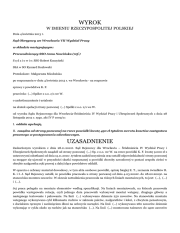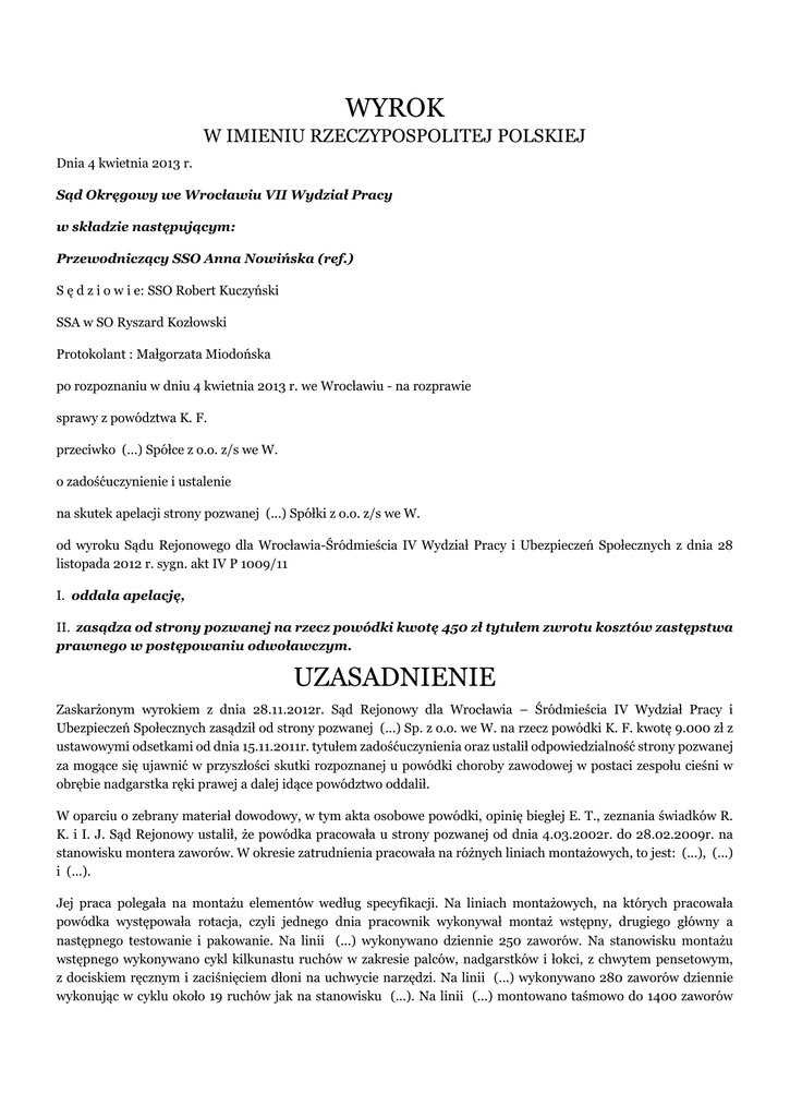 WYROK W IMIENIU RZECZYPOSPOLITEJ POLSKIEJ Dnia 4 kwietnia 2013 r. Sąd Okręgowy we Wrocławiu VII Wydział Pracy w składzie następującym: Przewodniczący SSO Anna Nowińska (ref.) S ę d z i o w i e: SSO Robert Kuczyński SSA w SO Ryszard Kozłowski Protokolant : Małgorzata Miodońska po rozpoznaniu w dniu 4 kwietnia 2013 r. we Wrocławiu - na rozprawie sprawy z powództwa K. F. przeciwko (...) Spółce z o.o. z/s we W. o zadośćuczynienie i ustalenie na skutek apelacji strony pozwanej (...) Spółki z o.o. z/s we W. od wyroku Sądu Rejonowego dla Wrocławia-Śródmieścia IV Wydział Pracy i Ubezpieczeń Społecznych z dnia 28 listopada 2012 r. sygn. akt IV P 1009/11 I. oddala apelację, II. zasądza od strony pozwanej na rzecz powódki kwotę 450 zł tytułem zwrotu kosztów zastępstwa prawnego w postępowaniu odwoławczym. UZASADNIENIE Zaskarżonym wyrokiem z dnia 28.11.2012r. Sąd Rejonowy dla Wrocławia – Śródmieścia IV Wydział Pracy i Ubezpieczeń Społecznych zasądził od strony pozwanej (...) Sp. z o.o. we W. na rzecz powódki K. F. kwotę 9.000 zł z ustawowymi odsetkami od dnia 15.11.2011r. tytułem zadośćuczynienia oraz ustalił odpowiedzialność strony pozwanej za mogące się ujawnić w przyszłości skutki rozpoznanej u powódki choroby zawodowej w postaci zespołu cieśni w obrębie nadgarstka ręki prawej a dalej idące powództwo oddalił. W oparciu o zebrany materiał dowodowy, w tym akta osobowe powódki, opinię biegłej E. T., zeznania świadków R. K. i I. J. Sąd Rejonowy ustalił, że powódka pracowała u strony pozwanej od dnia 4.03.2002r. do 28.02.2009r. na stanowisku montera zaworów. W okresie zatrudnienia pracowała na różnych liniach montażowych, to jest: (...), (...) i (...). Jej praca polegała na montażu elementów według specyfikacji. Na liniach montażowych, na których pracowała powódka występowała rotacja, czyli jednego dnia pracownik wykonywał montaż wstępny, drugiego główny a następnego testowanie i pakowanie. Na linii (...) wykonywano dziennie 250 zaworów. Na stanowisku montażu wstępnego wykonywano cykl kilkunastu ruchów w zakresie palców, nadgarstków i łokci, z chwytem pensetowym, z dociskiem ręcznym i zaciśnięciem dłoni na uchwycie narzędzi. Na linii (...) wykonywano 280 zaworów dziennie wykonując w cyklu około 19 ruchów jak na stanowisku (...). Na linii (...) montowano taśmowo do 1400 zaworów dziennie w szybkim rytmie. Od 2002r. wykonując pracę montera powódka była narażona na znaczne obciążenie ruchami powtarzalnymi w zakresie nadgarstków i chwytu pensetowego palcami. Nie informowała ona pracodawcy ani lekarza wykonującego badania okresowe o objawach zespołu cieśni nadgarstka. Powódka leczyła się na nadciśnienie tętnicze. W 2000r. przeszła usunięcie jajnika i macicy. Od tego czasu do 2006r. stosowała hormonalną terapię zastępczą. Od 2006r. nie przyjmuje leków hormonalnych. Jest praworęczna. Od 2007r. powódka odczuwała mrowienie i drętwienie palców prawej ręki. Na podstawie badania emg wykonanego w dniu 25.03.2007r. rozpoznano u powódki prawostronny zespół cieśni nadgarstka. W dniu 09.03.2009r. powódka przeszła operację prawostronnego uwolnienia nerwu ośrodkowego. Pomimo tego zespół cieśni nadgarstka ręki prawej przetrwał aczkolwiek ustąpiły dokuczliwe bóle i powódka jest samodzielna. Trwały uszczerbek na zdrowiu wskutek rozpoznanej choroby wyniósł 5 %. Powódka odczuwa bóle okresowe, kontynuuje leczenie obu rąk albowiem rozpoczyna się u niej zespól cieśni nadgarstka lewego. Orzeczeniem lekarskim nr (...) z 24.02.2010r. (...) Wojewódzki Ośrodek Medyczny Pracy orzekł o rozpoznaniu u powódki choroby zawodowej w postaci zespołu cieśni nadgarstka wskazując pozwaną jako miejsce zatrudnienia, w którym wystąpiło narażenie zawodowe stanowiące przyczynę choroby zawodowej, zaś powodem choroby zawodowej był sposób wykonywania pracy w okresie od 2002r. do 2009r. Decyzją z dnia 13.07.2010r. Państwowy Powiatowy Inspektor Sanitarny stwierdził u powódki chorobę zawodową – zespół cieśni w obrębie nadgarstka. (...) Oddział we W. wypłacił powódce jednorazowe odszkodowanie z tytułu choroby zawodowej w kwocie 3.105 zł i odmówił prawa do renty z tytułu niezdolności do pracy w związku z chorobą zawodową. W oparciu o powyższe ustalenia Sąd Rejonowy uznał, że roszczenie powódki o zadośćuczynienie za krzywdę wywołaną chorobą zawodową jest zasadne co do kwoty 9.000 zł. Zebrany materiał dowodowy pozwolił na jednoznaczne ustalenie, iż zespół cieśni nadgarstka ręki prawej stanowi chorobę zawodową, na którą powódka zapadła w okresie zatrudnienia u strony pozwanej, będąc w tym czasie narażona na znaczne obciążenie ruchami powtarzalnymi w zakresie nadgarstków i chwytu pensetowego palcami. W szczególności na takie ustalenie pozwalała opinia biegłej E. T., która wskazała, że jedną z przyczyn choroby w postaci zespołu cieśni jest charakter wykonywanej pracy polegającej na obciążeniu kończyn górnych częstymi, powtarzalnymi ruchami obejmującymi nadgarstki oraz orzeczenie lekarskie (...) Wojewódzkiego Ośrodka Medycyny Pracy z dnia 24.02.2010r., z którego wynika, że takich ruchów powódka wykonywała dziennie około 10.000. Odpowiedzialność strony pozwanej za powstanie tej choroby u powódki jest oczywiste i daje podstawę do zasądzenia na rzecz powódki zadośćuczynienie w oparciu o przepis art. 445 § 1 kc. W ocenie Sądu Rejonowego kwota 9.000 zł jest utrzymana w granicach przystających do choroby i jej następstw oraz aktualnych stosunków majątkowych w społeczeństwie. Powódka cierpiała ból oraz niedogodności związane z przeprowadzoną operacją, nadal odczuwa pewne dolegliwości. Nie jest to jednak krzywda daleko idąca, stwarzająca bardzo poważne skutki natury życiowej i zdrowotnej a nadto powódka nie stała się osobą niezdolną do pracy. Z uwagi na fakt, iż 