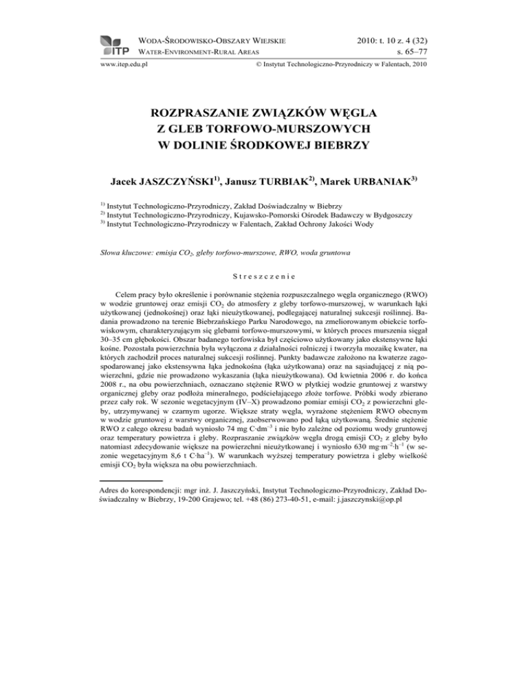 WODA-ŚRODOWISKO-OBSZARY WIEJSKIE WATER-ENVIRONMENT-RURAL AREAS www.itep.edu.pl 2010: t. 10 z. 4 (32) s. 65–77 © Instytut Technologiczno-Przyrodniczy w Falentach, 2010 ROZPRASZANIE ZWIĄZKÓW WĘGLA Z GLEB TORFOWO-MURSZOWYCH W DOLINIE ŚRODKOWEJ BIEBRZY Jacek JASZCZYŃSKI1), Janusz TURBIAK2), Marek URBANIAK3) 1) Instytut Technologiczno-Przyrodniczy, Zakład Doświadczalny w Biebrzy Instytut Technologiczno-Przyrodniczy, Kujawsko-Pomorski Ośrodek Badawczy w Bydgoszczy 3) Instytut Technologiczno-Przyrodniczy w Falentach, Zakład Ochrony Jakości Wody 2) Słowa kluczowe: emisja CO2, gleby torfowo-murszowe, RWO, woda gruntowa Streszczenie Celem pracy było określenie i porównanie stężenia rozpuszczalnego węgla organicznego (RWO) w wodzie gruntowej oraz emisji CO2 do atmosfery z gleby torfowo-murszowej, w warunkach łąki użytkowanej (jednokośnej) oraz łąki nieużytkowanej, podlegającej naturalnej sukcesji roślinnej. Badania prowadzono na terenie Biebrzańskiego Parku Narodowego, na zmeliorowanym obiekcie torfowiskowym, charakteryzującym się glebami torfowo-murszowymi, w których proces murszenia sięgał 30–35 cm głębokości. Obszar badanego torfowiska był częściowo użytkowany jako ekstensywne łąki kośne. Pozostała powierzchnia była wyłączona z działalności rolniczej i tworzyła mozaikę kwater, na których zachodził proces naturalnej sukcesji roślinnej. Punkty badawcze założono na kwaterze zagospodarowanej jako ekstensywna łąka jednokośna (łąka użytkowana) oraz na sąsiadującej z nią powierzchni, gdzie nie prowadzono wykaszania (łąka nieużytkowana). Od kwietnia 2006 r. do końca 2008 r., na obu powierzchniach, oznaczano stężenie RWO w płytkiej wodzie gruntowej z warstwy organicznej gleby oraz podłoża mineralnego, podściełającego złoże torfowe. Próbki wody zbierano przez cały rok. W sezonie wegetacyjnym (IV–X) prowadzono pomiar emisji CO2 z powierzchni gleby, utrzymywanej w czarnym ugorze. Większe straty węgla, wyrażone stężeniem RWO obecnym w wodzie gruntowej z warstwy organicznej, zaobserwowano pod łąką użytkowaną. Średnie stężenie RWO z całego okresu badań wyniosło 74 mg C·dm–3 i nie było zależne od poziomu wody gruntowej oraz temperatury powietrza i gleby. Rozpraszanie związków węgla drogą emisji CO2 z gleby było natomiast zdecydowanie większe na powierzchni nieużytkowanej i wyniosło 630 mg·m–2·h–1 (w sezonie wegetacyjnym 8,6 t C·ha–1). W warunkach wyższej temperatury powietrza i gleby wielkość emisji CO2 była większa na obu powierzchniach. Adres do korespondencji: mgr inż. J. Jaszczyński, Instytut Technologiczno-Przyrodniczy, Zakład Doświadczalny w Biebrzy, 19-200 Grajewo; tel. +48 (86) 273-40-51, e-mail: [email protected] 66 Woda-Środowisko-Obszary Wiejskie t. 10 z. 4 (32) WSTĘP Gleby powstałe z utworów torfowych torfowisk niskich, ze względu na specyficzne warunki siedliskowe, w jakich dochodzi do ich formowania, charakteryzują się bardzo dużą zawartością materiału organicznego [OKRUSZKO, PIAŚCIK, 1990]. W basenie środkowej Biebrzy, gdzie prowadzono niniejsze badania, udział części organicznych w glebach torfowo-murszowych, drugiego stopnia zmurszenia, często przekracza 80% s.m. Organiczny materiał roślinny gleby może zawierać do 45– 50% węgla w s.m. Stabilność takich ekosystemów zależy od zachowania dotychczasowych warunków siedliskowych, w dużej mierze związanych z obecnością wody. Wiele obszarów, na których występują wspomniane gleby, w przeszłości zmeliorowano i obecnie są one, z różną intensywnością, użytkowane rolniczo. Następują wówczas przemiany utworu glebowego, związane z często opisywanymi w literaturze procesami mineralizacji, murszenia i rozpraszania składników nawozowych [OKRUSZKO, 1992; 1993; SZYMANOWSKI, 1999]. Wśród konsekwencji tych niekorzystnych zmian należy wymienić uwalnianie z gleby i wymywanie do zasobów wodnych rozpuszczalnych form węgla organicznego (RWO) [MOORE, 1997; SAPEK, 2009; JASZCZYŃSKI, 2009] oraz emisję CO2 do atmosfery [CZAPLAK, DEMBEK, 2000; MERCIK i in., 1999; MIATKOWSKI, TURBIAK, 2006; TURBIAK, 2009]. Te dwa parametry są traktowane jako wskaźniki aktywności mikrobiologicznej gleby, prowadzącej do rozkładu i transformacji materii organicznej. Rozmiar strat związków węgla z gleby wymienionymi drogami, a także wpływ różnych czynników intensyfikujących w określonych warunkach te zjawiska, nie są dostatecznie rozpoznane. Wiele pytań, w obrębie opisywanych zagadnień, jest związanych z potencjalnym wpływem sposobu użytkowania na wielkość strat związków węgla z rolniczo zagospodarowanych gleb pobagiennych. Ważne w tym aspekcie wydają się być również procesy zachodzące w glebie po zaniechaniu użytkowania, na wcześniej zagospodarowanych kośnie, użytkach zielonych. Celem pracy było określenie i porównanie stężenia RWO w wodzie gruntowej oraz emisji CO2 do atmosfery z gleby torfowo-murszowej w warunkach łąki użytkowanej (jednokośnej) oraz łąki nieużytkowanej, podlegającej naturalnej sukcesji roślinnej. OBIEKT I METODY BADAŃ Badania prowadzono na terenie Biebrzańskiego Parku Narodowego, w basenie środkowej Biebrzy, od kwietnia 2006 r. do końca 2008 r., w części położonej między kompleksem leśnym Lasów Ciszewskich i starym korytem rzeki Ełk (rys. 1). Obszar ten został zmeliorowany w latach 70. XX w. Obecnie w krajobrazie tej części torfowiska występuje mozaika rolniczo użytkowanych łąk ekstensywnych i powierzchni, na których obserwuje się postępującą naturalną sukcesję roślinną. Jeden J. Jaszczyński i in.: Rozpraszanie związków węgla z gleb torfowo-murszowych… 67 Rys. 1. Lokalizacja punktów badawczych: K – łąka użytkowana, N – łąka nieużytkowana Fig. 1. Location of study sites: K – mown meadow, N – not mown meadow z punktów badawczych (K) usytuowano na powierzchni łąkowej (ok. 1,5 ha), uży
