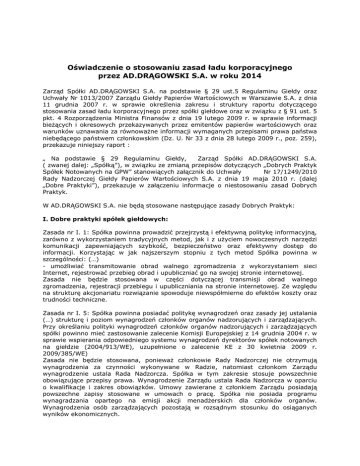 Oświadczenie o stosowaniu zasad ładu korporacyjnego przez AD.DRĄGOWSKI S.A. w roku 2014 Zarząd Spółki AD.DRĄGOWSKI S.A. na podstawie § 29 ust.5 Regulaminu Giełdy oraz Uchwały Nr 1013/2007 Zarządu Giełdy Papierów Wartościowych w Warszawie S.A. z dnia 11 grudnia 2007 r. w sprawie określenia zakresu i struktury raportu dotyczącego stosowania zasad ładu korporacyjnego przez spółki giełdowe oraz w związku z § 91 ust. 5 pkt. 4 Rozporządzenia Ministra Finansów z dnia 19 lutego 2009 r. w sprawie informacji bieżących i okresowych przekazywanych przez emitentów papierów wartościowych oraz warunków uznawania za równoważne informacji wymaganych przepisami prawa państwa niebędącego państwem członkowskim (Dz. U. Nr 33 z dnia 28 lutego 2009 r., poz. 259), przekazuje niniejszy raport : „ Na podstawie § 29 Regulaminu Giełdy, Zarząd Spółki AD.DRĄGOWSKI S.A. ( zwanej dalej: „Spółką”), w związku ze zmianą przepisów dotyczących „Dobrych Praktyk Spółek Notowanych na GPW” stanowiących załącznik do Uchwały Nr 17/1249/2010 Rady Nadzorczej Giełdy Papierów Wartościowych S.A. z dnia 19 maja 2010 r. (dalej „Dobre Praktyki”), przekazuje w załączeniu informacje o niestosowaniu zasad Dobrych Praktyk. W AD.DRĄGOWSKI S.A. nie będą stosowane następujące zasady Dobrych Praktyk: I. Dobre praktyki spółek giełdowych: Zasada nr I. 1: Spółka powinna prowadzić przejrzystą i efektywną politykę informacyjną, zarówno z wykorzystaniem tradycyjnych metod, jak i z użyciem nowoczesnych narzędzi komunikacji zapewniających szybkość, bezpieczeństwo oraz efektywny dostęp do informacji. Korzystając w jak najszerszym stopniu z tych metod Spółka powinna w szczególności: (…) - umożliwiać transmitowanie obrad walnego zgromadzenia z wykorzystaniem sieci Internet, rejestrować przebieg obrad i upubliczniać go na swojej stronie internetowej. Zasada nie będzie stosowana w części dotyczącej transmisji obrad walnego zgromadzenia, rejestracji przebiegu i upubliczniania na stronie internetowej. Ze względu na strukturę akcjonariatu rozwiązanie spowoduje niewspółmierne do efektów koszty oraz trudności techniczne. Zasada nr I. 5: Spółka powinna posiadać politykę wynagrodzeń oraz zasady jej ustalania (…) strukturę i poziom wynagrodzeń członków organów nadzorujących i zarządzających. Przy określaniu polityki wynagrodzeń członków organów nadzorujących i zarządzających spółki powinno mieć zastosowanie zalecenie Komisji Europejskiej z 14 grudnia 2004 r. w sprawie wspierania odpowiedniego systemu wynagrodzeń dyrektorów spółek notowanych na giełdzie (2004/913/WE), uzupełnione o zalecenie KE z 30 kwietnia 2009 r. 2009/385/WE) Zasada nie będzie stosowana, ponieważ członkowie Rady Nadzorczej nie otrzymują wynagrodzenia za czynności wykonywane w Radzie, natomiast członkom Zarządu wynagrodzenie ustala Rada Nadzorcza. Spółka w tym zakresie stosuje powszechnie obowiązujące przepisy prawa. Wynagrodzenie Zarządu ustala Rada Nadzorcza w oparciu o kwalifikacje i zakres obowiązków. Umowy zawierane z członkiem Zarządu posiadają powszechne zapisy stosowane w umowach o pracę. Spółka nie posiada programu wynagradzania opartego na emisji akcji menadżerskich dla członków organów. Wynagrodzenia osób zarządzających pozostają w rozsądnym stosunku do osiąganych wyników ekonomicznych. Zasada I. 9. Spółka powinna zapewnić zrównoważony udział kobiet i mężczyzn w wykonywaniu funkcji zarządu i nadzoru w przedsiębiorstwach, wzmacniając w ten sposób kreatywność i innowacyjność w prowadzonej przez spółkę działalności gospodarczej. Aktualna struktura zatrudnienia w obrocie nieruchomościami, gdzie znacząco przeważają kobiety uniemożliwia zrównoważony udział kobiet i mężczyzn, ze względu na to nie jest możliwe wprowadzenie zwiększonego udziału mężczyzn w zarządzaniu i nadzorowaniu Spółką. Emitent prowadzi politykę powoływania w skład organów osób kompetentnych, kreatywnych oraz posiadających odpowiednie doświadczenie zawodowe i wykształcenie. III. Dobre praktyki stosowane przez członków Rady Nadzorczej W związku z uchyleniem pkt. III. 7, Emitent zmienia uzasadnienie w sprawie nie stosowania rekomendacji zawartej w pkt. III. 8. Zasada III. 8. W zakresie zadań i funkcjonowania komitetów działających w radzie nadzorczej powinien być stosowany Załącznik I do Zalecenia Komisji Europejskiej z dnia 15 lutego 2005 r. dotyczącego roli dyrektorów nie wykonawczych (...). Emitent stoi na stanowisku, iż w chwili obecnej wyodrębnianie w pięcioosobowym składzie Rady Nadzorczej odrębnych komitetów nie znajduje uzasadnienia. IV. Dobre praktyki stosowane przez akcjonariuszy: Zasada nr IV. 1. Zgodnie z którą przedstawicielom mediów powinno się umożliwiać obecność na walnych zgromadzeniach. Spółka przekazuje do wiadomości publicznej wszystkie wymagane przepisami prawa informacje, w jej opinii udział w walnych zgromadzeniach przedstawicieli mediów nie przyczyni się do poprawienia wiedzy o tematach tam omawianych. Zasada nr IV. 10. Spółka powinna zapewnić akcjonariuszom możliwość udziału w walnym zgromadzeniu przy wykorzystaniu środków komunikacji elektronicznej, polegającego na: 1) transmisji obrad walnego zgromadzenia w czasie rzeczywistym, 2) dwustronnej komunikacji w czasie rzeczywistym, w ramach której akcjonariusze mogą wypowiadać się w toku obrad walnego zgromadzenia przebywając w miejscu innym niż miejsce obrad, 3) wykonywaniu osobiście lub przez pełnomocnika prawa głosu w toku walnego zgromadzenia. Możliwości techniczne oferowane w chwili obecnej uniemożliwiają skuteczne wprowadzenie tej zasady. Dotyczy to w szczególności przekazu multimedialnego w czasie rzeczywistym, między innymi ze względu na dużą ilość przesyłanych danych, powstaje ryzyko związane z zerwaniem połączenia podczas wydarzenia, czy też opóźnieni