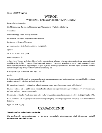 Sygn. akt III K 245/15 WYROK W IMIENIU RZECZYPOSPOLITEJ POLSKIEJ Dnia 15 kwietnia 2016 r. Sąd Rejonowy dla m. st. Warszawy w Warszawie Wydział III Karny w składzie: Przewodniczący – SSR Maciej Jabłoński Protokolant – stażysta Magdalena Mazurkiewicz Prokurator – Krzysztof Szczerba po rozpoznaniu w dniach: 10.03.2016r., 15.04.2016r. sprawy: M. H. – s. N. i G., ur. (...) w R. oskarżonego o to, że: w dniu (...) w W. przy ul. (...) ze sklepu (...) Sp. z o.o. dokonał zaboru w celu przywłaszczenia mienia w postaci jednej sztuki koszulki T-shirt (...), czym działał na szkodę sklepu (...) Sp. z o.o. powodując straty w kwicie 499 złotych, przy czym czynu tego dopuścił się po odbyciu kary co najmniej 6 miesięcy pozbawiania wolności będąc uprzednio skazany za umyślne przestępstwo podobne w okresie ostatnich 5 lat, tj. o czyn art. 278 § 1 kk w zw. z art. 64 § 1 kk orzeka: I. Oskarżonego M. H. uznaje za winnego dokonania zarzucanego mu czynu i za to na podstawie art. 278 § 1 kk wymierza mu karę 3 (trzech) miesięcy pozbawienia wolności. II. na podstawie art. 63 § 1 kk zalicza oskarżonemu na poczet kary okres zatrzymania od (...) do (...) III. na podstawie art. 44 § 2 kk orzeka przepadek dowodu rzeczowego wymienionego w wykazie dowodów rzeczowych na k. 62 pod poz. 1 poprzez zniszczenie. IV. zasądza od Skarbu Państwa na rzecz adw. M. T.. wynagrodzenie za obronę z urzędu w kwocie 504 złote plus VAT. V. na podstawie art. 624 § 1 kpk zwalnia oskarżonego od opłaty, a koszty postępowania przejmuje na rachunek Skarbu Państwa. Sygn. akt III K 245/15 UZASADNIENIE Wyroku z dnia 15 kwietnia 2016 roku Na podstawie zgromadzonego w sprawie materiału dowodowego Sąd Rejonowy ustalił następujący stan faktyczny: M. H. w dniu (...) roku udał się do sklepu (...) mieszczącego się przy Alejach (...) w W. z zamiarem kradzieży, w tym celu wziął ze sobą cążki, które miały służyć mu do zerwania zabezpieczenia. M. H. do sklepu (...) wszedł około godziny (...). Następnie udał się do działu z koszulkami, wziął ze stolika trzy koszulki typu t-shirt, dwie czarne i jedną białą, następnie udał się z nimi do przymierzalni znajdującej się na drugim końcu sklepu. Cążkami uszkodził zabezpieczenia czarnej koszulki, którą następnie schował pod spodnie. W przymierzalni uszkodził również drugą koszulkę, demontując klipsy, co spowodowało jej rozerwanie. Około godziny (...) M. H. wyszedł z przymierzalni niosąc ze sobą dwie koszulki w ręku – białą i czarną. Później odłożył je na stoliku z którego je zabrał. Po czym udał się do wyjścia. Po przekroczeniu przez M. H. linii bramek, bramki włączyły się i pracownicy ochrony J. M. i R. N. (1) zatrzymali go. Pracownik ochrony R. N. (1) stwierdził, że jednej czarnej koszulki brakuje, zaś jedna pozostawiona na stoliku przez M. H. jest uszkodzona i nie posiada zabezpieczenia w postaci dwóch klipsów. Po dokonaniu kontroli M. H. ujawniono brakujący towar w postaci jednej koszulki t-shirt o numerze (...) o wartości 499 zł, którą M. H. miał schowaną w spodniach za pasem. Na miejsce pracownicy ochrony wezwali policję. M. H. został zatrzymany. M. H. popełnił w ciągu 5 lat po odbyciu kary 5 lat i 6 miesięcy pozbawienia wolności orzeczonej wyrokiem Sądu Rejonowego dla Warszawy – Śródmieścia w Warszawie z dnia 17.11.2009r., w sprawie o sygn. akt V K 422/09, którą odbył w okresie od (...) do (...) W wyniku prowadzonego postępowania Sąd Rejonowy dla m. st. Warszawy w W. postanowieniem z dnia (...) umorzył postępowanie karne wobec M. H. w zakresie czynu z art. 288 § 1 k.k. w zw. z art. 64 § 1 k.k. na podstawie art. 17 § 1 pkt. 10 k.p.k. Powyższy stan faktyczny Sąd ustalił na podstawie następujących dowodów: Wyjaśnień oskarżonego (k.48-49, k.202), zeznania świadka T. K. (k.28, k.203), zeznania świadka J. M. (k.58-59, k.203), zeznania świadka R. N. (1) (k.204), protokół zatrzymania osoby (k.2, 11-12, 54-56), protokół przeszukania (k.5-7), protokół oględzin (k.23-24, 50), wykaz dowodów rzeczowych (k.62), karta karna (k.69-70), odpis wyroku i pismo (k.83-85), opinie (k.194, 216), pismo (k.217). Oskarżony M. H. przesłuchiwany w toku postępowania przygotowawczego w dniu (...)roku przyznał się do popełnienia zarzucanego mu czynu i wyjaśnił, iż zaboru koszulki o wartości ok. 500 złotych dokonał w sklepie (...) w W. przy Alejach (...) w dniu (...) Wyjaśnił, że wchodząc do sklepu miał zamiar dokonania zaboru, w tym celu wziął ze sobą cążki, które miały służyć do usunięcia zabezpieczeń. Dodał, że ze sklepu wziął 3 sztuki koszulek 2 czarne i 1 białą każda o wartości około 500 zł. Następnie podał, że w przymierzalni uszkodził zabezpieczenia cążkami, na jednej koszulce, którą schował pod spodnie, zaś drugą koszulkę uszkodził demontując klipsy i powodując jej rozerwanie. W związku z tym że w przymierzalni wisiały również inne koszulki, pozostawione przez innych klientów lecz inne niż te które wziął ze sobą, postanowił, wziąć z jedną z nich żeby zgadzały się dokładnie sztuki i łącznie odłożył 3 sztuki, na to samo miejsce. Następnie udał się do wyjścia, gdy przechodził przez bramki, zaczęły piszczeć. Nadmienił, że po chwili został ujęty przez pracowników ochrony. Pracownicy zapytali czy ma koszulkę, on powiedział, że ma i wyjął ją ze spodni Dodał, że czynu tego dokonał gdyż miał kilka dni wolnych, nie miał pracy i nie zarabiał pieniędzy. (k.48-49). Na rozprawie w dniu (...) M. H. przyznał się do popełnienia zarzucanego mu czynu i skorzystał z prawa złożenia wyjaśnień. Odpowiadał na pytania. Na pytanie obrońcy podniósł, że pracował oficjalnie na umowę o pracę, dodał, że jak wszedł do sklepu nie patrzył na ceny i nie wiedział jakiej wartości jest koszulka którą zabrał, nadmienił, że nie wie po co wyniósł tą koszulkę i co ch