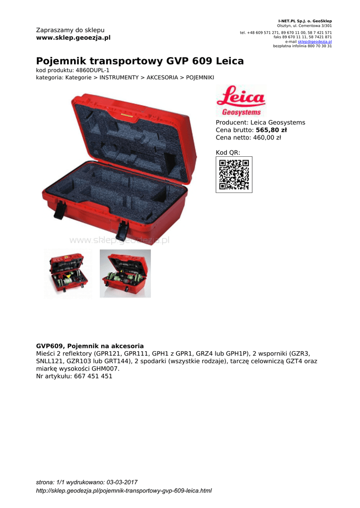 Zapraszamy do sklepu www.sklep.geoezja.pl I-NET.PL Sp.J. o. GeoSklep Olsztyn, ul. Cementowa 3/301 tel. +48 609 571 271, 89 670 11 00, 58 7 421 571 faks 89 670 11 11, 58 7421 871 e-mail [email protected] bezpłatna infolinia 800 70 30 31 Pojemnik transportowy GVP 609 Leica kod produktu: 4860DUPL-1 kategoria: Kategorie > INSTRUMENTY > AKCESORIA > POJEMNIKI Producent: Leica Geosystems Cena brutto: 565,80 zł Cena netto: 460,00 zł Kod QR: GVP609, Pojemnik na akcesoria Mieści 2 reflektory (GPR121, GPR111, GPH1 z GPR1, GRZ4 lub GPH1P), 2 wsporniki (GZR3, SNLL121, GZR103 lub GRT144), 2 spodarki (wszystkie rodzaje), tarczę celowniczą GZT4 oraz miarkę wysokości GHM007. Nr artykułu: 667 451 451 strona: 1/1 wydrukowano: 03-03-2017 http://sklep.geodezja.pl/pojemnik-transportowy-gvp-609-leica.html