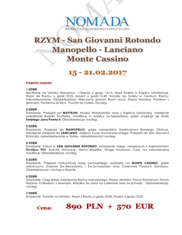 M O ! RZYM - San Giovanni Rotondo Manopello - Lanciano ! Monte Cassino ! N ! 15 - 21.02.2017 ! Program wyjazdu 1 DZIEŃ Spotkanie na lotnisku Warszawa – Okęcie o godz. 10:15. Msza Święta w Kaplicy Lotniskowej. Wylot do Rzymu o godz.13:25, przylot o godz.15:45. Transfer do hotelu w Centrum Rzymu. Zakwaterowanie. Obiadokolacja. Wieczorny spacer: Rzym nocą: Piazza Navona, Panteon z zewnątrz, Fontanna di Trevi. Powrót do hotelu. Nocleg. 2 DZIEŃ Śniadanie. Przejazd na WATYKAN, Muzea Watykańskie wraz z Kaplicą Sykstyńską, następnie zwiedzanie Bazyliki Św.Piotra. Modlitwa w Kaplicy św.Sebastiana, gdzie znajduje się Grób Świętego Jana Pawła II. Obiadokolacja, nocleg. 3 DZIEŃ Śniadanie. Przejazd do MANOPELLO, gdzie nawiedzimy Sanktuarium Boskiego Oblicza. Następnie przejazd do LANCIANO, miejsca Cudu Eucharystycznego. Przejazd do San Giovanni Rotondo, zakwaterowanie w hotelu, obiadokolacja i nocleg. 4 DZIEŃ Śniadanie. Pobyt w SAN GIOVANNI ROTONDO, zwiedzanie miejsc związanych z kapłaństwem Św.Ojca PIO, Kościół Antyczny, Nowa Bazylika, Droga Krzyżowa. Czas na indywidualną modlitwę. Obiadokolacja, nocleg. 5 DZIEŃ Śniadanie. Przejazd malowniczą trasą zachodniego wybrzeża na MONTE CASSINO, gdzie zobaczymy Klasztor Św.Benedykta i Św.Scholastyki oraz Cmentarz Polskich Żołnierzy. Obiadokolacja i nocleg w Rzymie. 6 DZIEŃ Śniadanie. Ciąg dalszy zwiedzania Rzymu starożytnego: Piazza Venezia, Forum Romanum, Forum Trajana, Colloseum z zewnątrz. Bazylika św.Jana na Lateranie oraz św.Schody. Obiadokolacja, nocleg. ! 7 DZIEŃ Śniadanie. Transfer na lotnisko. Wylot z Rzymu o godz.10:05. Przylot o godz.12:25. Cena: ! 890 PLN + 570 EUR M Cena zawiera: ! N O ❖ Bilety lotnicze na trasie Warszawa /Okęcie/ – Rzym /Fiumicino/ – Warszawa /Okęcie/ liniami włoskimi ALITALIA ❖ Zakwaterowanie: 4 noclegi w hotelu 3* przy Stazione Termini w centrum Rzymu hotel sieci www.sebraelihotels.com, 2 noclegi w Hotelu 3* w San Giovanni Rotondo ❖ Wyżywienie: śniadania wzmocnione, obiadokolacje z napojami /woda, wino/ ❖ Transfer z lotniska do hotelu ❖ Transport autokarem włoskim na całej trasie zgodnie z programem ❖ Opłata klimatyczna w Rzymie ❖ Bilety komunikacji miejskiej przejazdu po Rzymie ❖ Bilet wstępu do Muzeów Watykańskich ❖ Przewodnik miejscowy w Rzymie ❖ Przewodnik miejscowy po San Giovanni Rotondo ❖ Ubezpieczenie pełne zawierające choroby przewlekłe: KL 20 000 EUR, NW 2 000 EUR, bagaż 200 EUR ❖ Zestaw urządzeń do oprowadzania grupowego Radioguide ® firmy VOX POLSKA Cena nie obejmuje: ! ❖ Dopłaty do pokoju 1 osobowego w wysokości 160 EUR ❖ Własnych wydatków Biuro zastrzega sobie ewentualne zmiany programu w związku z miejscowymi realiami Dla zapewnienia wysokiego komfortu usług NOMADA gwarantuje swoim pielgrzymom urządzenia systemu oprowadzania grupowego Radioguide ® firmy VOX POLSKA www.voxpolska.pl ! ZAPRASZAMY UL.POZNANSKA 23/28 * 00-685 WARSZAWA * TEL:0048 22 625 44 18, TEL:0048 22 625 55 11 Pekao S.A. V O/WARSZAWA, NR 25 1240 1066 1111 0000 0000 1733 * NIP 526-020-51-09 Konto w EUR: PL 73 1240 1066 1978 0010 2186 3674; Konto w USD: PL 09 1240 1066 1787 0010 2005 9409 http//: www.nomada.org.pl, e-mail: [email protected]