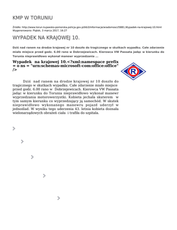 KMP W TORUNIU Źródło: http://www.torun.kujawsko-pomorska.policja.gov.pl/kb3/informacje/wiadomosci/5881,Wypadek-na-krajowej-10.html Wygenerowano: Piątek, 3 marca 2017, 16:27 WYPADEK NA KRAJOWEJ 10. Dziś nad ranem na drodze krajowej nr 10 doszło do tragicznego w skutkach wypadku. Całe zdarzenie miało miejsce przed godz. 6.00 rano w Dobrzejewicach. Kierowca VW Passata jadąc w kierunku do Torunia nieprawidłowo wykonał manewr wyprzedzania ... Wypadek na krajowej 10.<?xml:namespace prefix = o ns = "urn:schemas-microsoft-com:office:office" /> Dziś nad ranem na drodze krajowej nr 10 doszło do tragicznego w skutkach wypadku. Całe zdarzenie miało miejsce przed godz. 6.00 rano w Dobrzejewicach. Kierowca VW Passata jadąc w kierunku do Torunia nieprawidłowo wykonał manewr wyprzedzania motorowerzystki. Kobieta jechała skuterem w tym samym kierunku co wyprzedzający ją samochód. W skutek nieprawidłowo wykonanego manewru pojazd uderzył w jednoślad. W wyniku tego uderzenia 43. letnia kobieta doznała wielonarządowych obrażeń ciała i trafiła do szpitala. nadkom. Wioletta Dąbrowska KMP Toruń Oficer Prasowy Autor: torun Publikacja: torun Ocena: 0/5 (0) Tweetnij