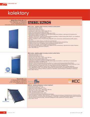 ENERGIA kolektory reklama Stiebel-Eltron Polska Sp. z o.o. 02-237 Warszawa, ul. Instalatorów 9 tel. 22 609 20 30, faks 22 609 20 29 e-mail: [email protected] www.stiebel-eltron.pl, www.pakiety-solarne.pl SOL 27 plus – kolektor płaski cieczowy, montaż na połaci dachu § sprawność kolektora: 80,4%; § powierzchnia brutto: 2,63 m2; § powierzchnia absorbera: 2,39 m2; § wymiary (dł.×szer.×wys.): 2205×1195×106 mm; § ciężar bez czynnika grzewczego: 48,50 kg; § maksymalna temperatura postojowa (stagnacji): 213°C; § jednostkowe natężenie przepływu czynnika grzewczego przez kolektor w odniesieniu do powierzchni jednostkowej kolektora: 50–300 dm3/h; § absorber: aluminiowy z aktywną wysokoselektywną powłoką z trwałej warstwy Miro-Therm, rury miedziane zgrzewane laserowo (> 600 punktów na metr); § izolacja i obudowa: wełna mineralna klasy WLG 040, rama aluminiowa, jednowarstwowa tafla szklana gr. 4 mm; § samoczyszcząca płyta szklana o strukturze pryzmatycznej; § zabezpieczenie przed osiadaniem kurzu na szybie solarnej od strony wewnętrznej; § możliwy montaż na już istniejącym dachu niezależnie od jego pokrycia; § możliwość pionowego i poziomowego montażu kolektora; § stosowany do przygotowania ciepłej wody użytkowej oraz w kombinacji z ogrzewaniem wody w basenie lub wspomaganiem ogrzewania budynku; § cena netto: 680 euro. SOL 23 plus – kolektor płaski cieczowy, montaż w połaci dachu § sprawność kolektora: 78,5% § powierzchnia brutto: 2,7 m2; § powierzchnia absorbera: 2,0 m2; § wymiary (dł.×szer.×wys.): 2340×1193×105 mm; § ciężar bez czynnika grzewczego: 54 kg; § maksymalna temperatura postojowa (stagnacji): 210°C; § jednostkowe natężenie przepływu czynnika grzewczego przez kolektor w odniesieniu do powierzchni jednostkowej kolektora: 50–300 dm3/h; § absorber: aluminiowy, pokryty próżniowo aktywną i trwałą 3-warstwową powłoką Micro-Therm; § izolacja i obudowa: wełna mineralna gr. 50 mm, rama aluminiowa, jednowarstwowa tafla szklana gr. 3 mm; § zabezpieczenie przed osiadaniem kurzu na szybie solarnej od strony wewnętrznej; § cechy szczególne: świadectwo badania typu i certyfikaty niemieckiego TÜV oraz DIN CERTICO, znak „Błękitnego Anioła” niemieckiego Urzędu Ochrony Środowiska za szczególnie wysoką sprawność i zastosowanie do produkcji kolektora wyłącznie materiałów niezawierających szkodliwych substancji; § cena netto: 745 euro. Tempcold Sp. z o.o. 01-939 Warszawa, ul. Burleska 3 tel. 22 835 55 00, faks 22 835 55 02 e-mail: [email protected] www.tempcold.com.pl reklama BŁĘKITNY ANIOŁ KCC-20 – kolektor próżniowy z rurkami cieplnymi § powierzchnia brutto: 3,377 m2; § powierzchnia absorbera: 1,607 m2; § pojemność wodna kolektora: 1,4 dm3; § wymiary (dł.×szer.×wys.): 1680×2010×189 mm; § ciężar bez czynnika grzewczego: 73 kg; § maks. temperatura pracy: 300°C; § minimalna temperatura pracy: –40°C; § rury próżniowe wykonane ze szkła borokrzemowego; § cechy szczególne: certyfikat Solar Keymark, rurki próżniowe pomalowane wielowarstwowo metaliczną farbą Cermet wykonaną z komponentów pochodzących z recyklingu i umożliwiającą lepsze załamywanie się pasma promieniowania podczerwonego, możliwość podłączenia kilku kolektorów w jednym rzędzie; § cena netto: 1275 zł. SOLAR KEYMARK 54 kwiecień 2011 rynekinstalacyjny.pl
