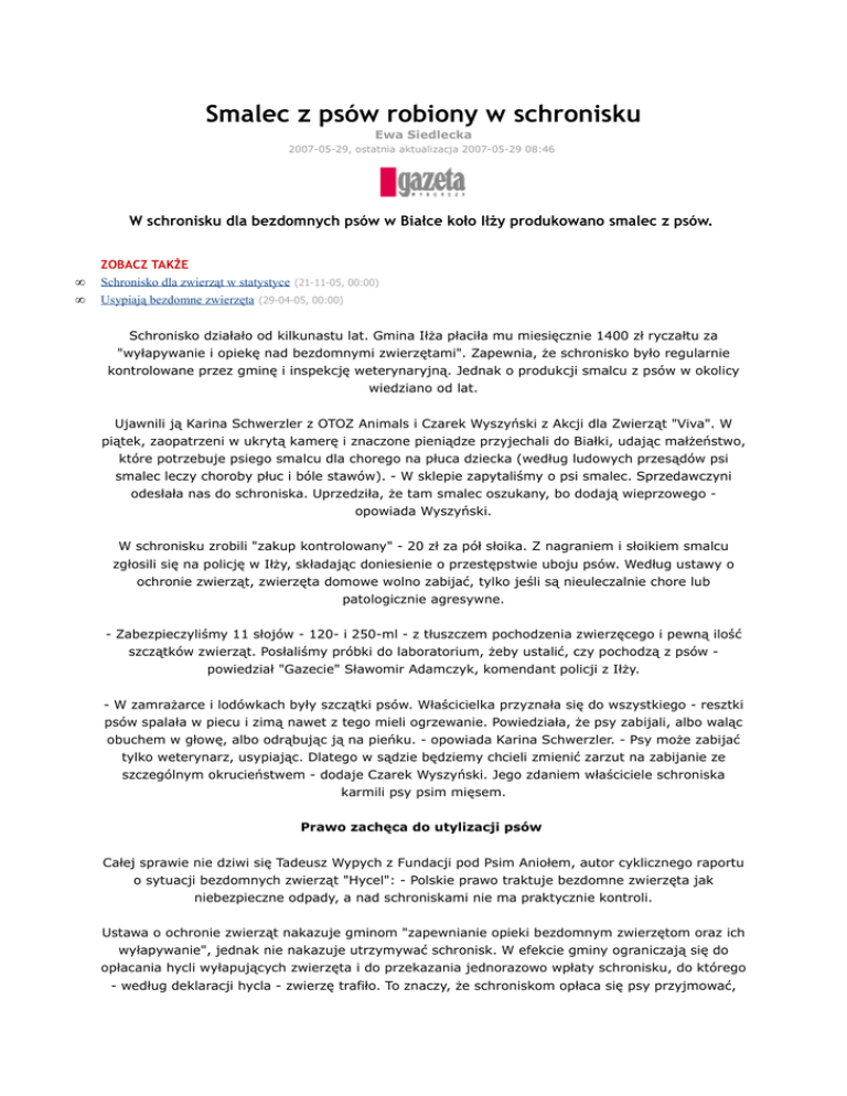 Smalec z psów robiony w schronisku Ewa Siedlecka 2007-05-29, ostatnia aktualizacja 2007-05-29 08:46 W schronisku dla bezdomnych psów w Białce koło Iłży produkowano smalec z psów. • • ZOBACZ TAKŻE Schronisko dla zwierząt w statystyce (21-11-05, 00:00) Usypiają bezdomne zwierzęta (29-04-05, 00:00) Schronisko działało od kilkunastu lat. Gmina Iłża płaciła mu miesięcznie 1400 zł ryczałtu za "wyłapywanie i opiekę nad bezdomnymi zwierzętami". Zapewnia, że schronisko było regularnie kontrolowane przez gminę i inspekcję weterynaryjną. Jednak o produkcji smalcu z psów w okolicy wiedziano od lat. Ujawnili ją Karina Schwerzler z OTOZ Animals i Czarek Wyszyński z Akcji dla Zwierząt "Viva". W piątek, zaopatrzeni w ukrytą kamerę i znaczone pieniądze przyjechali do Białki, udając małżeństwo, które potrzebuje psiego smalcu dla chorego na płuca dziecka (według ludowych przesądów psi smalec leczy choroby płuc i bóle stawów). - W sklepie zapytaliśmy o psi smalec. Sprzedawczyni odesłała nas do schroniska. Uprzedziła, że tam smalec oszukany, bo dodają wieprzowego opowiada Wyszyński. W schronisku zrobili "zakup kontrolowany" - 20 zł za pół słoika. Z nagraniem i słoikiem smalcu zgłosili się na policję w Iłży, składając doniesienie o przestępstwie uboju psów. Według ustawy o ochronie zwierząt, zwierzęta domowe wolno zabijać, tylko jeśli są nieuleczalnie chore lub patologicznie agresywne. - Zabezpieczyliśmy 11 słojów - 120- i 250-ml - z tłuszczem pochodzenia zwierzęcego i pewną ilość szczątków zwierząt. Posłaliśmy próbki do laboratorium, żeby ustalić, czy pochodzą z psów powiedział "Gazecie" Sławomir Adamczyk, komendant policji z Iłży. - W zamrażarce i lodówkach były szczątki psów. Właścicielka przyznała się do wszystkiego - resztki psów spalała w piecu i zimą nawet z tego mieli ogrzewanie. Powiedziała, że psy zabijali, albo waląc obuchem w głowę, albo odrąbując ją na pieńku. - opowiada Karina Schwerzler. - Psy może zabijać tylko weterynarz, usypiając. Dlatego w sądzie będziemy chcieli zmienić zarzut na zabijanie ze szczególnym okrucieństwem - dodaje Czarek Wyszyński. Jego zdaniem właściciele schroniska karmili psy psim mięsem. Prawo zachęca do utylizacji psów Całej sprawie nie dziwi się Tadeusz Wypych z Fundacji pod Psim Aniołem, autor cyklicznego raportu o sytuacji bezdomnych zwierząt "Hycel": - Polskie prawo traktuje bezdomne zwierzęta jak niebezpieczne odpady, a nad schroniskami nie ma praktycznie kontroli. Ustawa o ochronie zwierząt nakazuje gminom "zapewnianie opieki bezdomnym zwierzętom oraz ich wyłapywanie", jednak nie nakazuje utrzymywać schronisk. W efekcie gminy ograniczają się do opłacania hycli wyłapujących zwierzęta i do przekazania jednorazowo wpłaty schronisku, do którego - według deklaracji hycla - zwierzę trafiło. To znaczy, że schroniskom opłaca się psy przyjmować, ale nie opłaca ich utrzymywać. Umowy na prowadzenie schronisk gminy zawierają na podstawie ustawy o utrzymaniu porządku i czystości w gminach, która nakazuje im "organizowanie ochrony przed bezdomnymi zwierzętami". Zezwolenie na prowadzenie schronisk wydaje się na takich samych warunkach jak przy wywozie śmieci, szamb czy prowadzeniu pogrzebowisk i spalarni zwłok zwierzęcych, zaś wydatki na bezdomne zwierzęta wpisuje się w gminnym budżecie w rubryce "gospodarowanie odpadami". Tadeusz Wypych: - To kształtuje mentalność gminnych urzędników. Dla nich to problem sanitarnoepidemiologiczny, a nie humanitarny Psy giną w rękach hycli... Aż 15 proc. wyłapanych psów, za które gminy płacą hyclom, nie trafia do schronisk, bo zwłoki można usuwać bez śladów. Jest to możliwe, ponieważ niektóre gminy płacą hyclom ryczałtem, a nie od złowionego psa, a jeśli płacą od psa, to nie kontrolują, gdzie go umieścił. Wystarczy potwierdzenie ze schroniska dotyczące liczby "sztuk". Gmina Grodzisk Mazowiecki zapłaciła w 2005 r. hyclowi za 1376 psów umieszczonych rzekomo w schronisku w Korabiewicach. Tymczasem do schroniska przyjęto 270 psów. Co się stało ze zwierzętami, nie sposób sprawdzić, bo nie ma przepisów o prowadzeniu i kontrolowaniu ewidencji zwierząt. ...i w schroniskach Według najnowszego raportu "Hycel" w polskich schroniskach jako "utracone" odnotowuje się 1/4 psów (są zabijane, giną z choroby lub zagryzienia, bo schroniska są przepełnione, ewentualnie uciekają). W 2005 r. przyjęto