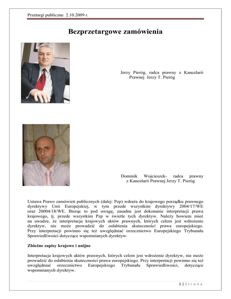 Przetargi publiczne 2.10.2009 r. Bezprzetargowe zamówienia Jerzy Pieróg, radca prawny z Kancelarii Prawnej Jerzy T. Pieróg Dominik Wojcieszek- radca prawny z Kancelarii Prawnej Jerzy T. Pieróg Ustawa Prawo zamówień publicznych (dalej: Pzp) wdraża do krajowego porządku prawnego dyrektywy Unii Europejskiej, w tym przede wszystkim dyrektywy 2004/17/WE oraz 20004/18/WE. Biorąc to pod uwagę, zasadne jest dokonanie interpretacji prawa krajowego, tj. przede wszystkim Pzp w świetle tych dyrektyw. Należy bowiem mieć na uwadze, że interpretacja krajowych aktów prawnych, których celem jest wdrożenie dyrektyw, nie może prowadzić do osłabienia skuteczności prawa europejskiego. Przy interpretacji powinno się też uwzględniać orzecznictwo Europejskiego Trybunału Sprawiedliwości dotyczące wspomnianych dyrektyw. Zbieżne zapisy krajowe i unijne Interpretacja krajowych aktów prawnych, których celem jest wdrożenie dyrektyw, nie może prowadzić do osłabienia skuteczności prawa europejskiego. Przy interpretacji powinno się też uwzględniać orzecznictwo Europejskiego Trybunału Sprawiedliwości, dotyczące wspomnianych dyrektyw. 1|Strona Przetargi publiczne 2.10.2009 r. Zgodnie z art. 1 dyrektywy 2004/18/WE zamówienia publiczne oznaczają umowy o charakterze odpłatnym, zawierane na piśmie pomiędzy jedną lub więcej instytucjami zamawiającymi a jednym lub więcej wykonawcami, których przedmiotem jest wykonanie robót budowlanych, dostawa produktów lub świadczenie usług w rozumieniu dyrektywy. Zgodnie z pkt 9 tego artykułu instytucje zamawiające oznaczają państwo, jednostki samorządu terytorialnego, podmioty prawa publicznego, związki złożone z jednej lub wielu takich jednostek albo z jednego lub wielu podmiotów prawa publicznego. Analiza przywołanych wyżej definicji wskazuje na zbieżność regulacji prawa krajowego z regulacjami europejskimi. W szczególności w obu systemach prawnych istotnym elementem pojęcia zamówienia publicznego jest postrzeganie go jako umowy odpłatnej. Z powyższego wynika, że również na tle regulacji europejskich warunkiem stosowania dyrektyw jest możliwość zawarcia umowy, a więc występowania dwóch odrębnych pomiotów prawnych. Orzecznictwo Europejskiego Trybunału Sprawiedliwości Europejski Trybunał Sprawiedliwości (ETS) zajmował się zagadnieniem zbliżonym do omawianego, nazywanym w doktrynie problematyką zamówień „in house”. Zamówienia typu „in house” Zamówienia, które są udzielane wewnątrz instytucji zamawiającej, tj. udzielane jednej z jej wewnętrznych jednostek organizacyjnych. W szerszym rozumieniu za zamówienia tego typu uznaje się również zamówienia powierzane formalnie odrębnym od instytucji zamawiającej osobom prawnym, jednakże pozostającym pod jej znaczącym wpływem. Orzeczenie C-107/98 Teckal z dnia 18 listopada 1999 r. Było to pierwsze i podstawowe orzeczenie, w którym ETS podjął powyższy problem. Dalsze orzecznictwo precyzowało i rozwijało myśl w nim wyrażoną. Orzeczenie C-107/98 Teckal Grupa włoskich gmin powołała do życia spółkę, której przedmiotem działalności było świadczenie niektórych usług publicznych, w tym związanych z dostarczaniem paliwa i ciepła. Jedna z gmin powierzyła spółce zarządzanie usługami w zakresie ogrzewania pewnej liczby budynków miejskich. Zlecenie to nie było poprzedzone procedurą udzielania zamówienia publicznego. Konkurencyjna spółka Teckal, działająca w dziedzinie usług grzewczych, zainicjowała postępowanie przed sądem krajowym, podnosząc, że władze 2|Strona Przetargi publiczne 2.10.2009 r. miejskie powinny były przeprowadzić przetarg. Sąd powziął w tym zakresie wątpliwości i zwrócił się do ETS o wykładnię przepisów wspólnotowych. Zdaniem ETS, aby stwierdzić, czy mamy do czynienia z zamówieniem, konieczne jest ustalenie, czy umowa została zawarta pomiędzy dwoma odrębnymi podmiotami. Jeśli umowa zostaje zawarta pomiędzy organem lokalnym a osobą z prawnego punktu widzenia inną niż organ lokalny, to mamy do czynienia z zamówieniem i należy stosować procedury wynikające z dyrektywy. Jednocześnie ETS uznał, że od tej zasady dopuszczalny jest wyjątek, o którym szerzej w dalszej części niniejszego opracowania. Biorąc pod uwagę powyższe orzeczenie, można więc wywnioskować, że porozumienia zawierane pomiędzy nieposiadającymi osobowości prawnej jednostkami organizacyjnymi Sskarbu Ppaństwa i analogicznie – pomiędzy jednostkami organizacyjnymi jednej jednostki samorządu terytorialnego również w świetle orzecznictwa Europejskiego Trybunału Sprawiedliwości nie są zamówieniami i w takich przypadkach nie ma obowiązku stosowania dyrektyw. Interpretacja pojęć prawa europejskiego Uwzględniając charakter prawa europejskiego należy przypomnieć, że tworzy ono własny porządek prawy, odrębny od krajowych systemów prawych. W konsekwencji niedopuszczalne jest przy interpretacji prawa europejskiego nadawanie pojęciom zawartym w tym prawie znaczenia, jakie przypisuje się tym samym lub podobnym pojęciom występującym w prawie krajowym. W powyższym kontekście należy z ostrożnością podejść do wniosku, że porozumienia zawierane pomiędzy jednostkami organizacyjnymi skarbu państwa Skarbu Państwa, względnie tej samej jednostki samorządu terytorialnego, nie podlegają Pzp i dyrektywom. Określenia takie jak „odpłatna umowa” oraz „osoba z prawnego punktu odrębna”, zawarte w dyrektywach oraz przywołanym orzeczeniu ETS, ze względu na autonomiczny charakter prawa europejskiego mogą być rozumiane inaczej, niż na gruncie polskiego systemu prawnego. Należy zwrócić uwagę na fakt, że Skarb Państwa skarb państwa nie jest typową osobą prawną, lecz szczególną konstrukcją. Trybunał nie zajmował się problem tej szczególnej osoby prawnej. Biorąc powyższe pod uwagę nie jest wykluczone, że na gruncie prawa europejskiego mogło