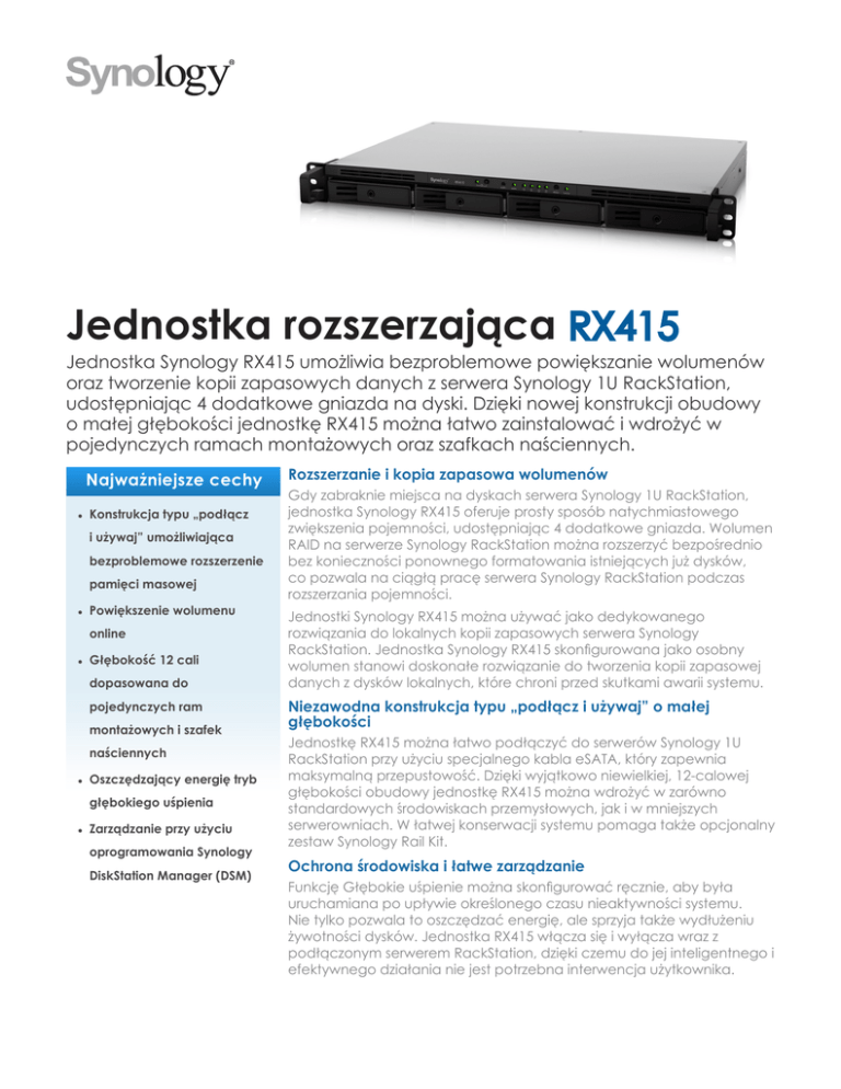 Jednostka rozszerzająca RX415 Jednostka Synology RX415 umożliwia bezproblemowe powiększanie wolumenów oraz tworzenie kopii zapasowych danych z serwera Synology 1U RackStation, udostępniając 4 dodatkowe gniazda na dyski. Dzięki nowej konstrukcji obudowy o małej głębokości jednostkę RX415 można łatwo zainstalować i wdrożyć w pojedynczych ramach montażowych oraz szafkach naściennych. Najważniejsze cechy ●● Konstrukcja typu „podłącz i używaj” umożliwiająca bezproblemowe rozszerzenie pamięci masowej ●● Powiększenie wolumenu online ●● Głębokość 12 cali dopasowana do pojedynczych ram montażowych i szafek naściennych ●● Oszczędzający energię tryb głębokiego uśpienia ●● Zarządzanie przy użyciu oprogramowania Synology DiskStation Manager (DSM) Rozszerzanie i kopia zapasowa wolumenów Gdy zabraknie miejsca na dyskach serwera Synology 1U RackStation, jednostka Synology RX415 oferuje prosty sposób natychmiastowego zwiększenia pojemności, udostępniając 4 dodatkowe gniazda. Wolumen RAID na serwerze Synology RackStation można rozszerzyć bezpośrednio bez konieczności ponownego formatowania istniejących już dysków, co pozwala na ciągłą pracę serwera Synology RackStation podczas rozszerzania pojemności. Jednostki Synology RX415 można używać jako dedykowanego rozwiązania do lokalnych kopii zapasowych serwera Synology RackStation. Jednostka Synology RX415 skonfigurowana jako osobny wolumen stanowi doskonałe rozwiązanie do tworzenia kopii zapasowej danych z dysków lokalnych, które chroni przed skutkami awarii systemu. Niezawodna konstrukcja typu „podłącz i używaj” o małej głębokości Jednostkę RX415 można łatwo podłączyć do serwerów Synology 1U RackStation przy użyciu specjalnego kabla eSATA, który zapewnia maksymalną przepustowość. Dzięki wyjątkowo niewielkiej, 12-calowej głębokości obudowy jednostkę RX415 można wdrożyć w zarówno standardowych środowiskach przemysłowych, jak i w mniejszych serwerowniach. W łatwej konserwacji systemu pomaga także opcjonalny zestaw Synology Rail Kit. Ochrona środowiska i łatwe zarządzanie Funkcję Głębokie uśpienie można skonfigurować ręcznie, aby była uruchamiana po upływie określonego czasu nieaktywności systemu. Nie tylko pozwala to oszczędzać energię, ale sprzyja także wydłużeniu żywotności dysków. Jednostka RX415 włącza się i wyłącza wraz z podłączonym serwerem RackStation, dzięki czemu do jej inteligentnego i efektywnego działania nie jest potrzebna interwencja użytkownika. Złącza i przyciski Przód 1 2 3 4 5 6 7 Tył 8 9 10 11 1 Przycisk zasilania i wskaźnik 2 Wskaźnik ALERT 3 Wskaźnik eSATA 4 Wskaźniki dysków 5 RESET 6 Wskaźnik STATUS 7 Kieszenie dysków twardych 8 Wentylatory 9 Gniazdo zasilania 10 Przycisk MANUAL/DEFAULT 11 Gniazdo eSATA Dane techniczne Sprzęt Wewnętrzny dysk HDD/SSD 4 x 3,5” lub 2,5” SATA(II) (dyski twarde nie wchodzą w skład zestawu) Gniazdo eSATA x1 Wymiana dysków twardych podczas pracy Tak Wymiary (wys. x szer. x gł.) 44 mm x 430,5 mm x 290 mm Waga 4,23 kg Wentylator systemu 40 x 40 mm x 3 Przywracanie zasilania Synchronizacja z podłączonym serwerem RackStation (w trybie automatycznym) Napięcie wejściowe zasilania prądem przemiennym 100 V–240 V Częstotliwość zasilania Od 50 Hz do 60 Hz, prąd jednofazowy Temperatura pracy 5°C–35°C (40°F–95°F) Temperatura przechowywania -10°C–70°C (15°F–155°F) Wilgotność względna 5%–95% Obsługiwane modele 1 RS814+, RS814RP+, RS814, RS214 (tylko niezależny wolumen) Ochrona środowiska i opakowanie Środowisko Zgodność z dyrektywą RoHS Zawartość opakowania Jednostka główna RX415, podręcznik użytkownika, zestaw akcesoriów, kabel zasilający x 1, kabel połączeniowy Akcesoria opcjonalne Zestaw Synology RKS1314 — Rail Kit Sliding, zestaw Synology RKM114 — Rail Kit Mounted Certyfikaty FCC: Klasa A, CE: Klasa A, BSMI: Klasa A Gwarancja 3 lata *Specyfikacje mogą ulegać zmianom bez powiadamiania. Najnowsze informacje można znaleźć w witrynie www.synology.com. 1.Informacje o najnowszych obsługiwanych modelach można uzyskać pod adresem www.synology.com. SYNOLOGY INC. Firma Synology wykorzystuje w pełni zalety najnowszych technologii, by zapewniać firmom i użytkownikom indywidualnym niezawodne oraz przystępne cenowo rozwiązania do centralizacji pamięci masowej, łatwego wykonywania kopii zapasowych danych, udostępniania i synchronizacji plików pomiędzy różnymi platformami, a także uzyskiwania dostępu do danych przy użyciu urządzeń mobilnych. Synology stawia sobie za cel oferowanie produktów o przyszłościowych funkcjach oraz najlepszych w swojej klasie usług dla klientów. Copyright © 2014, Synology Inc. Wszelkie prawa zastrzeżone. Nazwa Synology i logo Synology są znakami towarowymi lub zarejestrowanymi znakami towarowymi firmy Synology Inc. Nazwy innych produktów i firm wymienionych w tym dokumencie mogą być znakami towarowymi podmiotów, do których należą te nazwy. Firma Synology zastrzega sobie prawo do wprowadzania zmian w specyfikacji i opisie produktów w dowolnym momencie bez wcześniejszego powiadamiania. Wydrukowano na Tajwanie. RX415-2014-PLK-REV001 Siedziba główna Synology Inc. 3F-3, No. 106, Chang An W. Rd., Taipei, Tajwan, tel.: +886 2 2552 1814, faks: +886 2 2552 1824 Chiny Synology Shanghai 20070, Room 516, No. 638, Hengfeng Rd., Zhabei Dist., Shanghai Francja Synology France SARL 39 rue Louis Blanc, 92400 Courbevoie Francja Tel.: +33 147 176288 Ameryka Północna i Południowa Synology America Corp. 13343 NE Bel-Red Road, Bellevue, WA 98005 USA Tel.: +1 425 818 1587 Wielka Brytania Synology UK Ltd. Unit C, Denbigh West Business Park, Third Avenue, Bletchley, Milton Keynes, MK1 1DH, Wielka Brytania Tel.: +44 1908 366380 Niemcy Synology GmbH Grafenberger Allee 125 40237 Düsseldorf Niemcy Tel.: +49 211 9666 9666