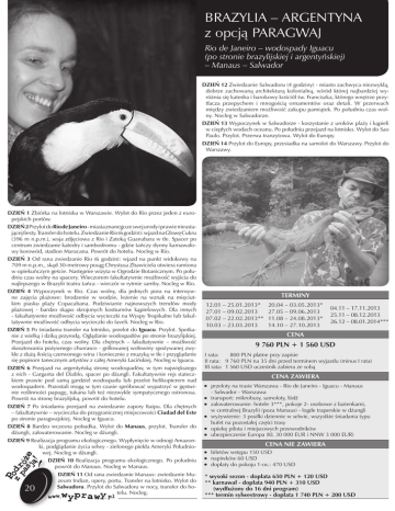 BRAZYLIA – ARGENTYNA z opcją PARAGWAJ Rio de Janeiro – wodospady Iguacu (po stronie brazylijskiej i argentyńskiej) – Manaus – Salwador DZIEŃ 12 Zwiedzanie Salwadoru (4 godziny) - miasto zachwyca niezwykłą, dobrze zachowaną architekturą kolonialną, wśród której najbardziej wyróżnia się katedra i barokowy kościół św. Franciszka, którego wnętrze przytłacza przepychem i mnogością ornamentów oraz detali. W przerwach między zwiedzaniem możliwość zakupu pamiątek. Po południu czas wolny. Nocleg w Salwadorze. DZIEŃ 13 Wypoczynek w Salwadorze - korzystanie z uroków plaży i kąpieli w ciepłych wodach oceanu. Po południu przejazd na lotnisko. Wylot do Sao Paulo. Przylot. Przerwa tranzytowa. Wylot do Europy. DZIEŃ 14 Przylot do Europy, przesiadka na samolot do Warszawy. Przylot do Warszawy. DZIEŃ 1 Zbiórka na lotnisku w Warszawie. Wylot do Rio przez jeden z europejskich portów. DZIEŃ 2 Przylot do Rio de Janeiro - miasta znanego ze swej urody i prawie nieustającej fiesty. Transfer do hotelu. Zwiedzanie Rio (6 godzin): wjazd na Głowę Cukru (396 m n.p.m.), sesja zdjęciowa z Rio i Zatoką Guanabara w tle. Spacer po centrum zwiedzanie katedry i sambodromu - gdzie tańczy słynny karnawałowy korowód, stadion Maracana. Powrót do hotelu. Nocleg w Rio. DZIEŃ 3 Od rana zwiedzanie Rio (6 godzin): wjazd na punkt widokowy na 709 m n.p.m., skąd 30-metrowy posąg Chrystusa Zbawiciela otwiera ramiona w opiekuńczym geście. Następnie wizyta w Ogrodzie Botanicznym. Po południu czas wolny na spacery. Wieczorem fakultatywnie możliwość wyjścia do najlepszego w Brazylii teatru tańca - wieczór w rytmie samby. Nocleg w Rio. DZIEŃ 4 Wypoczynek w Rio. Czas wolny, dla jednych pora na intensywne zajęcia plażowe: brodzenie w wodzie, leżenie na wznak na mięciutkim piasku plaży Copacabana. Podziwianie najnowszych trendów mody plażowej - bardzo skąpo skrojonych kostiumów kąpielowych. Dla innych - fakultatywnie możliwość odbycia wycieczki na Wyspy Tropikalne lub fakultatywnie możliwość odbycia wycieczki do faveli. Nocleg w Rio. DZIEŃ 5 Po śniadaniu transfer na lotnisko, przelot do Iguacu. Przylot. Spotkanie z wielką i dziką przyrodą. Oglądanie wodospadów po stronie brazylijskiej. Przejazd do hotelu, czas wolny. Dla chętnych – fakultatywnie – możliwość skosztowania pożywnego churrasco - grillowanej wołowiny spożywanej zwykle z dużą ilością czerwonego wina i koniecznie z muzyką w tle i przyglądanie się popisom tanecznym artystów z całej Ameryki Łacińskiej. Nocleg w Iguacu. DZIEŃ 6 Przejazd na argentyńską stronę wodospadów, w tym największego z nich - Garganta del Diablo, spacer po dżungli. Fakultatywnie rejs stateczkiem prawie pod samą gardziel wodospadu lub przelot helikopterem nad wodospadem. Pozostali mogą w tym czasie spróbować wypatrzyć w gęstwinie roślinności papugę, tukana lub też niezwykle sympatycznego ostronosa. Powrót na stronę brazylijską, powrót do hotelu. DZIEŃ 7 Po śniadaniu przejazd na zwiedzanie zapory Itaipu. Dla chętnych – fakultatywnie – wycieczka do przygranicznej miejscowości Ciudad del Este po stronie paragwajskiej. Nocleg w Iguacu. DZIEŃ 8 Bardzo wczesna pobudka. Wylot do Manaus, przylot. Transfer do dżungli, zakwaterowanie. Nocleg w dżungli. DZIEŃ 9 Realizacja programu ekologicznego. Wypłynięcie w odnogi Amazonki, podglądanie życia selwy - zielonego piekła Ameryki Południowej. Nocleg w dżungli. DZIEŃ 10 Realizacja programu ekologicznego. Po południu powrót do Manaus. Nocleg w Manaus. 20 DZIEŃ 11 Od rana zwiedzanie Manaus: zwiedzanie Muzeum Indian, opery, portu. Transfer na lotnisko. Wylot do Salwadoru. Przylot do Salwadoru w nocy, transfer do hotelu. Nocleg. TERMINY 12.01 – 25.01.2013* 27.01 – 09.02.2013 07.02 – 22.02.2013** 10.03 – 23.03.2013 20.04 – 03.05.2013* 27.05 – 09.06.2013 11.08 – 24.08.2013* 14.10 – 27.10.2013 04.11 – 17.11.2013 25.11 – 08.12.2013 26.12 – 08.01.2014*** CENA 9 760 PLN + 1 560 USD I rata: 800 PLN płatne przy zapisie II rata: 9 760 PLN na 35 dni przed terminem wyjazdu (minus I rata) III rata: 1 560 USD uczestnik zabiera ze sobą CENA ZAWIERA · · · · · · przeloty na trasie Warszawa - Rio de Janeiro - Iguacu - Manaus - Salwador - Warszawa transport: mikrobusy, samoloty, łódź zakwaterowanie: hotele 3***, pokoje 2- osobowe z łazienkami, w centralnej Brazylii (poza Manaus) - logde traperskie w dżungli wyżywienie: 3 posiłki dziennie w selwie, wszystkie śniadania typu bufet na pozostałej części trasy opiekę pilota i miejscowych przewodników ubezpieczenie Europa (KL 30 000 EUR i NNW 3 000 EUR) CENA NIE ZAWIERA · biletów wstępu 150 USD · napiwków 60 USD · dopłaty do pokoju 1-os.: 470 USD * wysoki sezon - dopłata 650 PLN + 120 USD ** karnawał - dopłata 940 PLN + 310 USD (wydłużony do 16 dni program) *** termin sylwestrowy - dopłata 1 740 PLN + 200 USD