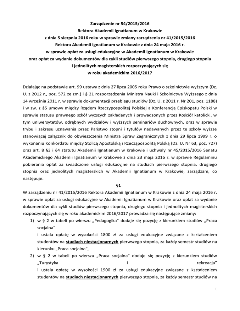 Zarządzenie nr 54/2015/2016 Rektora Akademii Ignatianum w Krakowie z dnia 5 sierpnia 2016 roku w sprawie zmiany zarządzenia nr 41/2015/2016 Rektora Akademii Ignatianum w Krakowie z dnia 24 maja 2016 r. w sprawie opłat za usługi edukacyjne w Akademii Ignatianum w Krakowie oraz opłat za wydanie dokumentów dla cykli studiów pierwszego stopnia, drugiego stopnia i jednolitych magisterskich rozpoczynających się w roku akademickim 2016/2017 Działając na podstawie art. 99 ustawy z dnia 27 lipca 2005 roku Prawo o szkolnictwie wyższym (Dz. U. z 2012 r., poz. 572 ze zm.) i § 21 rozporządzenia Ministra Nauki i Szkolnictwa Wyższego z dnia 14 września 2011 r. w sprawie dokumentacji przebiegu studiów (Dz. U. z 2011 r. Nr 201, poz. 1188) i w zw. z §5 umowy między Rządem Rzeczypospolitej Polskiej a Konferencją Episkopatu Polski w sprawie statusu prawnego szkół wyższych zakładanych i prowadzonych przez Kościół katolicki, w tym uniwersytetów, odrębnych wydziałów i wyższych seminariów duchownych, oraz w sprawie trybu i zakresu uznawania przez Państwo stopni i tytułów nadawanych przez te szkoły wyższe stanowiącej załącznik do obwieszczenia Ministra Spraw Zagranicznych z dnia 29 lipca 1999 r. o wykonaniu Konkordatu między Stolicą Apostolską i Rzecząpospolitą Polską (Dz. U. Nr 63, poz. 727) oraz art. 8 §3 i §4 statutu Akademii Ignatianum w Krakowie i uchwały nr 45/2015/2016 Senatu Akademickiego Akademii Ignatianum w Krakowie z dnia 23 maja 2016 r. w sprawie Regulaminu pobierania opłat za świadczone usługi edukacyjne na studiach pierwszego stopnia, drugiego stopnia oraz jednolitych magisterskich w Akademii Ignatianum w Krakowie, zarządzam, co następuje: §1 W zarządzeniu nr 41/2015/2016 Rektora Akademii Ignatianum w Krakowie z dnia 24 maja 2016 r. w sprawie opłat za usługi edukacyjne w Akademii Ignatianum w Krakowie oraz opłat za wydanie dokumentów dla cykli studiów pierwszego stopnia, drugiego stopnia i jednolitych magisterskich rozpoczynających się w roku akademickim 2016/2017 prowadza się następujące zmiany: 1) w § 2 w tabeli po wierszu „Pedagogika” dodaje się pozycję z kierunkiem studiów „Praca socjalna” i ustala opłatę w wysokości 1800 zł za usługi edukacyjne związane z kształceniem studentów na studiach niestacjonarnych pierwszego stopnia, za każdy semestr studiów na kierunku „Praca socjalna”, 2) w § 2 w tabeli po wierszu „Praca socjalna” dodaje się pozycję z kierunkiem studiów „Turystyka i rekreacja” i ustala opłatę w wysokości 1900 zł za usługi edukacyjne związane z kształceniem studentów na studiach niestacjonarnych pierwszego stopnia, za każdy semestr studiów na 1 kierunku „Turystyka i rekreacja”, 3) w §2 dotychczasowa tabela otrzymuje następujące brzmienie: opłata za jeden semestr opłata za jeden semestr (w PLN) w rozbiciu na raty (w PLN) kierunek studiów Całość I rata II rata III rata Administracja i polityka publiczna 1800 600 600 600 Kulturoznawstwo 1800 600 600 600 Psychologia 2100 700 700 700 Pedagogika 1900 600 600 700 Praca socjalna 1800 600 600 600 Turystyka i rekreacja 1900 600 600 700 4) w §4 ust. 1 do tabeli po wierszu ”Psychologia” dodaje się pozycję z kierunkiem studiów ”Turystyka i rekreacja” i ustala opłatę w wysokości 64,00 zł za jeden punkt ECTS za świadczone przez Akademię Ignatianum w Krakowie usługi edukacyjne związane z powtarzaniem określonych zajęć z powodu niezadowalających wyników w nauce na studiach na kierunku ” Turystyka i rekreacja”, 5) w §4 ust. 1 do tabeli po wierszu ”Praca socjalna” dodaje się pozycję z kierunkiem studiów ”Zarządzanie i nowe technologie w sferze publicznej” i ustala opłatę w wysokości 60,00 zł za jeden punkt ECTS za świadczone przez Akademię Ignatianum w Krakowie usługi edukacyjne związane z powtarzaniem określonych zajęć z powodu niezadowalających wyników w nauce na studiach na kierunku ”Zarządzanie i nowe technologie w sferze publicznej”, 6) w §4 ust. 1 dotychczasowa tabela otrzymuje następujące brzmienie: Wydział/ Opłata za jeden punkt kierunek ECTS (w PLN) Wydział Filozoficzny Dziennikarstwo i komunikacja społeczna 60,00 zł Filozofia 45,00 zł Kulturoznawstwo 60,00 zł Psychologia 70,00 zł Turystyka i rekreacja 64,00 zł 2 Wydział Pedagogiczny Administracja i polityka publiczna 60,00 zł Filologia angielska 60,00 zł Pedagogika 64,00 zł Nauki o polityce 60,00 zł Praca socjalna 60,00 zł Zarządzanie i nowe technologie w sferze publicznej 60,00 zł §2 Zarządzenie wchodzi w życie z dniem podpisania. 3