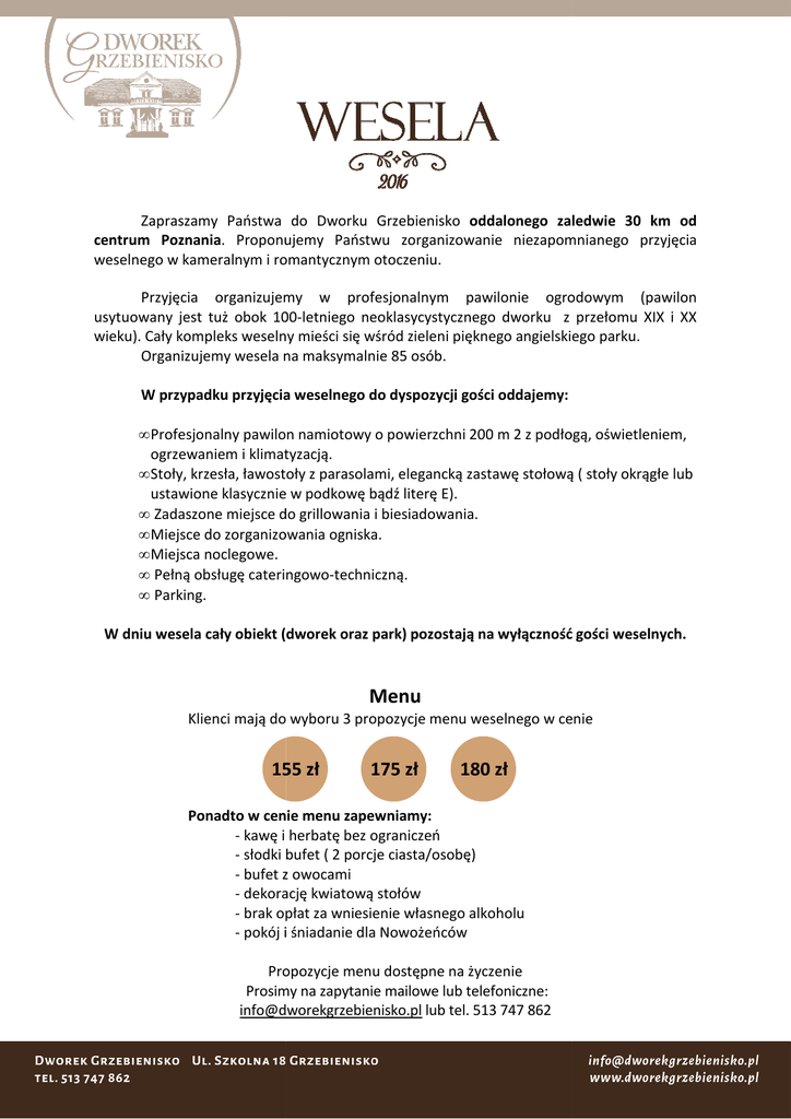 Zapraszamy Państwa do Dworku Grzebienisko oddalonego zaledwie 30 km od centrum Poznania.. Proponujemy Państwu zorganizowanie niezapomnianego przyjęcia weselnego w kameralnym i romantycznym otoczeniu. Przyjęcia organizujemy w profesjonalnym pawilonie ogrodowym (pawilon usytuowany jest tuż obok 100-letniego 100 neoklasycystycznego dworku z przełomu XIX i XX wieku). ). Cały kompleks weselny mieści się wśród zieleni pięknego angielskiego parku. Organizujemy izujemy wesela na maksymalnie 85 osób. W przypadku przyjęcia weselnego do dyspozycji gości oddajemy: oddajemy • Profesjonalny pawilon ilon namiotowy o powierzchni 200 m 2 z podłogą, podło oświetleniem, ogrzewaniem i klimatyzacją. • Stoły, krzesła, ławostoły z parasolami, elegancką zastawę stołową ( stoły okrągłe lub ustawione klasycznie w podkowę bądź literę E). E) • Zadaszone miejsce do grillowania i biesiadowania. biesiadowania • Miejsce do zorganizowania ogniska. ogniska • Miejsca noclegowe. • Pełną obsługę cateringowo-techniczną. cateringowo • Parking. W dniu wesela cały obiekt (dworek oraz park) pozostają na wyłączność gości weselnych. Menu Klienci mają do wyboru 3 propozycje menu weselnego w cenie 155 zł 175 zł 180 zł Ponadto w cenie menu zapewniamy: - kawę i herbatę bez ograniczeń - słodki bufet ( 2 porcje ciasta/osobę) - bufet z owocami - dekorację kwiatową stołów - brak opłat za wniesienie własnego alkoholu - pokój i śniadanie dla Nowożeńców Propozycje menu dostępne na życzenie Prosimy na zapytanie mailowe lub telefoniczne: [email protected] lub tel. 513 747 862 Wesela w soboty organizujemy od 50 osób ( nie wliczając obsługi i dzieci do lat 3). W pozostałych terminach istnieje możliwość organizacji mniejszego przyjęcia. Ceny w zależności od ilości gości kształtują się następująco: Propozycja menu 1 Propozycja menu 2 Propozycja menu grill 59-85 osób 155 zł/os 175 zł/os 180 zł/os 50-58 osób 165 zł/os 185 zł/os 190 zł/os Cena menu dla obsługi takiej jak: fotograf, zespół muzyczny, dj –100zł/os 100zł/os Dzieci do lat 3 – bezpłatnie, dzieci 4-8 4 lat – 50% kwoty podstawowej Alkohole i napoje: kawa, herbata, dodatki w formie specjalnego stołu z ciepłymi napojami bez limitu w cenie menu bez limitu 9 zł/os. Wszystkie napoje są dostępne przez cały czas trwania imprezy. soki owocowe 100% i woda z cytryną Alkohole pozostają w zakresie Pary Młodej M – nie pobieramy opłaty za wniesienie własnego alkoholu. Tort weselny i ciasto: słodki bufet tort i dodatkowe ciasto dostarczone we własnym zakresie tort lub dodatkowe ciasto zamawiane w Dworku 2 porcje/ os. w cenie menu obsługa tortu: gratis obsługa własnego ciasta: 3zł/os. tort: 45zł/kg ciasto: 3zł/porcja Wykaz ciast dostępny na życzenie. życzenie Owoce Patera z owocami sezonowymi w cenie menu dodatkowe owoce dostarczone ostarczone we własnym zakresie obsługa: 2zł/os. Ceremonia ślubna Na miejsce kościelnej ceremonii ślubnej polecamy zabytkowy kościół w Ceradzu Kościelnym oddalony 4 km od dworku. Proponujemy dowiezienie dowiezi Pary Młodej łodej z kościoła do dworku bryczką lub karetą. Bryczka lub kareta może także stanowić atrakcję dla gości podczas wesela ( przejażdżki po okolicy). okolicy) Istnieje stnieje także możliwość złożenia zł przysięgi małżeńskiej na terenie parku w romantycznej aranżacji. Wynajem bryczki lub karety: 550 zł za pierwszą godzinę (za każdą następną godzinę 150 zł) Cena nie uwzględnia dekoracji pojazdu. Baza noclegowa Dysponujemy 12 miejscami noclegowymi. Pokój pełniący łniący funkcję apartamentu dla Pary Młodej M – gratis Nocleg ocleg dla pozostałych gości – 59 zł/os Doba hotelowa trwa do godziny 12:00 W przypadku konieczności przenocowania większej ilości gości zapraszamy do skorzystania z oferty hoteli znajdujących się w okolicy z którymi współpracujemy. Zapewniamy pomoc w organizacji noclegów oraz transport do miejsca noclegowego i z powrotem (wynajem busa za dodatkową opłatą). opłatą) Śniadanie: dla Gości nocujących w Dworku 17zł/os. dla pozostałych Gości 34zł/os. w menu śniadaniowym znajduje się: się wybór wędlin, deska serów, świeże warzywa, twarożki, dżemy, jogurty, pieczywo, masło, kawa, herbata, soki 100%, woda z cytryną Chętnie spotkamy się z Państwem w dworku, aby przybliżyć szczegóły oferty. Prosimy o telefoniczne telefoniczne umówienie się na spotkanie (tel.513 747 862)