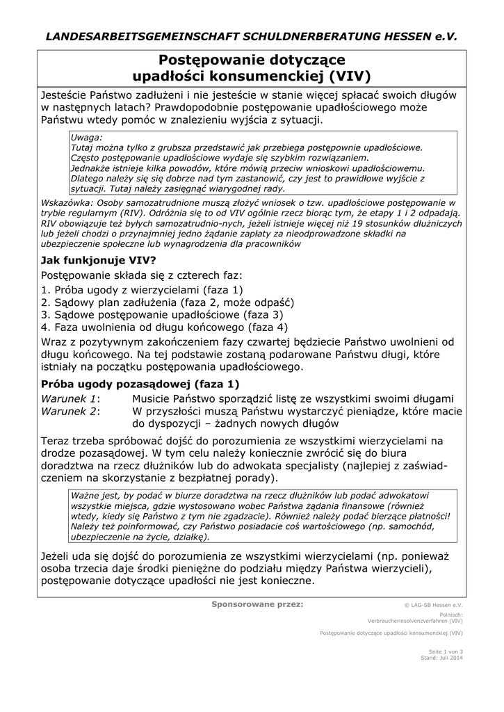 LANDESARBEITSGEMEINSCHAFT SCHULDNERBERATUNG HESSEN e.V. Postępowanie dotyczące upadłości konsumenckiej (VIV) Jesteście Państwo zadłużeni i nie jesteście w stanie więcej spłacać swoich długów w następnych latach? Prawdopodobnie postępowanie upadłościowego może Państwu wtedy pomóc w znalezieniu wyjścia z sytuacji. Uwaga: Tutaj można tylko z grubsza przedstawić jak przebiega postępownie upadłościowe. Często postępowanie upadłościowe wydaje się szybkim rozwiązaniem. Jednakże istnieje kilka powodów, które mówią przeciw wnioskowi upadłościowemu. Dlatego należy się się dobrze nad tym zastanowić, czy jest to prawidłowe wyjście z sytuacji. Tutaj należy zasięgnąć wiarygodnej rady. Wskazówka: Osoby samozatrudnione muszą złożyć wniosek o tzw. upadłościowe postępowanie w trybie regularnym (RIV). Odróżnia się to od VIV ogólnie rzecz biorąc tym, że etapy 1 i 2 odpadają. RIV obowiązuje też byłych samozatrudnio-nych, jeżeli istnieje więcej niż 19 stosunków dłużniczych lub jeżeli chodzi o przynajmniej jedno żądanie zapłaty za nieodprowadzone składki na ubezpieczenie społeczne lub wynagrodzenia dla pracowników Jak funkjonuje VIV? Postępowanie składa się z czterech faz: 1. Próba ugody z wierzycielami (faza 1) 2. Sądowy plan zadłużenia (faza 2, może odpaść) 3. Sądowe postępowanie upadłościowe (faza 3) 4. Faza uwolnienia od długu końcowego (faza 4) Wraz z pozytywnym zakończeniem fazy czwartej będziecie Państwo uwolnieni od długu końcowego. Na tej podstawie zostaną podarowane Państwu długi, które istniały na początku postępowania upadłościowego. Próba ugody pozasądowej (faza 1) Warunek 1: Musicie Państwo sporządzić listę ze wszystkimi swoimi długami Warunek 2: W przyszłości muszą Państwu wystarczyć pieniądze, które macie do dyspozycji – żadnych nowych długów Teraz trzeba spróbować dojść do porozumienia ze wszystkimi wierzycielami na drodze pozasądowej. W tym celu należy koniecznie zwrócić się do biura doradztwa na rzecz dłużników lub do adwokata specjalisty (najlepiej z zaświadczeniem na skorzystanie z bezpłatnej porady). Ważne jest, by podać w biurze doradztwa na rzecz dłużników lub podać adwokatowi wszystkie miejsca, gdzie wystosowano wobec Państwa żądania finansowe (również wtedy, kiedy się Państwo z tym nie zgadzacie). Również należy podać bierzące płatności! Należy też poinformować, czy Państwo posiadacie coś wartościowego (np. samochód, ubezpieczenie na życie, działkę). Jeżeli uda się dojść do porozumienia ze wszystkimi wierzycielami (np. ponieważ osoba trzecia daje środki pieniężne do podziału między Państwa wierzycieli), postępowanie dotyczące upadłości nie jest konieczne. Sponsorowane przez: © LAG-SB Hessen e.V. Polnisch: Verbraucherinsolvenzverfahren (VIV) Postępowanie dotyczące upadłości konsumenckiej (VIV) Seite 1 von 3 Stand: Juli 2014 LANDESARBEITSGEMEINSCHAFT SCHULDNERBERATUNG HESSEN e.V. Jeżeli propozycja uregulowania zostanie odrzucona, otrzymujecie Państwo zaświadczenie z biura doradztwa na rzecz dłużników/od swojego adwokata. To zaświadczenie potrzebne jest w celu złożenia wniosku o otwarcie postępowania upadłościowego. Przy wypełnianiu wniosku (druku) powinniście Państwo skorzystać z pomocy biura doradztwa na rzecz dłużników lub z pomocy swojego adwokata. Wspierany sądowo aktualizacyjny plan zadłużenia (faza 2) Tą fazę ewentualnie można przeskoczyć Po tym jak złożyliście Państwo podania o postępowanie upadłościowe, sąd może zadecydować, czy nie należałoby jeszcze raz spróbować dojść do porozumienia z wierzycielami. Będzie miało to miejsce wtedy, kiedy próba pozasądowego dojścia do porozumienia w końcu nie powiodła się minimalnie. Jeżeli większość wierzycieli (według ilości głów i sumy dłużnej) zgodzi się na ten plan, sąd upadłościowy może „zmusić” do jego przyjęcia wierzycieli, którzy ten plan odrzucają. Sądowe postępowanie upadłościowe (faza 3) Jeżeli faza 2 wydaje się nie do zrealizowania (lub się ona nie powiodła), sąd otwiera postępowanie upadłościowe wobec Państwa i ogłasza je w internecie. Ustanawia się syndyka (najczęściej adwokata). Syndyk ma ogólnie rzecz biorąc dwa zadania: Sporządza on listę wszystkich wierzytelności, które są zgłaszane przez wierzycieli jako wierzytelności wobec Państwa. Uwaga: Jeżeli wierzytelności będą zgłoszone jako „pochodzące z czynu umyślnie niedozwolonego “, wyłącza się je później spod uwolnienia od długu końcowego! Dlatego niech Państwo sprawdzą, czy rzeczywiście miał miejsce karalny czyn umyślny; Jeżeli nie, należy zgłosić sprzeciw w sądzie upadłościowym. Ściąga on Państwa zajmowalny majątek i zajmowalny dochód należący do Państwa i przy tym może on ewentualnie żądać płatności za ostatnie miesiące. Zajętymi pieniędzmi pokrywane są najpierw koszty postępowania (koszty sądowe i koszty syndyka). Uwaga: Syndyk sprawdza, co zostało przez Państwa podane we wniosku o upadłość. Jeżeli miałby on stwierdzić istnienie dochodu lub wartości majątkowych, które w rażąco niedbały sposób świadomie Państwo przemilczeli, powstaje zagrożenie, że Państwa postępowanie upadłościowe się nie uda. Faza uwolnienia od długu końcowego (faza 4) Jeżeli syndyk wykonał swoje zadania, wtedy postępowanie upadłościowe będzie wstrzymane dezycją sądu i zaczyna się faza uwolnienia od długu końcowego. Nadal ściągana jest zajmowalna część Państwa dochodu. Jeżeli mielibyście Państwo coś odziedziczyć, musicie oddać połowę z tego syndykowi. Możecie też Państwo spadku nie przyjąć. Pojedynczy wierzyciele mogą być spłacani tylko przy pomocy syndyka. Ważne jest, by każdą zmianę rodzinną i majątkową, zmianę Sponsorowane przez: © LAG-SB Hessen e.V. Polnisch: Verbraucherinsolvenzverfahren (VIV) Post