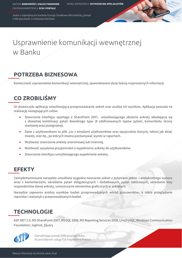 SEKTOR: BANKOWOŚĆ I USŁUGI FINANSOWE MODEL WSPÓŁPRACY: OUTSOURCING SPECJALISTÓW CENTRUM KOMPETENCJI: ECM I PORTALE Jeden z największych banków Europy Środkowo-Wschodniej, ponad 1 000 placówek, 5 milionów klientów. Usprawnienie komunikacji wewnętrznej w Banku POTRZEBA BIZNESOWA Konieczność usprawnienia komunikacji wewnętrznej, spowodowane dużą ilością rozproszonych informacji. CO ZROBILIŚMY Sii dostarczyło aplikację umożliwiającą przeprowadzanie ankiet oraz analizę ich wyników. Aplikacja pozwala na realizację następujących celów: Stworzenie interfejsu opartego o SharePoint 2007, umożliwiającego ułożenie ankiety składającej się z dowolnej kombinacji pytań dowolnego typu (8 zdefiniowanych typów pytań), komunikatu strony startowej oraz pożegnalnej. Dane z użytkownikami to plik .csv z emailami użytkowników oraz opcjonalnie danymi, takimi jak dział, miasto, staż itp., po których można porównywać wyniki w raportach. Możliwość stworzenia ankiety anonimowej lub imiennej. Możliwość wysyłania przypomnień o wypełnieniu ankiety do użytkowników. Stworzenie interfejsu umożliwiającego wypełnianie ankiety. EFEKTY Zaimplementowane narzędzie umożliwia wygodne tworzenie ankiet z pytaniami jedno- i wielokrotnego wyboru wraz z komentarzami, określanie pytań obligatoryjnych i dodatkowych, pytań tablicowych, określanie listy respondentów danej ankiety, umieszczanie elementów graficznych w ankietach. Narzędzie zapewnia analizę wyników badań przeprowadzanych wśród pracowników, a także przeglądanie raportów i statystyk z przeprowadzanych badań. TECHNOLOGIE ASP.NET 2.0, MS SharePoint 2007, MSSQL 2008, MS Reporting Services 2008, LinqToSQL, Windows Communication Foundation, log4net, jQuery Zatrudniając ponad 2000 pracowników, Sii jest liderem usług IT & Inżynierii w Polsce. Więcej informacji na stronie www.sii.pl