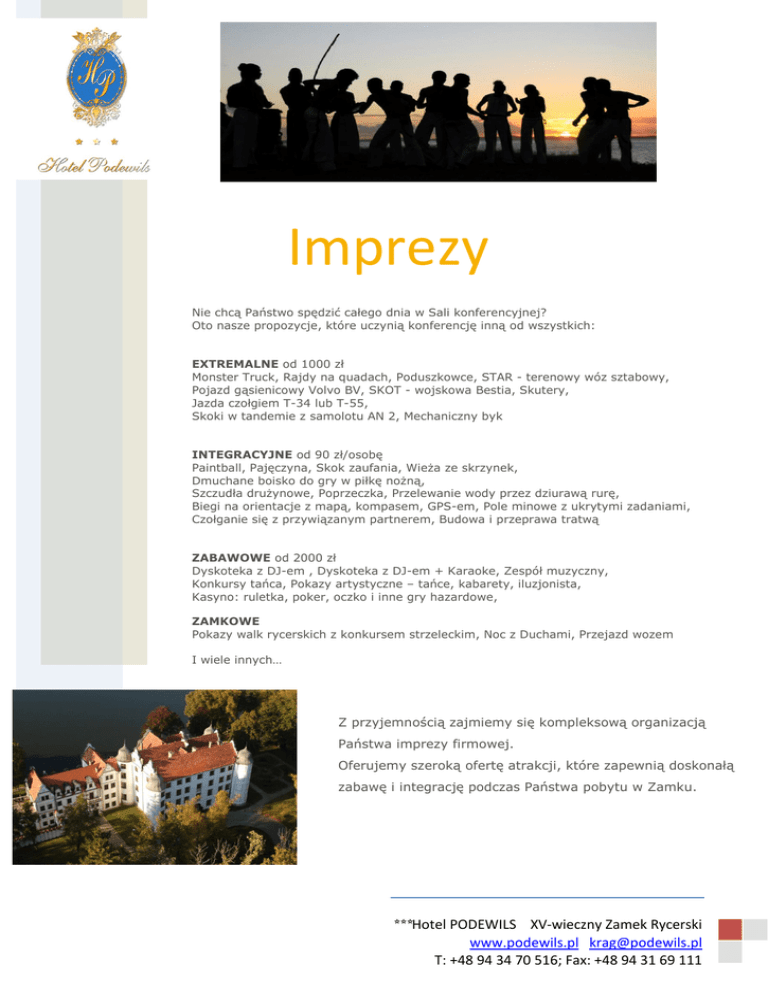 Imprezy Nie chcą Państwo spędzić całego dnia w Sali konferencyjnej? Oto nasze propozycje, które uczynią konferencję inną od wszystkich: EXTREMALNE od 1000 zł Monster Truck, Rajdy na quadach, Poduszkowce, STAR - terenowy wóz sztabowy, Pojazd gąsienicowy Volvo BV, SKOT - wojskowa Bestia, Skutery, Jazda czołgiem T-34 lub T-55, Skoki w tandemie z samolotu AN 2, Mechaniczny byk INTEGRACYJNE od 90 zł/osobę Paintball, Pajęczyna, Skok zaufania, Wieża ze skrzynek, Dmuchane boisko do gry w piłkę nożną, Szczudła drużynowe, Poprzeczka, Przelewanie wody przez dziurawą rurę, Biegi na orientacje z mapą, kompasem, GPS-em, Pole minowe z ukrytymi zadaniami, Czołganie się z przywiązanym partnerem, Budowa i przeprawa tratwą ZABAWOWE od 2000 zł Dyskoteka z DJ-em , Dyskoteka z DJ-em + Karaoke, Zespół muzyczny, Konkursy tańca, Pokazy artystyczne – tańce, kabarety, iluzjonista, Kasyno: ruletka, poker, oczko i inne gry hazardowe, ZAMKOWE Pokazy walk rycerskich z konkursem strzeleckim, Noc z Duchami, Przejazd wozem I wiele innych… Z przyjemnością zajmiemy się kompleksową organizacją Państwa imprezy firmowej. Oferujemy szeroką ofertę atrakcji, które zapewnią doskonałą zabawę i integrację podczas Państwa pobytu w Zamku. ***Hotel PODEWILS XV-wieczny Zamek Rycerski www.podewils.pl [email protected] T: +48 94 34 70 516; Fax: +48 94 31 69 111