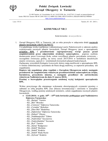 Polski Związek Łowiecki Zarząd Okręgowy w Tarnowie 33-100 Tarnów, ul. Urszulańska 16, tel. 14 6215298, fax. 14 6277411, E-mail: [email protected] konto: PKO SA Tarnów NR 44 1240 5194 1111 0000 5252 2088, NIP 8731839313, REGON 00074227900404 http://www.zopzlowtarnow.pl Tarnów, 03 - 03 - 2015 r. L.dz. 175/15 KOMUNIKAT NR 2 Koła łowieckie - w s z y s t k i e - 1. Zarząd Okręgowy PZŁ w Tarnowie, jak co roku przesyła w załączeniu druki rocznych planów łowieckich (AKTUALNE!!!). Uwzględniając ścisłą współpracę z administracją Lasów Państwowych w zakresie analizy wykonywania rocznych planów łowieckich, Zarząd Okręgowy prosi o sporządzenie projektu RPŁ i przedstawienie zaproponowanej wersji jeszcze przed zaopiniowaniem przez odpowiednie struktury samorządowe, poprzez osobiste dostarczenie przez Łowczego Koła, celem weryfikacji planów pozyskania zwierzyny szczególnie zwierzyny grubej, na nowy sezon 2015/2016 w kontekście docelowych stanów zwierzyny, ujętych w wieloletnich łowieckich planach hodowlanych. Zachęcamy wszystkich Kolegów Łowczych, którzy mają możliwość o sporządzenie RPŁ w formie elektronicznej i przesłanie do biura drogą mailową, co usprawni procedurę ich uzgadniania. Dopiero tak uzgodniony plan wspólnie z Zarządem Okręgowym należy następnie przedstawić do zaopiniowania właściwym przedstawicielom samorządowym (wójta, burmistrza, prezydenta miasta), a następnie przedłożyć do zatwierdzenia właściwym Nadleśnictwom do dnia 21 marca 2015r. Prosimy o bezwzględne przestrzeganie ustalonej wyżej kolejności sporządzenia RPŁ. Wobec powyższego dla starannego wykonania obowiązujących czynności prosimy o zabranie ze sobą projektu RPŁ oraz arkusza inwentaryzacji i stawienie w Zarządzie Okręgowym, według poniżej ustalonych terminów, celem uzgadniania rocznych planów łowieckich: 12.03.2015r. w godz. 1000 – 1500 koła łowieckie podlegające pod Nadleśnictwo Dąbrowa Tarnowska: - KŁ „Bażant” Tarnów - KŁ „Bór” Brzesko - KŁ „Cietrzew” Dąbrowa Tarnowska - KŁ „Cyranka” Bolesław - KŁ „Darz Bór” Biadoliny - KŁ „Dąbrówka” Dąbrowa Tarnowska - KŁ „Hubert” Olesno - KŁ „Naddunajeckie” Żabno - KŁ „Nadwiślan” Szczurowa - KŁ „Nadwiślańskie” Szczucin - KŁ „Ryś” Tarnów - KŁ „Sarna” Radgoszcz - KŁ „Sokół” Bochnia - KŁ „Sokół” Kraków - KŁ „Sokół” Rudy Rysie - KŁ „Sylwan” Kraków - KŁ „Szarak” Skrzynka - KŁ „Trop” Wietrzychowice 13.03.2015r. w godz. 1000 – 1500 koła łowieckie podlegające pod Nadleśnictwo Dębica, Kołaczyce - KŁ „Bażant” Brzeźnica - KŁ „Darz Bór” Tarnów - KŁ „Jarząbek” Pilzno - KŁ „Jedność” Brzesko - KŁ „Lis” Brzostek - KŁ „Łoś” Tarnów - KŁ „Odyniec” Dębica - KŁ „Ostoja” Dębica - KŁ „Szarak” Dębica - KŁ „Szarak” Szerzyny - KŁ „Trop” Dębica 16.03.2015r. w godz. 1000 – 1500 koła łowieckie podlegające pod Nadleśnictwo Brzesko - KŁ „Basior” Kraków - KŁ „Batalion” Kraków - KŁ „Bór” Oświęcim - KŁ „Cietrzew” Kraków - KŁ „Dunajec Tarnów - KŁ „Hubertus” Brzesko - KŁ „Knieja” Tarnów - KŁ „Las” Kłaj - KŁ „Łoś” Bochnia - KŁ „Modrzew” Kraków - KŁ „Rogacz” Bochnia - KŁ „Ryś” Żegocina - KŁ „Sokół” Nowy Wiśnicz - KŁ „Szarak” Tymowa 17.03.2015r. w godz. 1000 – 1500 koła łowieckie podlegające pod Nadleśnictwo Gromnik: - KŁ „Bór” Tarnów - KŁ „Dzik” Tarnów - KŁ „Hejnał” Tarnów - KŁ „Jaźwiec” Tarnów - KŁ „Jeleń” Pleśna - KŁ „Knieja” Szerzyny - KŁ „Leśnik” Gromnik - KŁ „Luty Tur” Kraków - KŁ „Melsztyn” Zakliczyn - KŁ „Podgórskie” Tarnów - KŁ „Sokół” Krynica - KŁ „Szarak” Ciężkowice - KŁ „Szarak” Gorlice - KŁ „Trop” Kraków Powyższe działania maja na celu optymalizacje pozyskania łowieckiego w nadchodzącym sezonie łowieckim. ZO zwraca uwagę, aby przy sporządzaniu rocznych planów łowieckich przestrzegać bezwzględnie zasad planowania pozyskania łowieckiego poszczególnych gatunków zwierzyny, biorąc za podstawę stan liczebności zwierzyny ustalony w bieżącej inwentaryzacji, dążąc jednocześnie do osiągnięcia docelowych wskaźników ujętych w Wieloletnich Łowieckich Planów Hodowlanych odpowiednich dla każdego obwodu. Z uwagi na sytuacje epizootyczną związana z ASF oraz pilną społeczną potrzebę ograniczenia liczebności dzików w kraju, Zarząd Główny PZŁ w porozumieniu z Głównym Lekarzem Weterynarii kieruje do wszystkich kół łowieckich na terenie których odnotowano w ostatnich dwóch latach znaczny wzrost liczebności dzików zalecenie zwiększenia planu pozyskania dzików o 15 - 20 w sezonie łowieckim 2015/16, traktując to jako nieodzowne zadanie. 2. Informujemy, iż w dniach 20 - 21 marca 2015r. w stacji badawczej OHZ PZŁ w Czempiniu organizowane jest szkolenie na strażników łowieckich. Dla kół i osób zainteresowanych szczegóły przesyłamy w załączeniu. Nadmieniamy, że ukończenie tylko szkolenia organizowanego przez Zarząd Główny PZŁ jest warunkiem pełnienia funkcji strażnika łowieckiego w kole. 3. Na mocy wypracowanego porozumienia Zarządu Głównego PZŁ z firmą ubezpieczeniową Goether S.A. istnieje możliwość zawierania dodatkowych ubezpieczeń odpowiedzialności cywilnej kół za szkody wyrządzane w płodach i uprawach rolnych. Wszystkie zainteresowane koła prosimy o zapoznanie się z warunkami ubezpieczenia, które przesyłamy w załączeniu. 4. Zarząd Okręgowy w oparciu o konsultacje z firmą skupu i przerobu dziczyzny „ Kanwil” Sp. z. o. o w Dębicy zwraca uwagę na prawidłową realizację obowiązku dołączania dokumentu oświadczenia o przeprowadzeniu oględzin tuszy i narządów wewnętrznych odstrzelonego zwierzęcia podczas przekazywania tuszy do punktu skupu. Oświadczenie to winno 