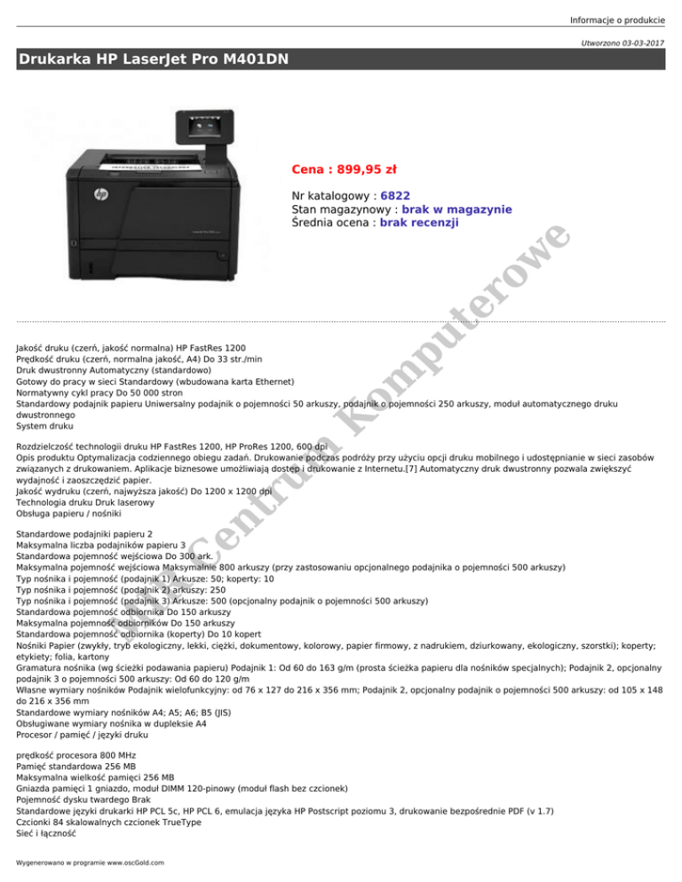 Informacje o produkcie Utworzono 03-03-2017 Drukarka HP LaserJet Pro M401DN Cena : 899,95 zł om pu te r ow e Nr katalogowy : 6822 Stan magazynowy : brak w magazynie Średnia ocena : brak recenzji K Jakość druku (czerń, jakość normalna) HP FastRes 1200 Prędkość druku (czerń, normalna jakość, A4) Do 33 str./min Druk dwustronny Automatyczny (standardowo) Gotowy do pracy w sieci Standardowy (wbudowana karta Ethernet) Normatywny cykl pracy Do 50 000 stron Standardowy podajnik papieru Uniwersalny podajnik o pojemności 50 arkuszy, podajnik o pojemności 250 arkuszy, moduł automatycznego druku dwustronnego System druku C en tr um Rozdzielczość technologii druku HP FastRes 1200, HP ProRes 1200, 600 dpi Opis produktu Optymalizacja codziennego obiegu zadań. Drukowanie podczas podróży przy użyciu opcji druku mobilnego i udostępnianie w sieci zasobów związanych z drukowaniem. Aplikacje biznesowe umożliwiają dostęp i drukowanie z Internetu.[7] Automatyczny druk dwustronny pozwala zwiększyć wydajność i zaoszczędzić papier. Jakość wydruku (czerń, najwyższa jakość) Do 1200 x 1200 dpi Technologia druku Druk laserowy Obsługa papieru / nośniki M IR Standardowe podajniki papieru 2 Maksymalna liczba podajników papieru 3 Standardowa pojemność wejściowa Do 300 ark. Maksymalna pojemność wejściowa Maksymalnie 800 arkuszy (przy zastosowaniu opcjonalnego podajnika o pojemności 500 arkuszy) Typ nośnika i pojemność (podajnik 1) Arkusze: 50; koperty: 10 Typ nośnika i pojemność (podajnik 2) arkuszy: 250 Typ nośnika i pojemność (podajnik 3) Arkusze: 500 (opcjonalny podajnik o pojemności 500 arkuszy) Standardowa pojemność odbiornika Do 150 arkuszy Maksymalna pojemność odbiorników Do 150 arkuszy Standardowa pojemność odbiornika (koperty) Do 10 kopert Nośniki Papier (zwykły, tryb ekologiczny, lekki, ciężki, dokumentowy, kolorowy, papier firmowy, z nadrukiem, dziurkowany, ekologiczny, szorstki); koperty; etykiety; folia, kartony Gramatura nośnika (wg ścieżki podawania papieru) Podajnik 1: Od 60 do 163 g/m (prosta ścieżka papieru dla nośników specjalnych); Podajnik 2, opcjonalny podajnik 3 o pojemności 500 arkuszy: Od 60 do 120 g/m Własne wymiary nośników Podajnik wielofunkcyjny: od 76 x 127 do 216 x 356 mm; Podajnik 2, opcjonalny podajnik o pojemności 500 arkuszy: od 105 x 148 do 216 x 356 mm Standardowe wymiary nośników A4; A5; A6; B5 (JIS) Obsługiwane wymiary nośnika w dupleksie A4 Procesor / pamięć / języki druku prędkość procesora 800 MHz Pamięć standardowa 256 MB Maksymalna wielkość pamięci 256 MB Gniazda pamięci 1 gniazdo, moduł DIMM 120-pinowy (moduł flash bez czcionek) Pojemność dysku twardego Brak Standardowe języki drukarki HP PCL 5c, HP PCL 6, emulacja języka HP Postscript poziomu 3, drukowanie bezpośrednie PDF (v 1.7) Czcionki 84 skalowalnych czcionek TrueType Sieć i łączność Wygenerowano w programie www.oscGold.com Standardowe podłączenia 1 port Hi-Speed USB 2.0, 1 port hosta USB; 1 port sieciowy Ethernet 10/100/1000 Base-TX; 1 port USB do druku bezpośredniego Zewnętrzne porty wejścia/wyjścia 1 port Hi-Speed USB 2.0, 1 port hosta USB; 1 port sieciowy Ethernet 10/100/1000 Base-TX Obsługiwane systemy operacyjne Pełna instalacja oprogramowania obsługiwana w systemach: Microsoft Windows 7 w wersji 32-/64-bitowej, Windows Vista w wersji 32-/64-bitowej, Windows XP w wersji 32-bitowej (z dodatkiem SP2 lub nowszym); Instalacja samych sterowników obsługiwana w systemach: Microsoft Windows Server 2008 w wersji 32-/64-bitowej, Windows Server 2003 w wersji 32-bitowej (z dodatkiem SP3 lub nowszym); Mac OS X v10.5, v10.6, v10.7; Linpus Linux: 9,4, 9,5; RED HAT Enterprise Linux: 5,0, 6,0; OpenSuSE: 11,3, 11,4; Fedora: 14, 15; Ubuntu: 10,04, 10,10, 11,04; Debian: 5,0, 6,0 i HPUX11i Minimalne wymagania systemowe Microsoft Windows 7 w wersji 32- lub 64-bitowej, Windows Vista w wersji 32- lub 64-bitowej: procesor 1 GHz 32-bitowy (x86) lub 64-bitowy (x64), 1 GB pamięci RAM (system 32-bitowy) lub 2 GB pamięci RAM (system 64-bitowy), 400 MB wolnego miejsca na dysku twardym, napęd CD/DVD-ROM lub połączenie z Internetem, port USB lub port sieciowy; Windows XP32 SP2 (wersja 32-bitowa): Procesor Pentium 233 MHz, 512 MB pamięci RAM, 400 MB miejsca na dysku twardym, napęd CD/DVD-ROM lub połączenie z Internetem, port USB lub port sieciowy Minimalne wymagania systemowe dla komputerów Macintosh Mac OS X v10.5, v10.6, v10.7; Procesor PowerPC G4, G5 lub Intel Core; Dysk twardy 500 MB; Napęd CD-ROM/DVD-ROM lub połączenie z Internetem; Port USB lub port sieciowy Pozostałe dane M IR C en tr um K om pu te r ow e Zawartość opakowania Drukarka HP LaserJet Pro 400 M401dn; Wbudowany moduł automatycznego druku dwustronnego; Sieć Ethernet 10/100/1000 Base-TX; HP 80A wkład z czarnym tonerem (wydajność ok. 2700 stron); Instrukcja instalacji, instrukcja wprowadzająca, ulotka dotycząca pomocy technicznej, informacje o gwarancji; Dokumentacja i oprogramowanie drukarki na płycie CD; Kabel zasilania Dołączone oprogramowanie Windows: Instalator/dezinstalator HP, sterownik drukarki HP PCL 6, Status Alerts, HP Update, DXP; Mac: Instalator/dezinstalator HP, sterownik HP Postscript, HP Setup Assistant, HP Utility, HP Alerts, HP Firmware Updater Zasilanie zewnętrzne Napięcie zasilania (wejściowe): 110-127 V (+/- 10%), 50/60 Hz (+/-2 Hz); 220-240 V (+/- 10%), 50/60 Hz (+/- 2 Hz) Typ zasilacza Wbudowany zasilacz Pobór mocy 570 W (drukowanie), 7,3 W (tryb gotowości), 6,2 W (tryb uśpienia), 0,1 W (wyłączone) Typowy pobór prądu (TEC): 2,08 kWh/tydz. Zarządzanie drukarką Windows: HP Device Toolbox (instalacja domyślna), SNP Alerts (minimalna instalacja sieciowa), HP Web Jetadmin (do pobrania); Mac: HP Utility Gwarancja Roczna gwarancja. Warunki gwarancji zależą od produktu, kraju i lokalnych wymogów prawnych. Usługi (Care Pack) U5Z49E - 3-letnia pomoc techniczna HP następnego dnia roboczego dotycząca sprzętu 
