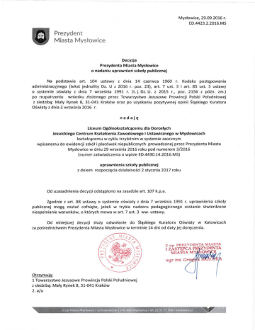 Mysłowice, 29.09.2016 r. ED.4423.2.2016.MS Prezydent Miasta Decyzja Prezydenta Miasta Mysłowice o nadaniu uprawnień szkoły publicznej Na podstawie art. 104 ustawy z dnia 14 czerwca 1960 r. Kodeks postępowania administracyjnego (tekst jednolity Dz. U z 2016 r. póz. 23), art. 7 ust. 3 i art. 85 ust. 3 ustawy o systemie oświaty z dnia 7 września 1991 r. (t. j. Dz. U. z 2015 r., póz. 2156 z późn. zm.) po rozpatrzeniu wniosku złożonego przez Towarzystwo Jezusowe Prowincji Polski Południowej z siedzibą: Mały Rynek 8, 31-041 Kraków oraz po uzyskaniu pozytywnej opinii Śląskiego Kuratora Oświaty z dnia 2 września 2016 r. nadaję Liceum Ogólnokształcącemu dla Dorosłych Jezuickiego Centrum Kształcenia Zawodowego i Ustawicznego w Mysłowicach kształcącemu w cyklu trzyletnim w systemie zaocznym wpisanemu do ewidencji szkół i placówek niepublicznych prowadzonej przez Prezydenta Miasta Mysłowice w dniu 29 września 2016 roku pod numerem 3/2016 (numer zaświadczenia o wpisie ED.4430.14.2016.MS) uprawnienia szkoły publicznej z dniem rozpoczęcia działalności 2 stycznia 2017 roku Od uzasadnienia decyzji odstąpiono na zasadzie art. 107 k.p.a. Zgodnie z art. 88 ustawy o systemie oświaty z dnia 7 września 1991 r. uprawnienia szkoły publicznej mogą zostać cofnięte, jeżeli w trybie nadzoru pedagogicznego zostanie stwierdzone niespełnianie warunków, o których mowa w art. 7 ust. 3 ww. ustawy. Od niniejszej decyzji służy odwołanie do Śląskiego Kuratora Oświaty w Katowicach za pośrednictwem Prezydenta Miasta Mysłowice w terminie 14 dni od daty jej doręczenia. Z up. PREZYDENTA MIASTA l ZASTĘPCA PREZYDENTA MIASTA Mv*r mgr inź. Otrzymują: l Towarzystwo Jezusowe Prowincja Polski Południowej z siedzibą: Mały Rynek 8, 31-041 Kraków 2. a/a Mysłowice, 29.09.2016 r. ED.4430.14.2016.MS Prezydent ZAŚWIADCZENIE o wpisie do ewidencji szkół i placówek niepublicznych Na podstawie art. 82 ust. 5 ustawy o systemie oświaty z dnia 7 września 1991 r. (t. j. Dz. U. z 2015 r., póz. 2156 z późn. zm.) dokonuję w ewidencji szkół i placówek niepublicznych prowadzonej przez Prezydenta Miasta Mysłowice pod numerem 3/2016 następującego wpisu : 1. Typ i rodzaj szkoły: trzyletnie liceum ogólnokształcące dla dorosłych, kształcące w systemie zaocznym 2. Nazwa szkoły: Liceum Ogólnokształcące dla Dorosłych Jezuickiego Centrum Kształcenia Zawodowego i Ustawicznego w Mysłowicach 3. Adres szkoły: ul. Powstańców 19, 41-400 Mysłowice 4. Osoba prowadząca szkołę : Towarzystwo Jezusowe Prowincja Polski Południowej z siedzibą: Mały Rynek 8, 31-041 Kraków 5. Szkoła posiada uprawnienia szkoły publicznej nadane Decyzją Prezydenta Miasta Mysłowice nr ED.4423.2.2016.MS z dnia 28.09.2016 roku. 6. Data rozpoczęcia działalności: 02.01.2017 r. POUCZENIE Zgodnie z art. 82 ust. 5 ustawy o systemie oświaty - osoba prowadząca placówkę jest obowiązana zgłosić w ciągu 14 dni zmiany w danych zawartych w zagłoszeniu powstałe po wpisie do ewidencji. Osoba prowadząca placówkę ma obowiązek dostosować się do przepisów ustawy o systemie oświaty oraz spełnić warunki przewidziane dla uruchomienia danego rodzaju działalności szkoleniowej, o ile wynikają one z odrębnych przepisów. 2 up. PREZYDENTA MIASTA I ZASTĘPCA PREZYDENTA MIASTA MY£ mgr inL Otrzymują: X * 1. Towarzystwo Jezusowe Prowincja Polski Południowej 3,31-041 Kraków 27§ląski Kurator Oświaty 3. Urząd Skarbowy 4. a/a