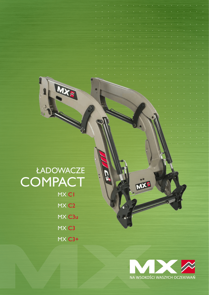 Ładowacze COMPACT MX C1 MX C2 MX C3u MX C3 MX C3+ Nie boimy się innowacji – tak w oferowanym przez nas osprzęcie, jak w naszych działaniach, w naszych usługach, czy w naszych produktach. Pragniemy bowiem, wspólnie z naszymi dystrybutorami, zachęcić Państwa do skorzystania na wyjątkowości naszej gamy spełniającej wszelkie Państwa oczekiwania. Jesteśmy otwarci na Państwa potrzeby i oczekiwania, analizujemy je na bieżąco i odpowiadamy na nie oferując rozwiązania w 100% sprawdzone i wydajne, zapewniając obsługę na najwyższym poziomie. Nasza innowacyjność daje nam oraz naszym dystrybutorom wyjątkową pozycję na rynku. Nasze pomysły są wyjątkowe, opracowane przez naszych specjalistów z myślą o Państwa potrzebach. Umożliwiamy w ten sposób naszym dealerom spełnienie Państwa oczekiwań dzięki wachlarzowi rozwiązań ściśle dostosowanych do używanego przez Państwa ciągnika. Zapraszamy do sprawdzenia osobiście u naszych autoryzowanych dealerów. Jesteśmy firmą rozpoznawalną. Zobowiązujemy się do dotrzymywania naszych zobowiązań i zapewnienia szybkiej reakcji, wydajności i rzetelności. Zobowiązanie to przyświeca wszystkim naszym zespołom w myśl wspólnej 2 dbałości o trwałą współpracę z naszymi klientami. Gdy zaistnieje jakiś problem, za pośrednictwem naszych dystrybutorów zajmujemy się nim najszybciej jak to możliwe. Jesteśmy również otwarci na wszelkie Państwa sugestie. W ścisłej współpracy z siecią licencjonowanych dealerów, zapewniamy płynność informacji – wspólnie skupiamy się na Państwa potrzebach, pragnąc zaoferować rozwiązanie na najwyższym poziomie. Zgodnie z filozofią firmy tworzymy produkty i oferujemy usługi dostosowane do wszelkich oczekiwań i zapewniające 100% satysfakcji ze strony klienta. Nasza odwaga, odpowiedzialność i chęć do współpracy to nasze atuty na drodze do realizacji tego celu. Nasze zobowiązanie – konkretnymi działaniami i rozwiązaniami przemienić naszą wiedzę w Państwa korzyść. Na wysokości waszych oczekiwań www.m-x.eu 3 w y ł ą c zn i e w m x POZIOMOWANIE CLEAR-link system Poziomowanie mechaniczne CLEAR-LINK system obejmuje całkowicie górną część ładowacza aż po siłownik wychyłu dla maksymalnego zintegrowania i optymalnej widoczności. CLEAR-LINK System zawiera mniej przegubów niż klasyczne poziomowanie, dzięki czemu zmniejszone zostają koszty utrzymania, a zwiększona – żywotność produktu. NA WSOKOŚCI WASZYCH OCZEKIWAŃ błyskawiczne zaczepianie/ odczepianie ładowacz/ciągnik Zaczepianie odbywa się za pomocą mechanizmu prostego, pewnego, błyskawicznego i ergonomicznego. Rama wsporcza została specjalnie zaprojektowana do każdego rodzaju ciągnika. Zapewnia to poręczność i ułatwia bieżącą konserwację. najwyższa wydajność, estetyczny design w służbie trwałości Wskaźnik poziomu* Pewność manewrowania Obsługa ładowacza jest prosta i pewna dzięki doskonałej widoczności. Szybkość manewrowania Mechanizm ryglowania za pomocą trzpienia jest prosty i skuteczny. Zasuwka bezpieczeństwa* umożliwia zablokowanie zaryglowanego trzpienia. System ten zastępuje zwykle stosowaną zawleczkę. Ułatwione podłączenie 3. funkcji zintegrowana hydraulika Przewody hydrauliczne są w pełni zintegrowane z ramą dla całkowitej ochrony przed uszkodzeniami mechanicznymi. optymalna maks. wysokość Jedną z głównych zalet ładowaczy MX COMPACT są niewielkie rozmiary zestawu ciągnik-ładowacz przy jednoczesnym umożliwieniu łatwego wysypywania materiałów na przyczepę lub prostego składowania palet na wysokość. zaczep automatyczny ładowacz/osprzęt* Dzięki czujnikowi odległości, osprzęt rygluje się na ramie nośnej, gdy tylko znajdzie się w odpowiednim położeniu – bez opuszczania kabiny ciągnika. Odryglowanie odbywa się w prosty sposób, za pomocą wygodnie położonej dźwigni z lewej strony. Zoptymalizowane napełnianie Dzięki kątowi nabierania przy podłożu powyżej 45°, osprzęt jest zawsze właściwie wypełniony. Zapewnia to wysoką wydajność. 4 stopy parkingowe łatwo dostępne Schowane w praktyczny sposób pod ramieniem ładowacza, odznaczają się bardzo prostą obsługą. *W zależności od modelu ciągnika (tabelka na str. 12–13) 5 WIĘKSZA WYDAJNOŚĆ, WYGODA I BEZPIECZEŃSTWO OSPRZĘTU MX JOYSTICK WIELOFUNKCYJNY Jako profesjonalne narzędzie sterujące, układ składa się z nowoczesnego, niezależnego rozdzielacza hydraulicznego i joysticka znajdującego się idealnie pod ręką. Umożliwia ono połączenie nabierania osprzętu z podnoszeniem ładowacza, albo dostosowanie pozycji osprzętu podczas opuszczania. Wszystkie te czynności są wykonywane łatwo, jedną ręką. 1- Rozdzielacz ze sterowaniem bezpośrednim (w ładowaczach C1 i C2) 2- Rozdzielacz ze sterowaniem linkami (w ładowaczach C2, C3u, C3 i C3+) 1 2 3. funkcja 3. funkcja jest wymagana w osprzętach o zasilaniu hydraulicznym. Jest łatwo dostępna, podłącza się ją błyskawicznie. Błyskawiczne połączenie ładowacz/osprzęt* Mocny, niezawodny i łatwy w obsłudze, umożliwiający proste połączenie dodatkowej złączki hydraulicznej nawet pod ciśnieniem. Amortyzator drgań* Dla Państwa wygody wyeliminowane zostają wszelkie wstrząsy i podskoki ładowacza spowodowane szybką jazdą po nierównym terenie. Zabezpieczenie podnoszenia/wychyłu Zabezpieczenie to jest obowiązkowe, jeśli w trakcie pracy z ładunkiem ktoś przebywa w jego pobliżu. Zgodnie z normą EN 12525-A2 2010, umożliwia ono utrzymanie ładunku na wypadek zerwania przewodu hydraulicznego dzięki zaworom bezpieczeństwa umieszczonym na siłownikach podnoszenia i wychyłu. ładowacz MX w kolorze Państwa ciągnika Dla całkowitej integracji ładowacza z ciągnikiem, MX proponuje malowanie go w dowolnie wybranym przez Państwa kolorze. 6 *z wyjątkiem ładowaczy C1 i C2 7 wyłącznie w mx ładowacze i podnośniki kompatybilne w 100% Rama, joystick i