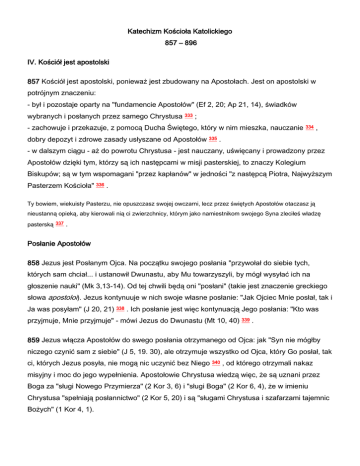 Katechizm Kościoła Katolickiego 857 – 896 IV. Kościół jest apostolski 857 Kościół jest apostolski, ponieważ jest zbudowany na Apostołach. Jest on apostolski w potrójnym znaczeniu: - był i pozostaje oparty na "fundamencie Apostołów" (Ef 2, 20; Ap 21, 14), świadków wybranych i posłanych przez samego Chrystusa 333 ; - zachowuje i przekazuje, z pomocą Ducha Świętego, który w nim mieszka, nauczanie 334 , dobry depozyt i zdrowe zasady usłyszane od Apostołów 335 . - w dalszym ciągu - aż do powrotu Chrystusa - jest nauczany, uświęcany i prowadzony przez Apostołów dzięki tym, którzy są ich następcami w misji pasterskiej, to znaczy Kolegium Biskupów; są w tym wspomagani "przez kapłanów" w jedności "z następcą Piotra, Najwyższym Pasterzem Kościoła" 336 . Ty bowiem, wiekuisty Pasterzu, nie opuszczasz swojej owczarni, lecz przez świętych Apostołów otaczasz ją nieustanną opieką, aby kierowali nią ci zwierzchnicy, którym jako namiestnikom swojego Syna zleciłeś władzę pasterską 337 . Posłanie Apostołów 858 Jezus jest Posłanym Ojca. Na początku swojego posłania "przywołał do siebie tych, których sam chciał... i ustanowił Dwunastu, aby Mu towarzyszyli, by mógł wysyłać ich na głoszenie nauki" (Mk 3,13-14). Od tej chwili będą oni "posłani" (takie jest znaczenie greckiego słowa apostoloi). Jezus kontynuuje w nich swoje własne posłanie: "Jak Ojciec Mnie posłał, tak i Ja was posyłam" (J 20, 21) 338 . Ich posłanie jest więc kontynuacją Jego posłania: "Kto was przyjmuje, Mnie przyjmuje" - mówi Jezus do Dwunastu (Mt 10, 40) 339 . 859 Jezus włącza Apostołów do swego posłania otrzymanego od Ojca: jak "Syn nie mógłby niczego czynić sam z siebie" (J 5, 19. 30), ale otrzymuje wszystko od Ojca, który Go posłał, tak ci, których Jezus posyła, nie mogą nic uczynić bez Niego 340 , od którego otrzymali nakaz misyjny i moc do jego wypełnienia. Apostołowie Chrystusa wiedzą więc, że są uznani przez Boga za "sługi Nowego Przymierza" (2 Kor 3, 6) i "sługi Boga" (2 Kor 6, 4), że w imieniu Chrystusa "spełniają posłannictwo" (2 Kor 5, 20) i są "sługami Chrystusa i szafarzami tajemnic Bożych" (1 Kor 4, 1). 860 W misji Apostołów jest pewien element nieprzekazywalny: są oni wybranymi świadkami Zmartwychwstania i fundamentami Kościoła. Jest jednak także pewien element stały ich misji. Chrystus obiecał im, że pozostanie z nimi aż do skończenia świata 341 . "Boskie posłannictwo, powierzone przez Chrystusa Apostołom, trwać będzie do końca wieków, ponieważ Ewangelia, którą mają przekazywać, jest dla Kościoła po wszystkie czasy źródłem całego jego życia. Dlatego... Apostołowie... zatroszczyli się o to, by ustanowić swych następców" 342 . Biskupi - następcy Apostołów 861 "Aby powierzona im misja była kontynuowana po ich śmierci, bezpośrednim swoim współpracownikom przekazali, jak w testamencie, zadanie prowadzenia dalej i umacniania rozpoczętego przez siebie dzieła, zalecając im czuwanie nad całą trzodą, w której Duch Święty ich umieścił, aby byli pasterzami Kościoła Bożego. Ustanowili więc takich mężów, a następnie zarządzili, aby gdy tamci umrą, posługiwanie ich przejęli inni doświadczeni mężowie" 343 . 862 "Jak więc trwa misja (munus) powierzona przez Pana indywidualnie Piotrowi, pierwszemu z Apostołów, i ma być przekazywana jego następcom, tak trwa apostolska misja pasterzowania w Kościele, aby była nieprzerwanie sprawowana przez święty stan biskupów". Dlatego Kościół naucza, że "biskupi z ustanowienia Bożego stali się następcami Apostołów jako pasterze Kościoła; kto więc ich słucha, słucha Chrystusa, a kto nimi gardzi, gardzi Chrystusem i Tym, który posłał Chrystusa" 344 . Apostolstwo 863 Cały Kościół jest apostolski, ponieważ pozostaje, przez następców św. 900 Piotra i Apostołów, w komunii wiary i życia ze swoim początkiem. Cały Kościół jest apostolski, ponieważ jest "posłany" na cały świat. Wszyscy członkowie Kościoła, choć na różne sposoby, uczestniczą w tym posłaniu. "Powołanie chrześcijańskie jest również ze swojej natury powołaniem do apostolstwa". "Apostolstwem" nazywa się "wszelką działalność Ciała Mistycznego", która zmierza do rozszerzenia "Królestwa Chrystusa po całej ziemi" 345 . 864 "Chrystus posłany przez Ojca jest źródłem i początkiem całego apostolstwa w Kościele", jest więc oczywiste, że skuteczność apostolstwa zarówno tych, którzy zostali wyświęceni, jak i świeckich, zależy od ich żywego zjednoczenia z Chrystusem 346 . Stosownie do powołań, wymagań czasów i darów Ducha Świętego apostolstwo przyjmuje bardzo zróżnicowane formy. Zawsze jednak miłość, czerpana przede wszystkim z Eucharystii, "jest jakby duszą całego apostolstwa" 347 . 865 Kościół jest jeden, święty, powszechny i apostolski w swojej głębokiej i ostatecznej tożsamości, ponieważ już w nim istnieje i wypełni się na końcu czasów "Królestwo niebieskie", "Królestwo Boże" 348 , które przyszło w Osobie Chrystusa i wzrasta w sposób tajemniczy w sercach tych, którzy są w Niego wszczepieni, aż do jego eschatologicznego ukazania się w całej pełni. Wówczas wszyscy ludzie odkupieni przez Niego, uczynieni w Nim "świętymi i nieskalanymi przed Jego obliczem w miłości" 349 , zostaną zgromadzeni jako jedyny Lud Boży, "Małżonka Baranka" (Ap 21, 9), "Miasto święte... zstępujące z nieba od Boga, mające chwałę Boga" (Ap 21, 10-11); "a mur Miasta ma dwanaście warstw fundamentu, a na nich dwanaście imion dwunastu Apostołów Baranka" (Ap 21, 14). W skrócie 866 Kościół jest "jeden": ma jednego Pana, wyznaje jedną wiarę, rodzi się z jednego chrztu, tworzy jedno Ciało, jest ożywiany przez jednego Ducha ze względu na jedną nadzieję 350 , u której kresu zostaną przezwyciężone wszystkie podziały. 867 Kościół jest "święty": jego twórc