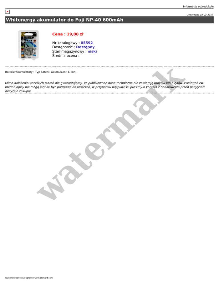 Informacje o produkcie Utworzono 03-03-2017 Whitenergy akumulator do Fuji NP-40 600mAh Cena : 19,00 zł Nr katalogowy : 05592 Dostępność : Dostępny Stan magazynowy : niski Średnia ocena : er m ar k Baterie/Akumulatory ; Typ baterii: Akumulator, Li-Ion; w at Mimo dołożenia wszelkich starań nie gwarantujemy, że publikowane dane techniczne nie zawierają braków lub błędów. Ponieważ ew. błędne opisy nie mogą jednak być podstawą do roszczeń, w przypadku wątpliwości prosimy o kontakt z handlowcem przed podjęciem decyzji o zakupie. Wygenerowano w programie www.oscGold.com